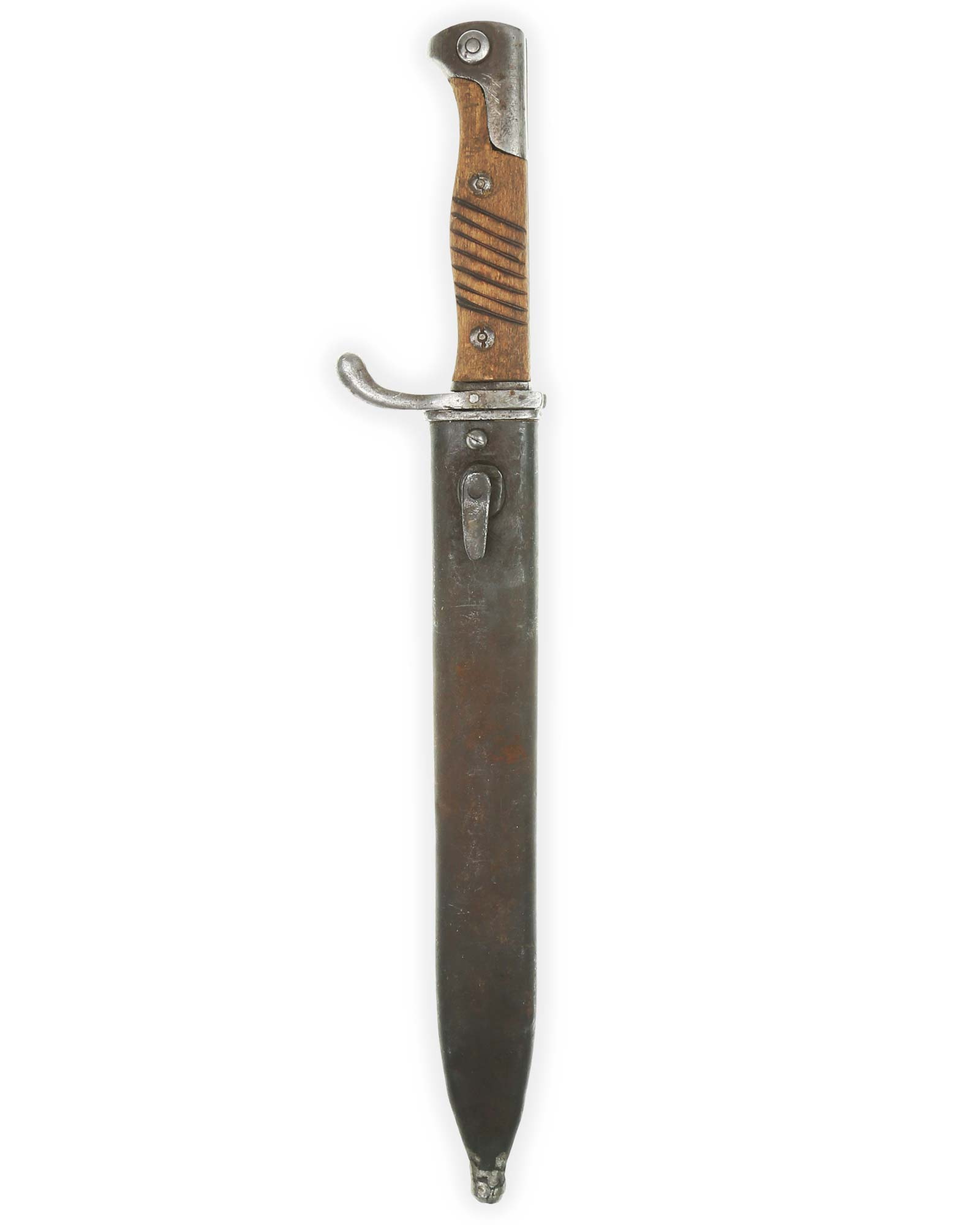 This Prussian Bayonet with the manufacturer: Waffenfabrik Mauser A.G. Oberndorf. This is in EXC+ condition. The push button attachment works well. This is a 41.2 cm long bayonet. Handle with two wooden grip scales, screwed twice, sheet steel sheath.