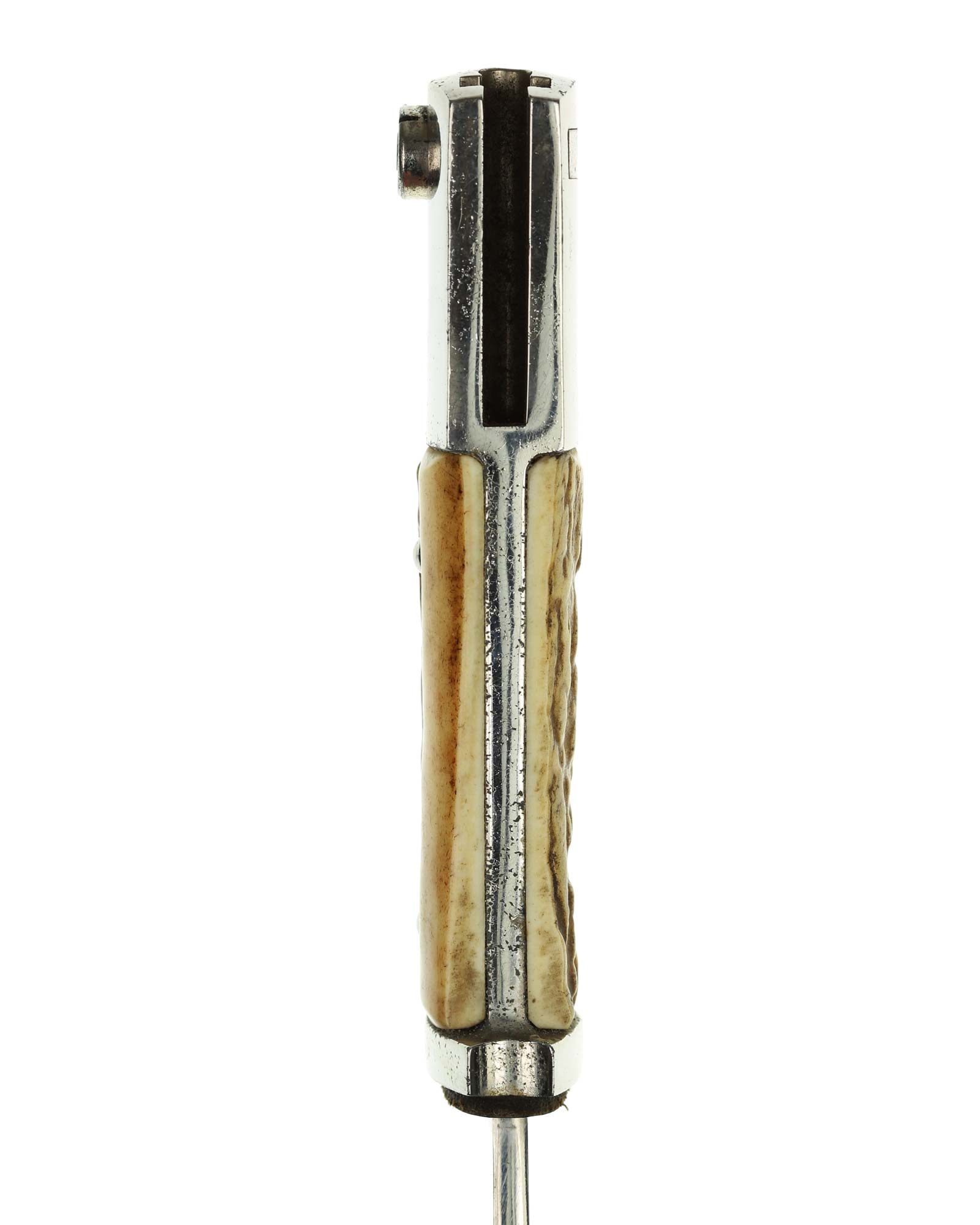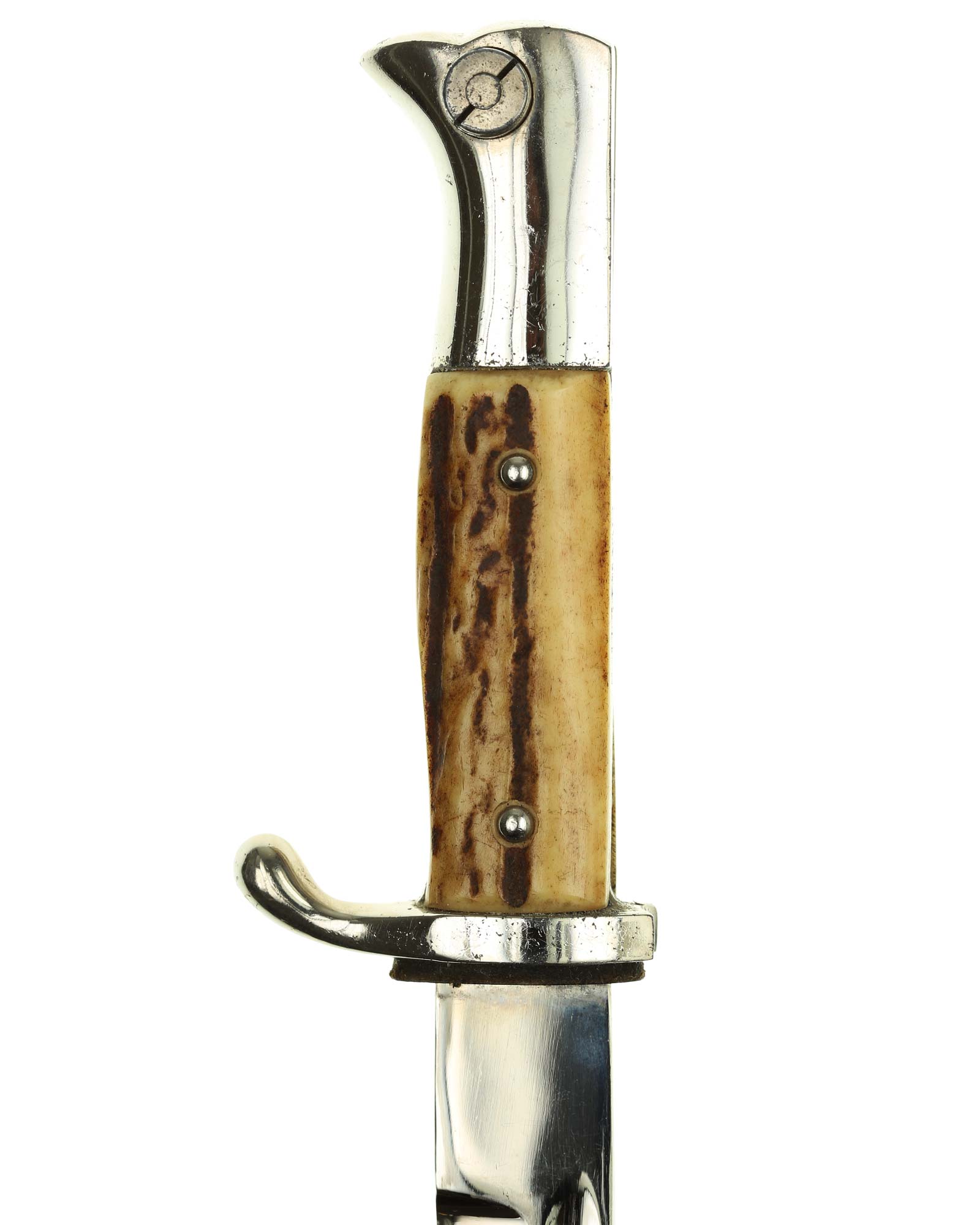Grip: The stag grip plates on this piece are real beauties, being cut to fit perfectly. They have a very pleasing brown coloration and fine grains. The edges of the plates have toned to a mellow golden color. The plates are retained by offset rivets and spanners. The rivets retain all of their head plating. This Short Bayonet has a fine, nickel-plated hilt. The plating appears to be 100% intact throughout and looks good. The mortise button and lock work well, and the original red felt insert is present in the rifle slot.
