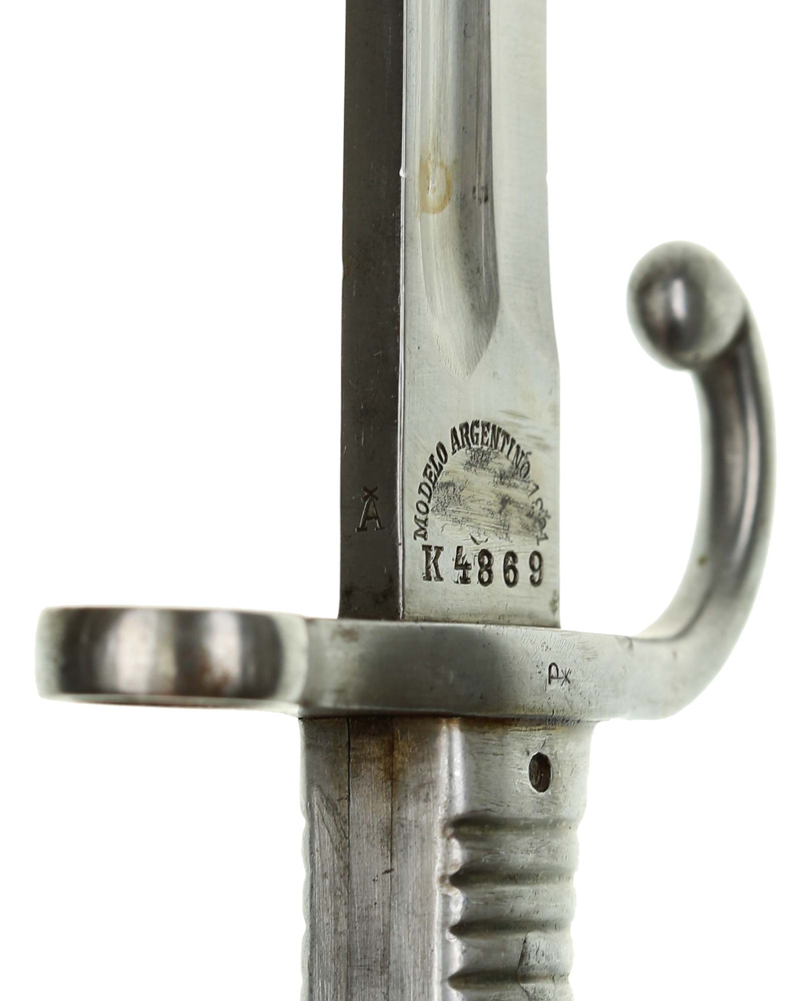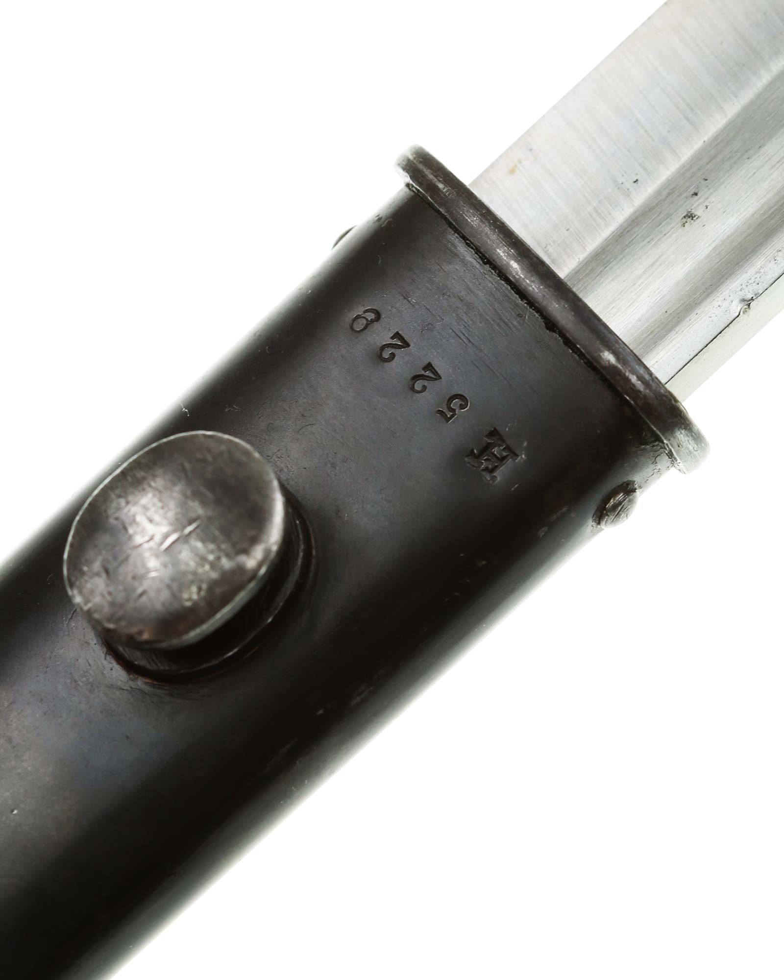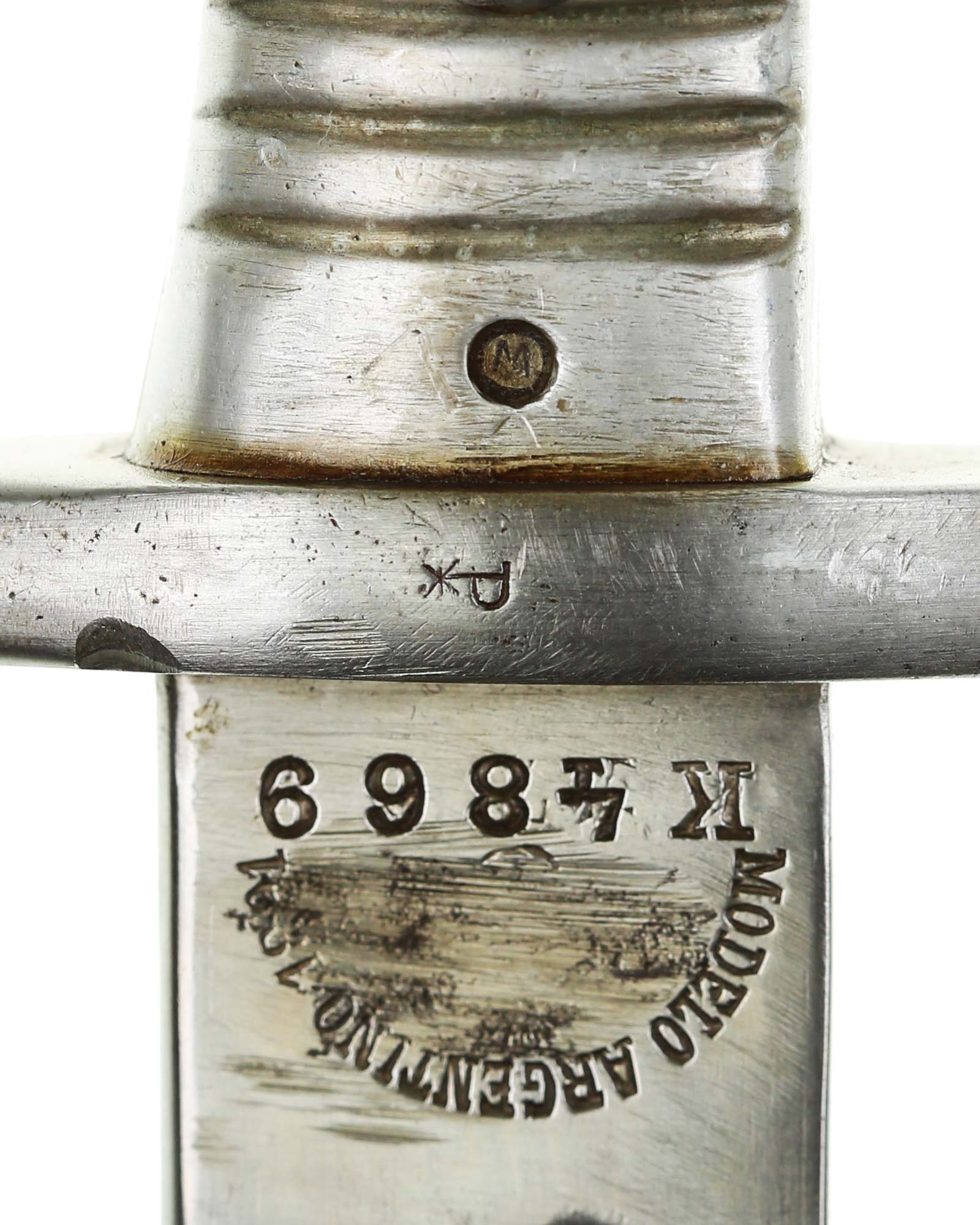 Modelo Argentino 1909 Mauser Sword Bayonet by Weyersberg Kirschbaum Solingen in EXC++ condition. Steel crossguard, and hooked "blade-breaker" quillon. The latching mechanism is of the push-button type. The blades is single-edged, and fullered on both sides. The blade is stamped - on the ricasso - with Weyersberg, Kirschbaum & Cie Solingen on one side, on the other is the Argentine Crest (this is usually ground off when released from the arsenal as surplus wares) and Modelo Argentino 1891 and Number K4869. The scabbards is of sheet-rolled steel and dark "blued" finish, stamped H5229.