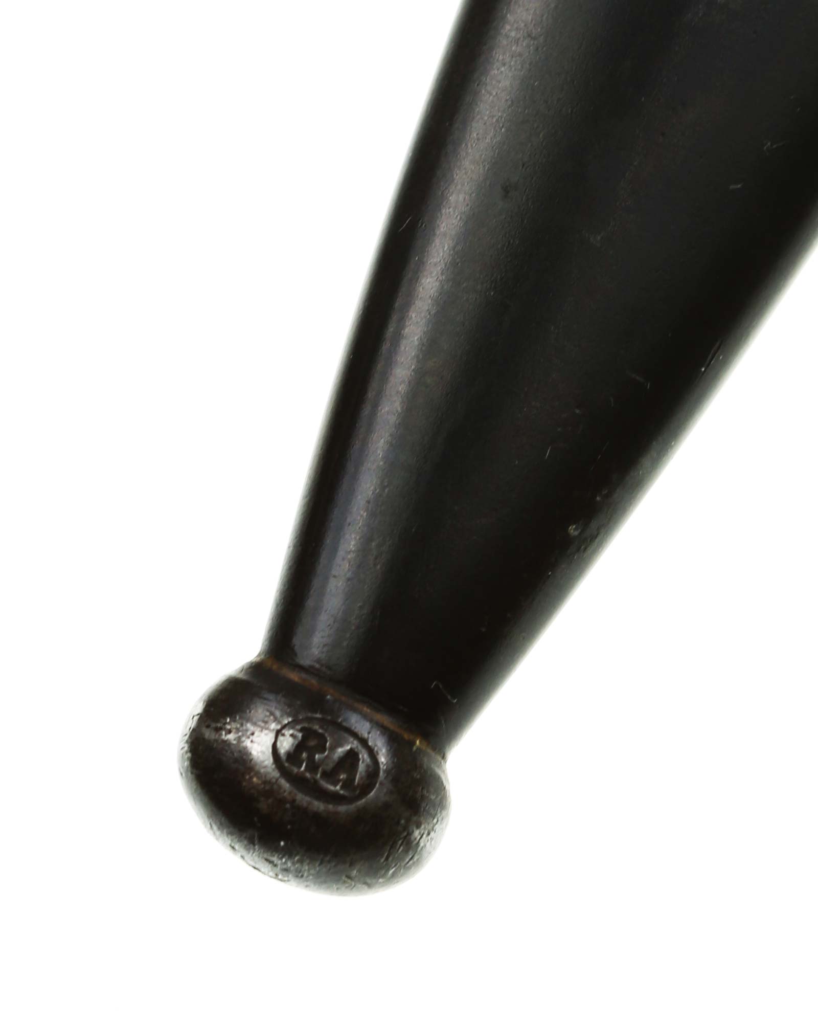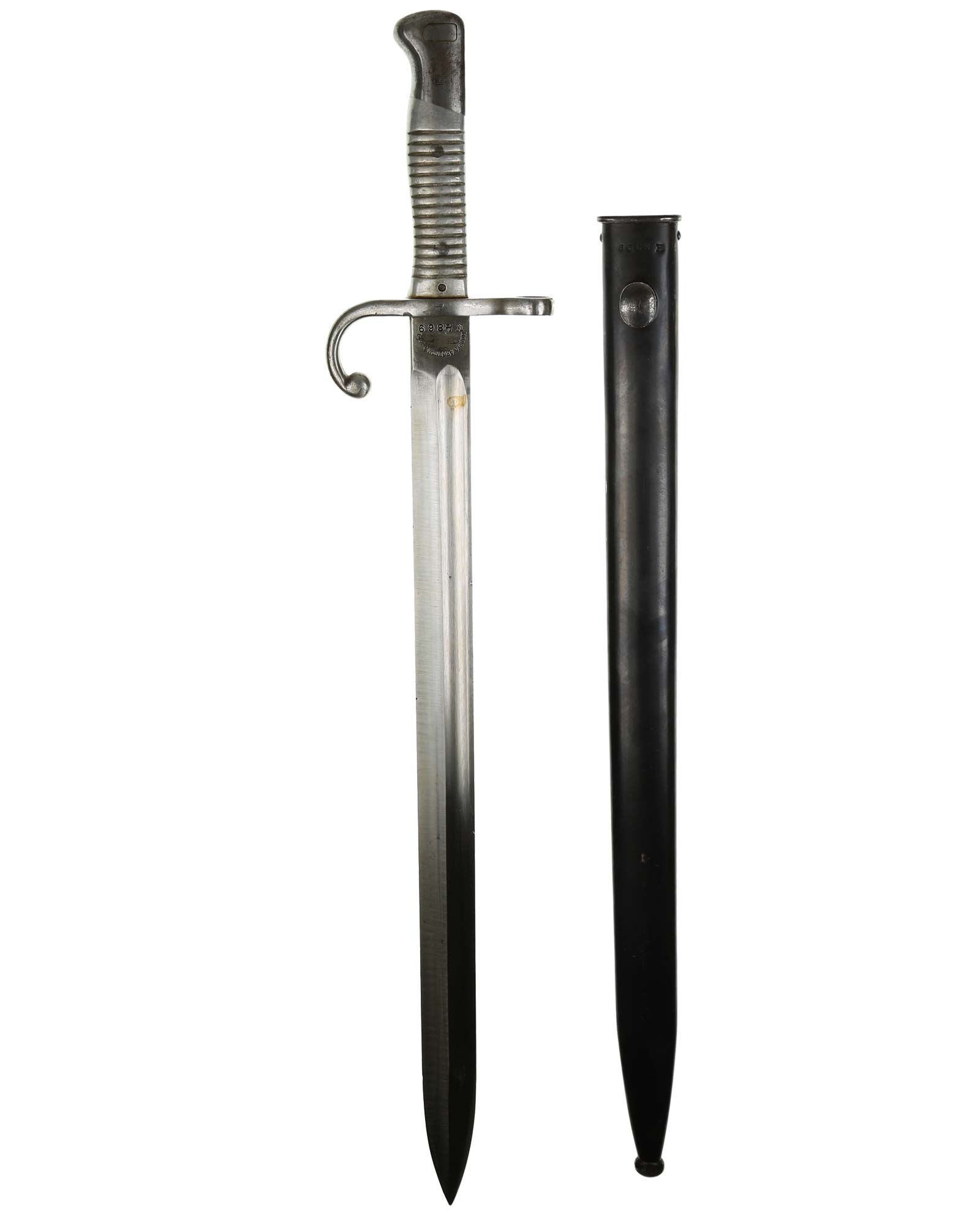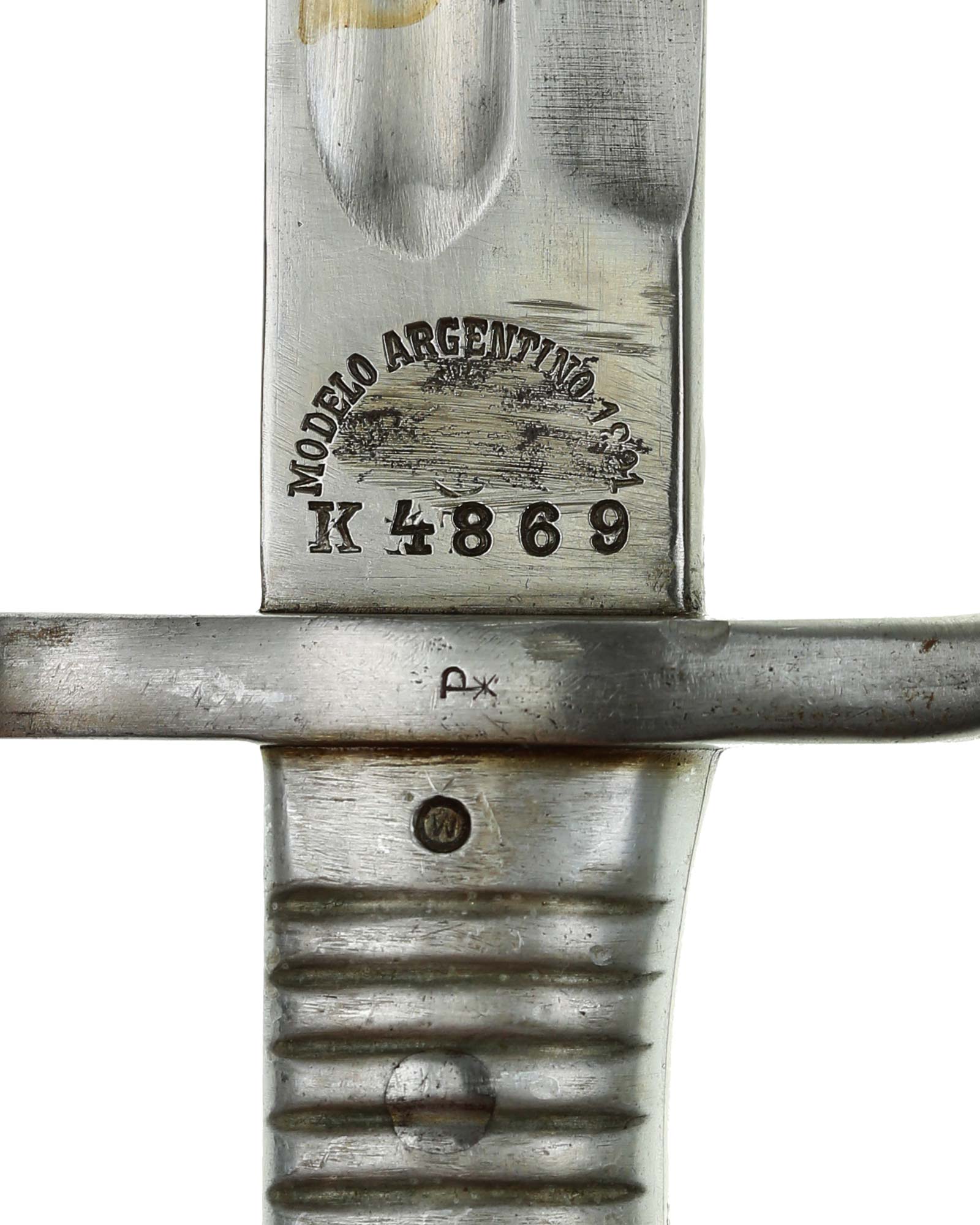 Modelo Argentino 1909 Mauser Sword Bayonet by Weyersberg Kirschbaum Solingen in EXC++ condition. Steel crossguard, and hooked "blade-breaker" quillon. The latching mechanism is of the push-button type. The blades is single-edged, and fullered on both sides. The blade is stamped - on the ricasso - with Weyersberg, Kirschbaum & Cie Solingen on one side, on the other is the Argentine Crest (this is usually ground off when released from the arsenal as surplus wares) and Modelo Argentino 1891 and Number K4869. The scabbards is of sheet-rolled steel and dark "blued" finish, stamped H5229.