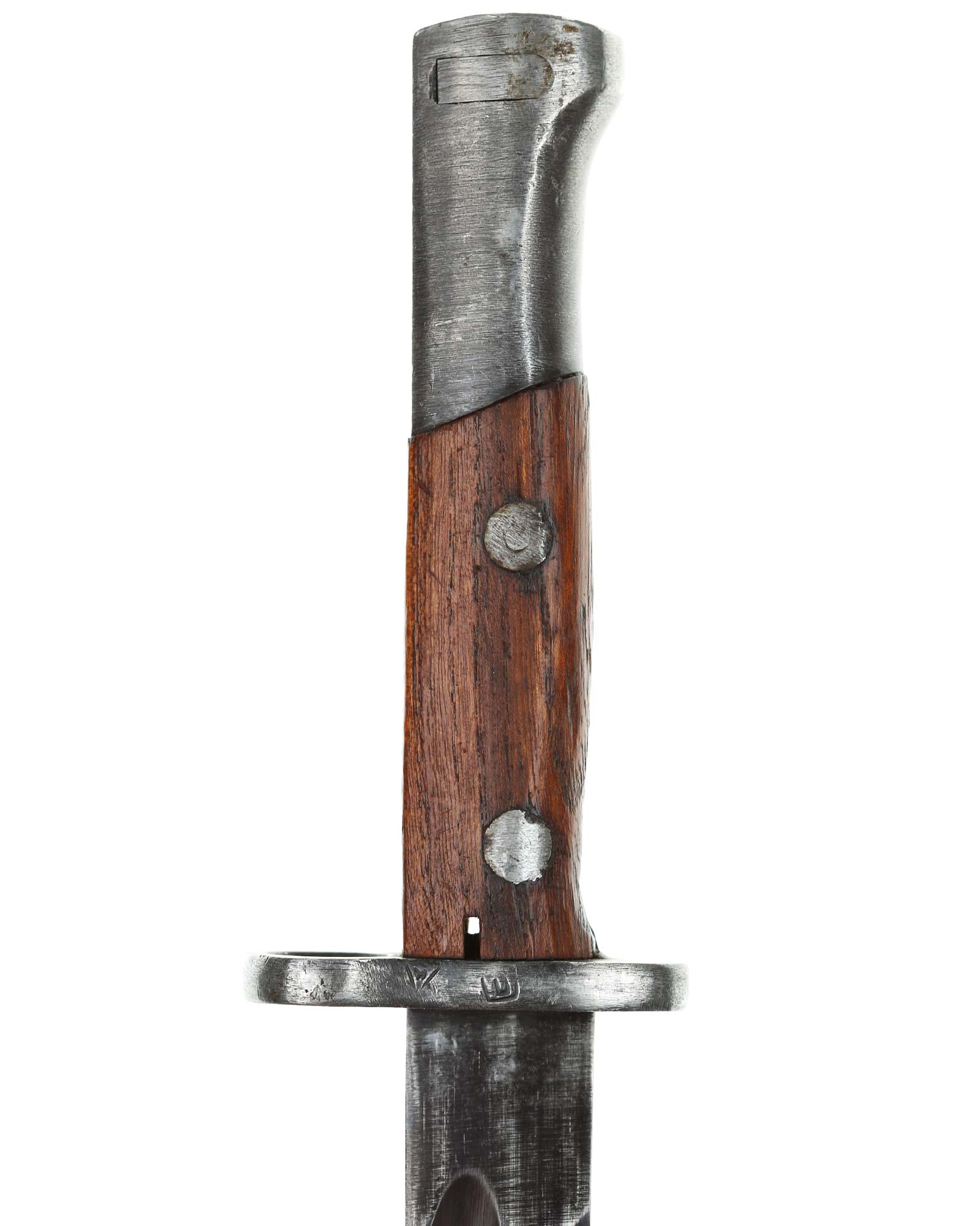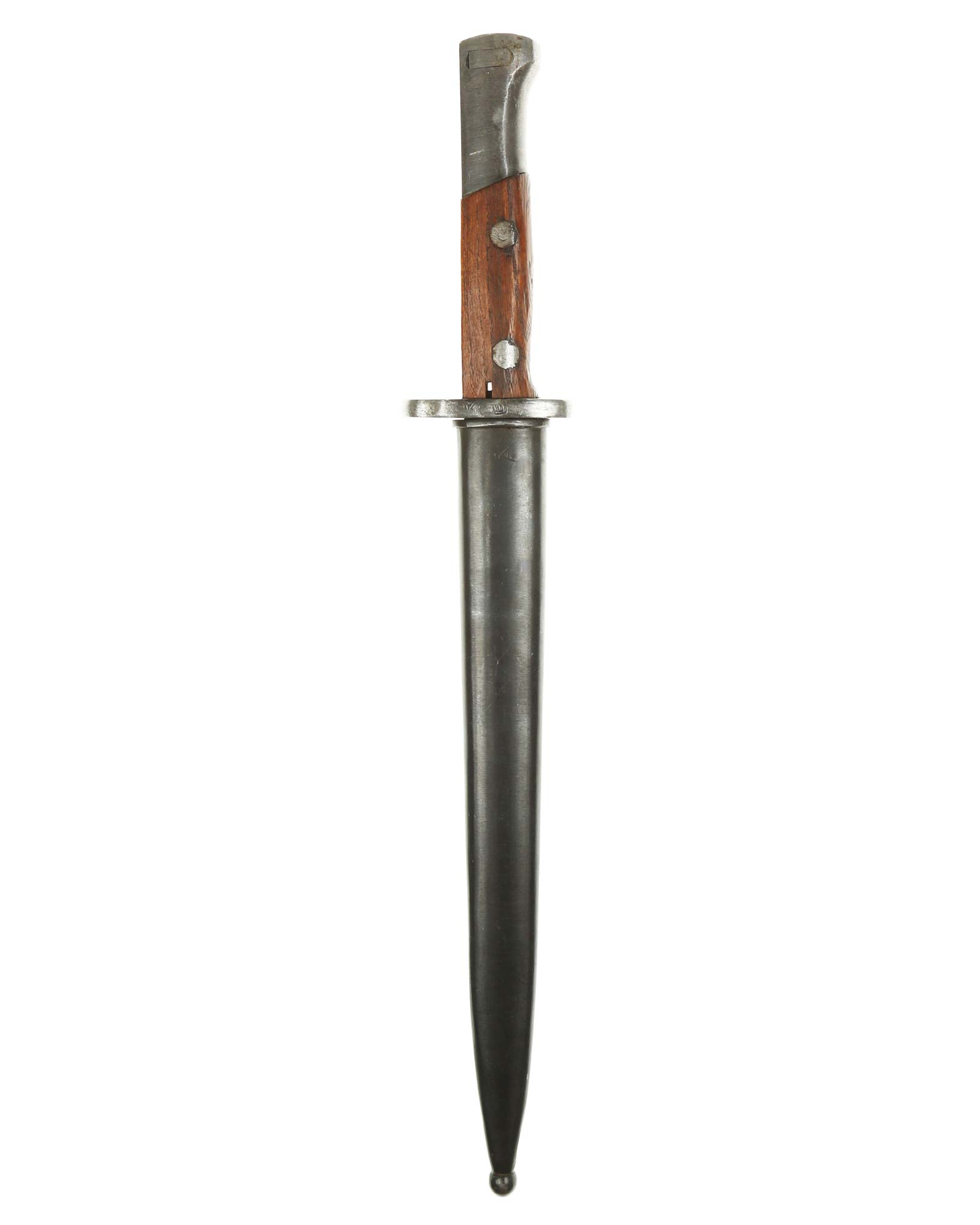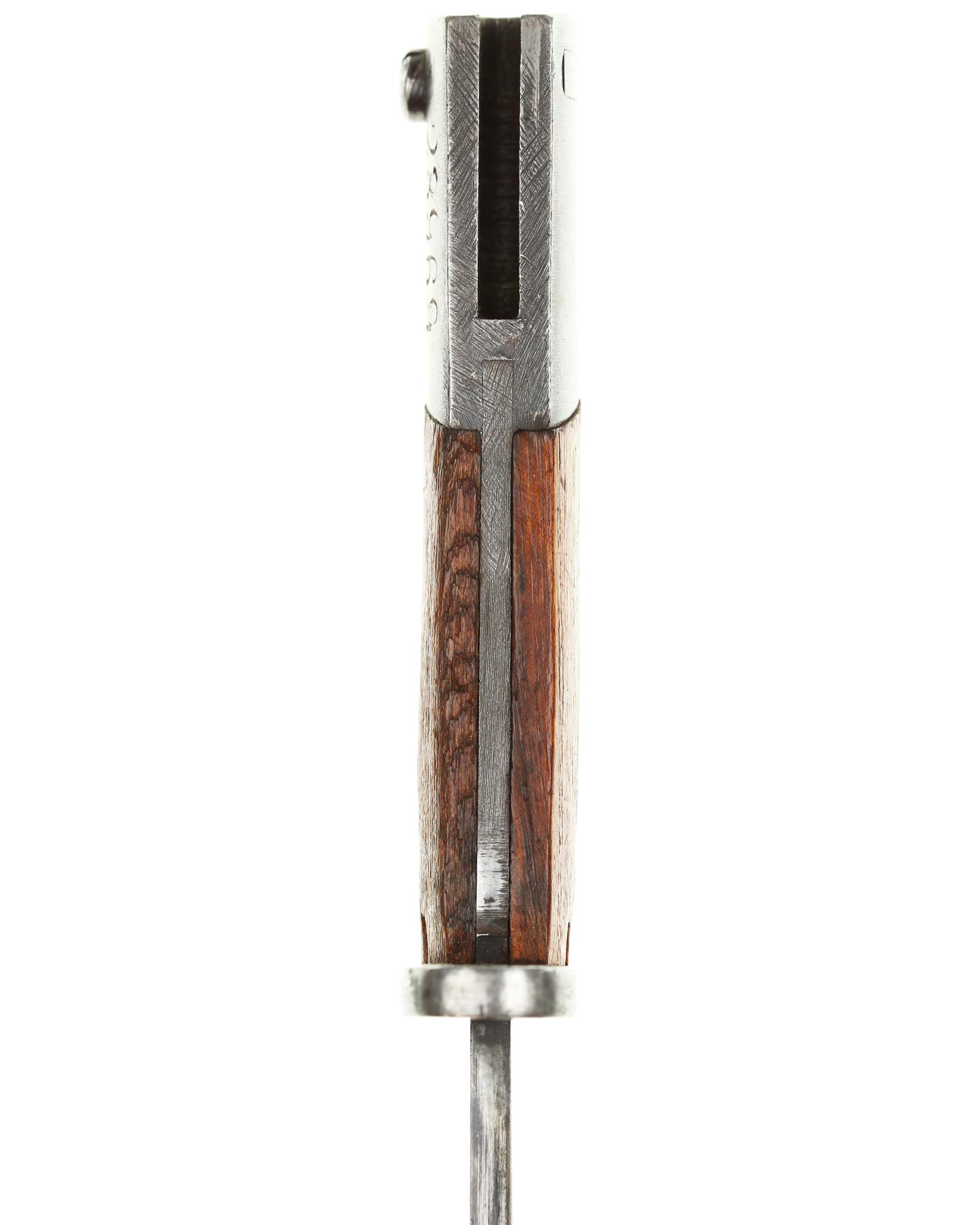 Yugoslavian Model 1948 Knife bayonet for use with the 8 mm Mauser rifle. The M1948 bayonet was a short version of the pre-War M1924 bayonet. The knife bayonet with number, the blued steel blade is 250 mm with makers mark ПРЕДУЗЕЋЕ 44. Grip and scabbard with number #23969, 3337.