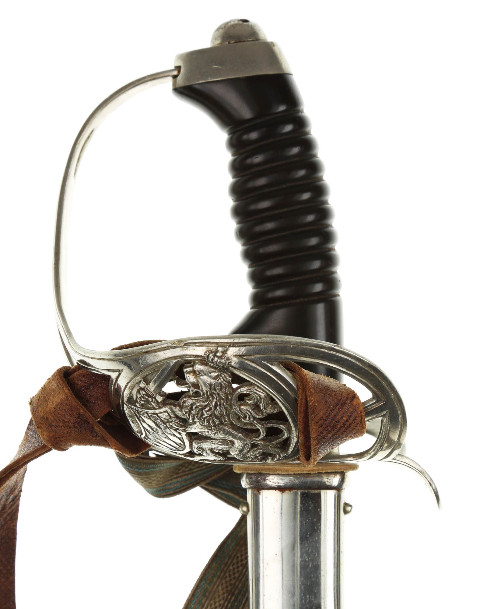 Grip: The grip of the sword is the traditional black Bakelite, with ribs, and having no wire wrap. The nickel is in fine condition throughout this hilt. The hilt is in the traditional Model '89 Cavalry design. It is of all nickel, and has a stationary basket featuring a Bavarian lion standing on is hind legs, holding a sword in one paw and the checkered seal of Bavaria in the other. The basket is all pierced. The original portepee remains wrapped about the hilt of this degen. It is of gold bullion with dual lines on the straps. The inside of the strapping is of white felt which remains in excellent condition. The troddel shows minor traces of fraying at the area that emerges from the knot. The lower stem is the flat type, and the acorn shaped ball is of gold bullion.