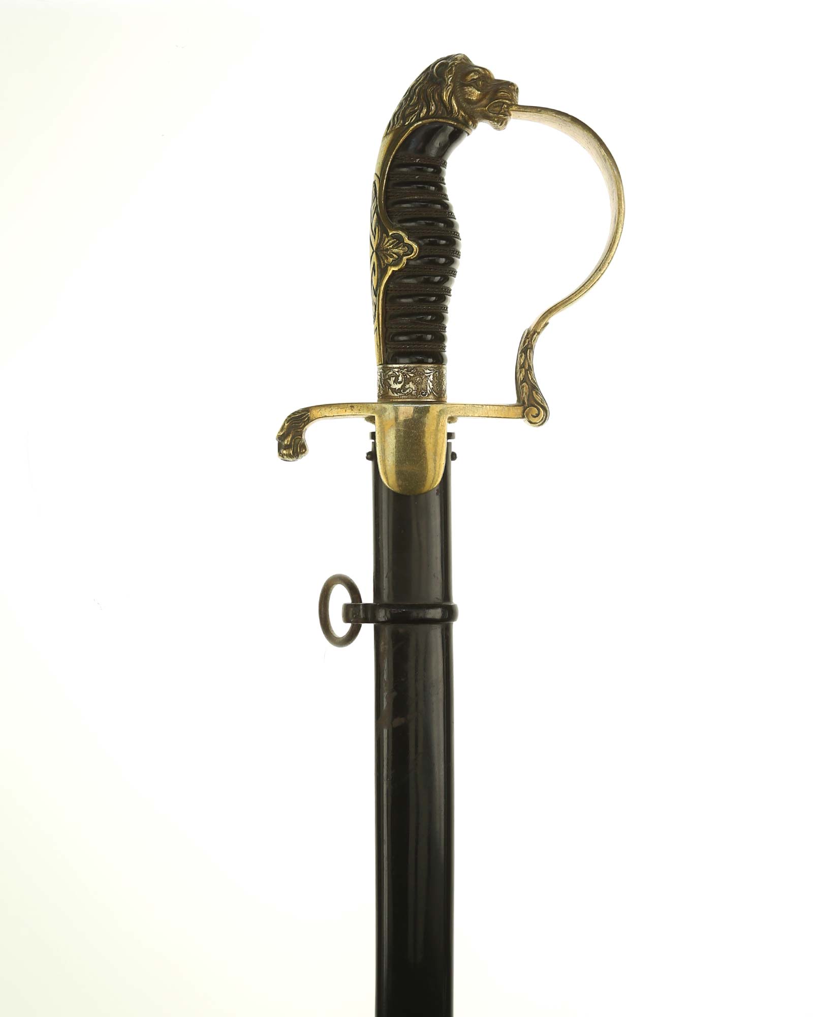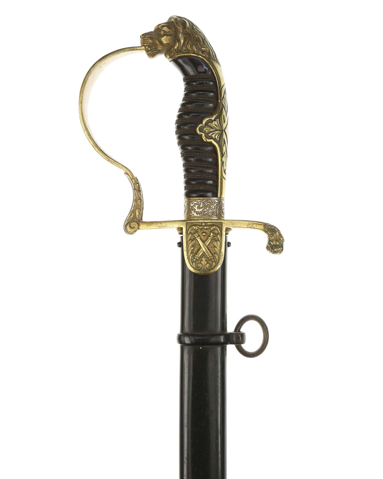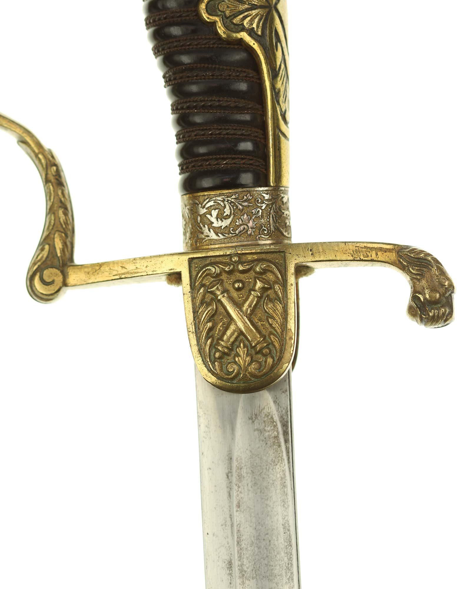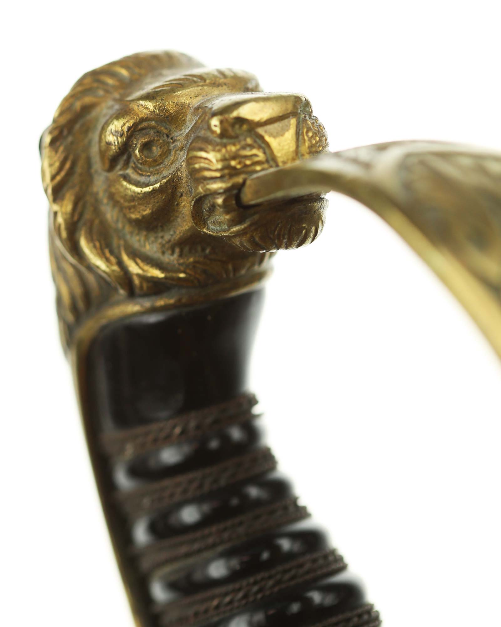 This is a Prussian Artillery Officer's Sword is interesting and features a very large and unique hilt. The quality of the hilt is very good and comprises a finely detailed lionshead pommel. The langet includes crossed cannon motif. The grip is black and brass twistwire to the grip. The scabbard is a straight example and painted black. The scabbard is fitted with one ring carriage.