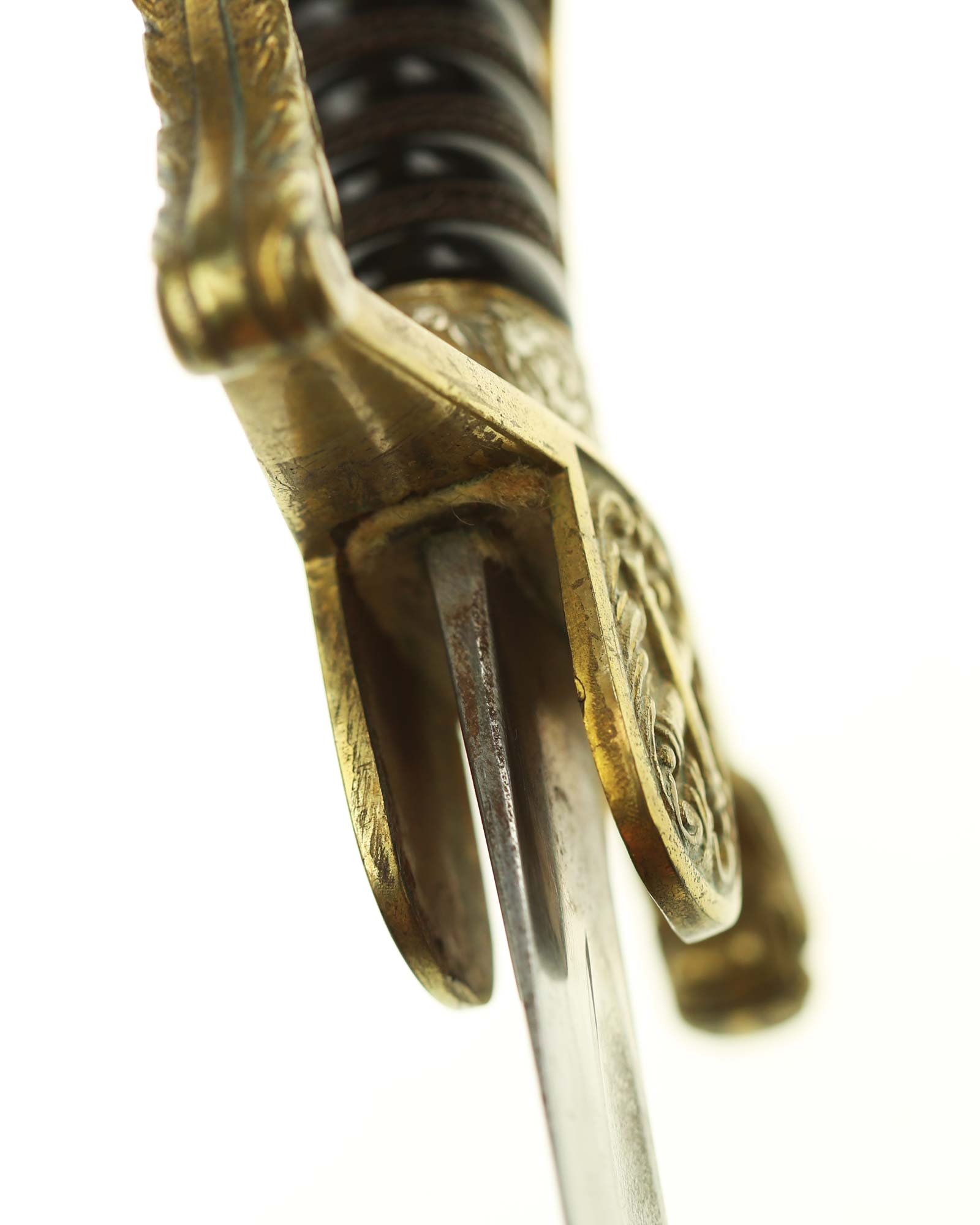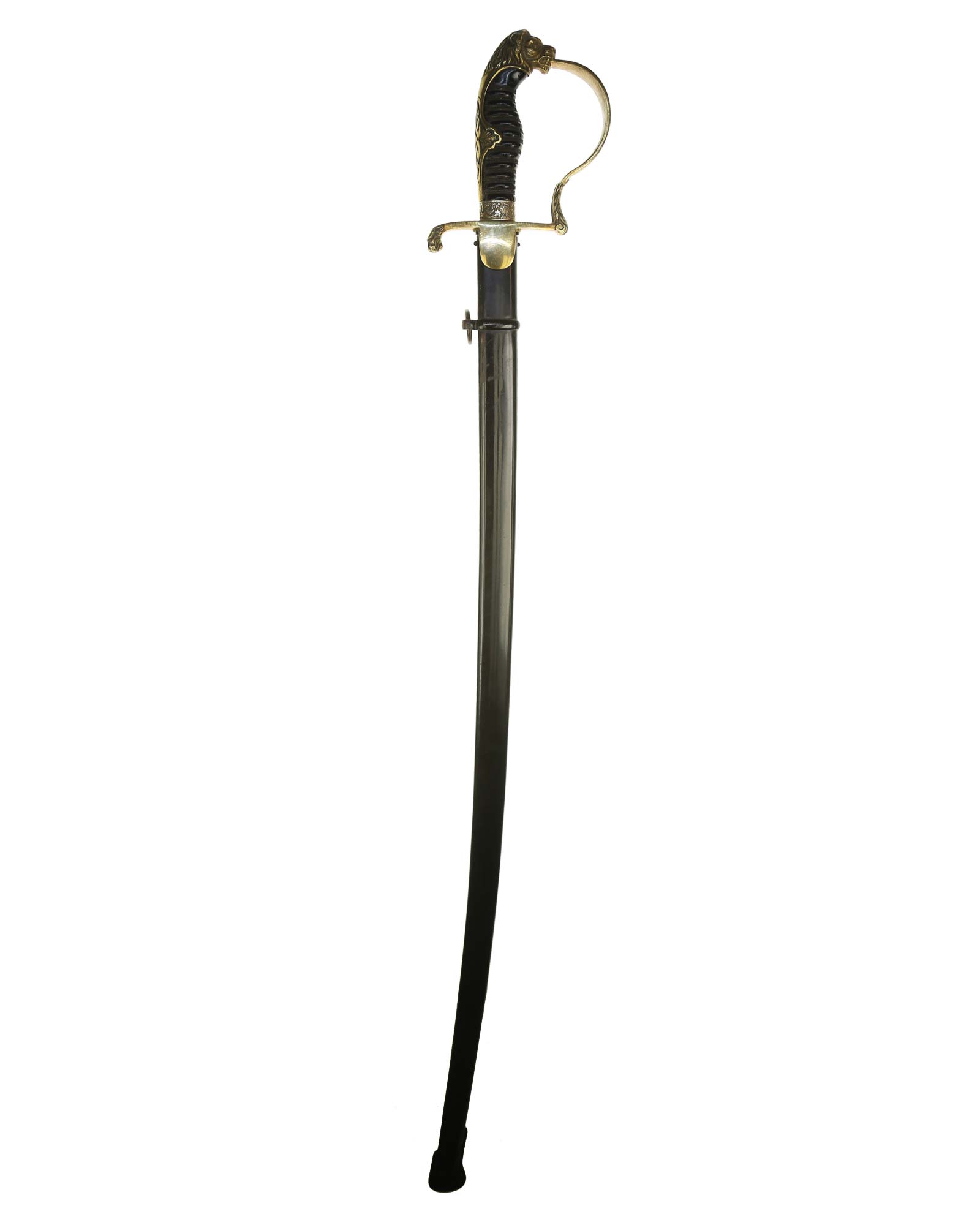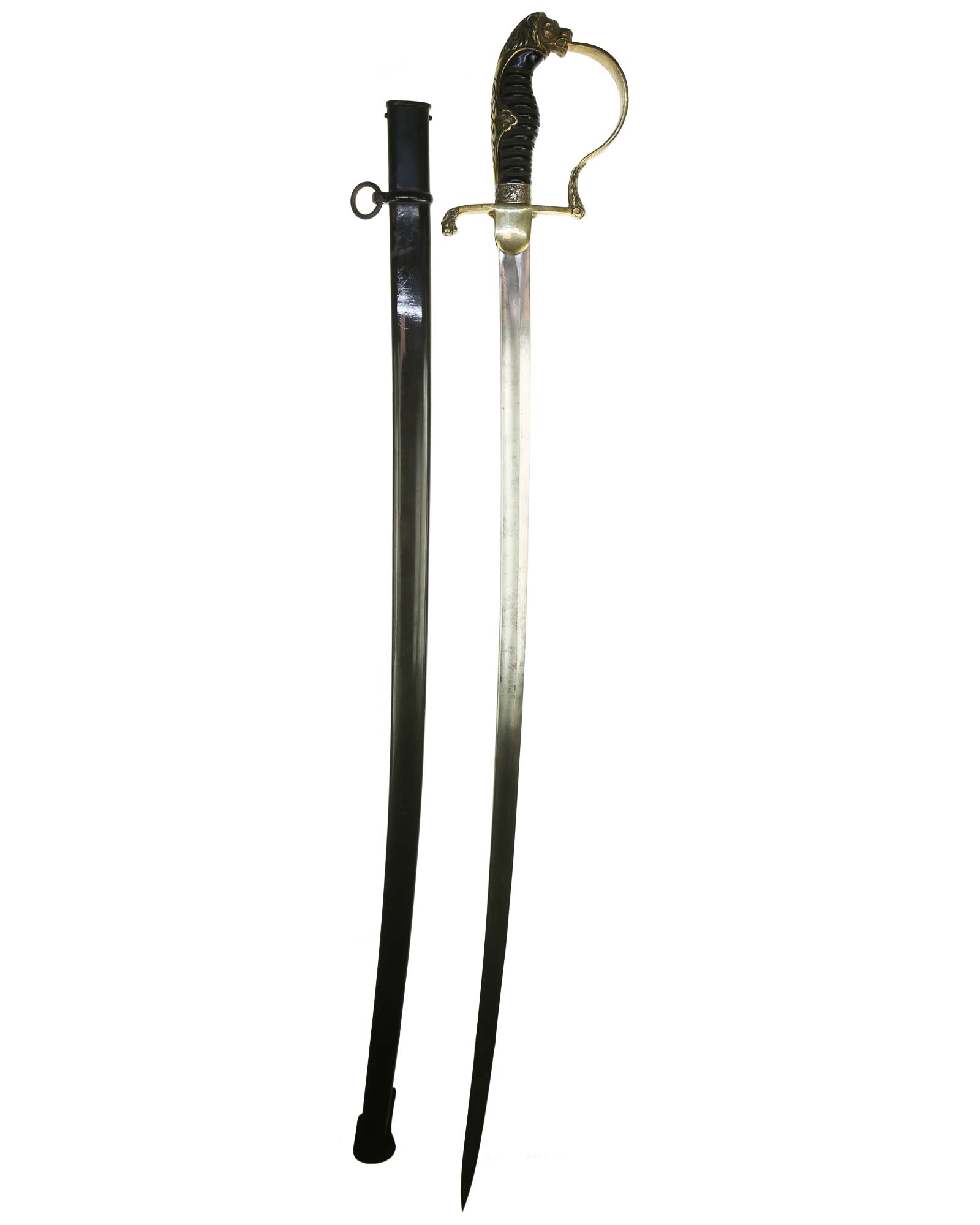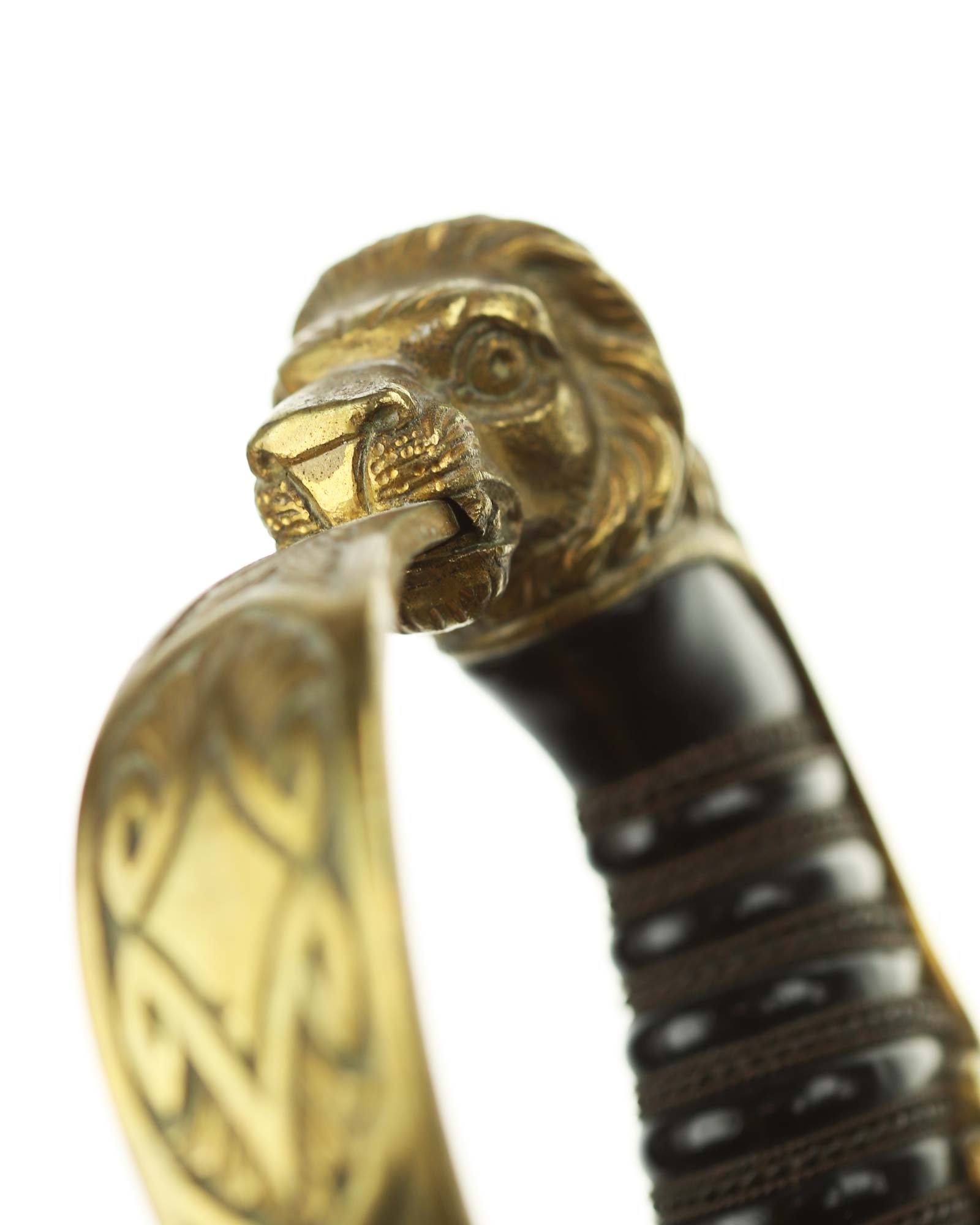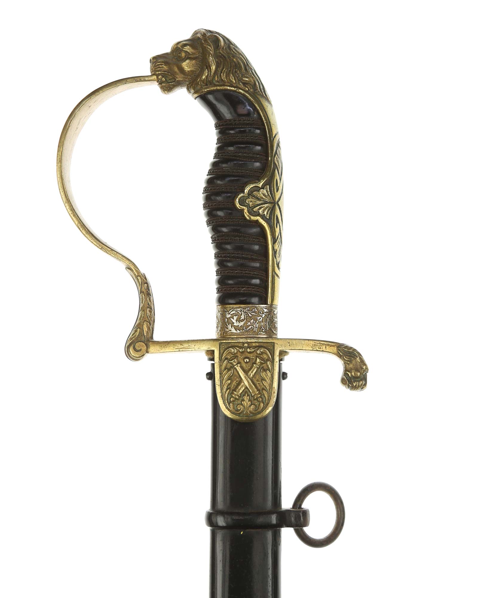This is a Prussian Artillery Officer's Sword is interesting and features a very large and unique hilt. The quality of the hilt is very good and comprises a finely detailed lionshead pommel. The langet includes crossed cannon motif. The grip is black and brass twistwire to the grip. The scabbard is a straight example and painted black. The scabbard is fitted with one ring carriage.