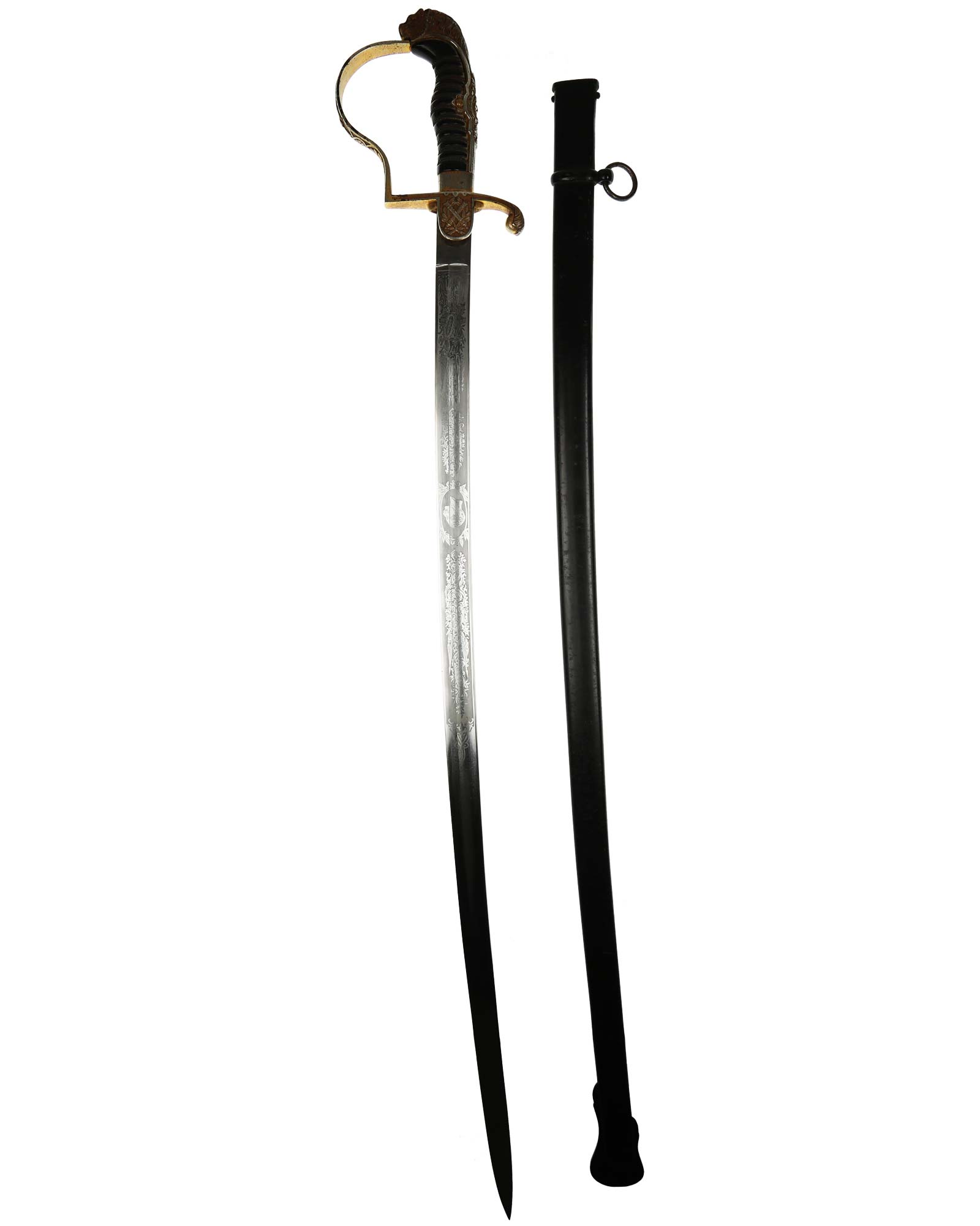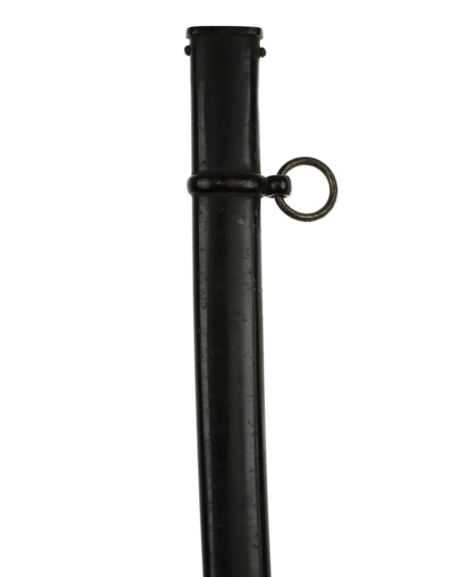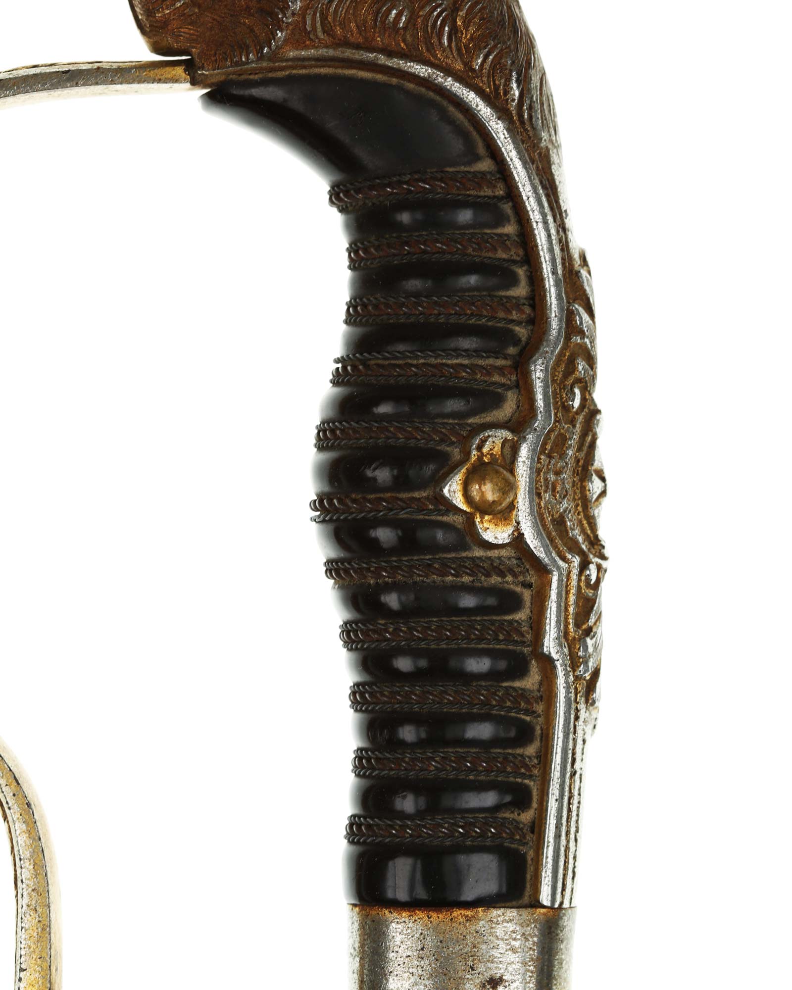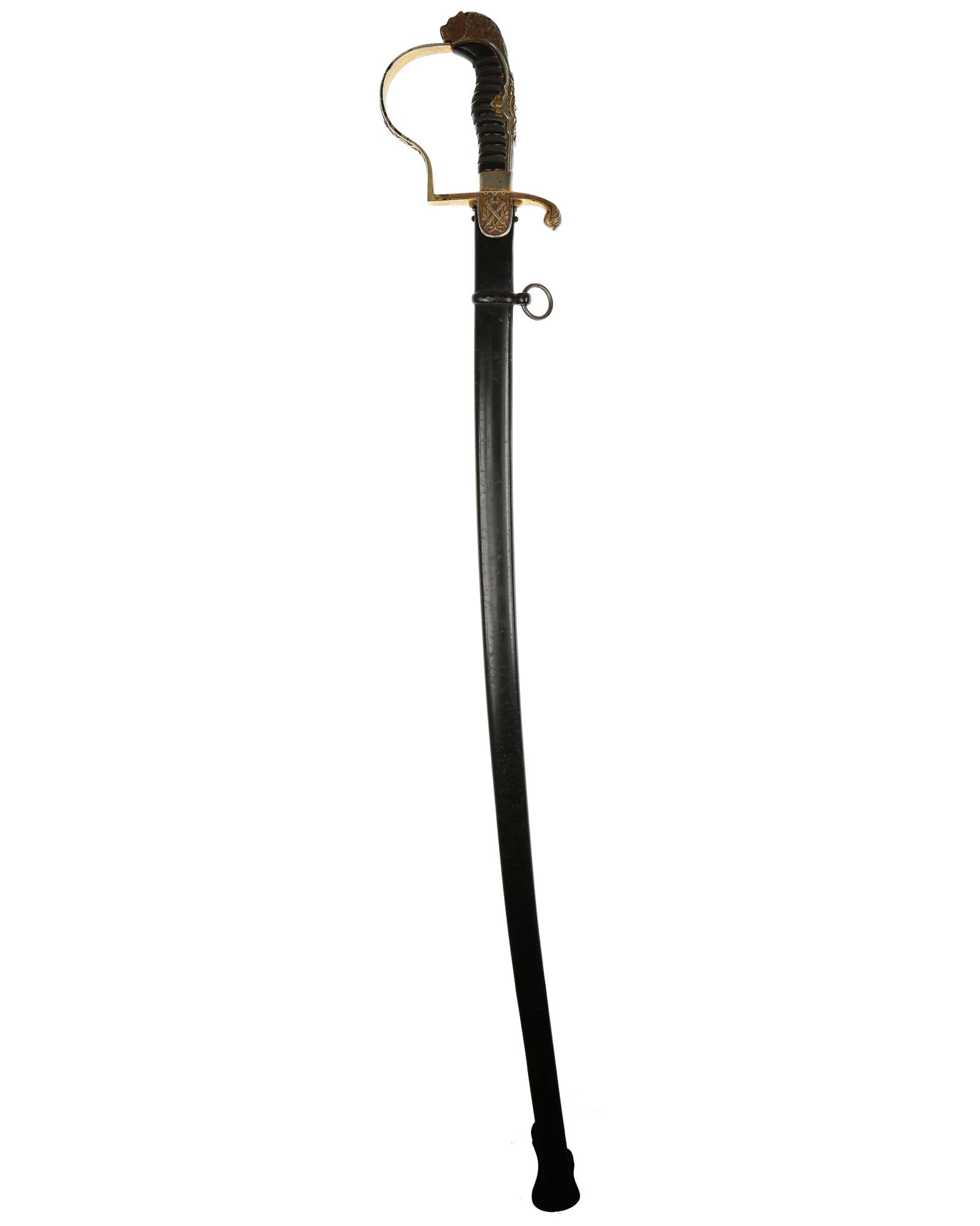 This is a Prussian Artillery Officer's Sword is interesting and features a very large and unique hilt. The quality of the hilt is very good and comprises a finely detailed lionshead pommel. The langet includes crossed cannon motif. The grip is black and brass twistwire to the grip. The scabbard is a straight example and painted black. The scabbard is fitted with one ring carriage. Blade is with maker mark by E. Pack & Söhne Solingen.