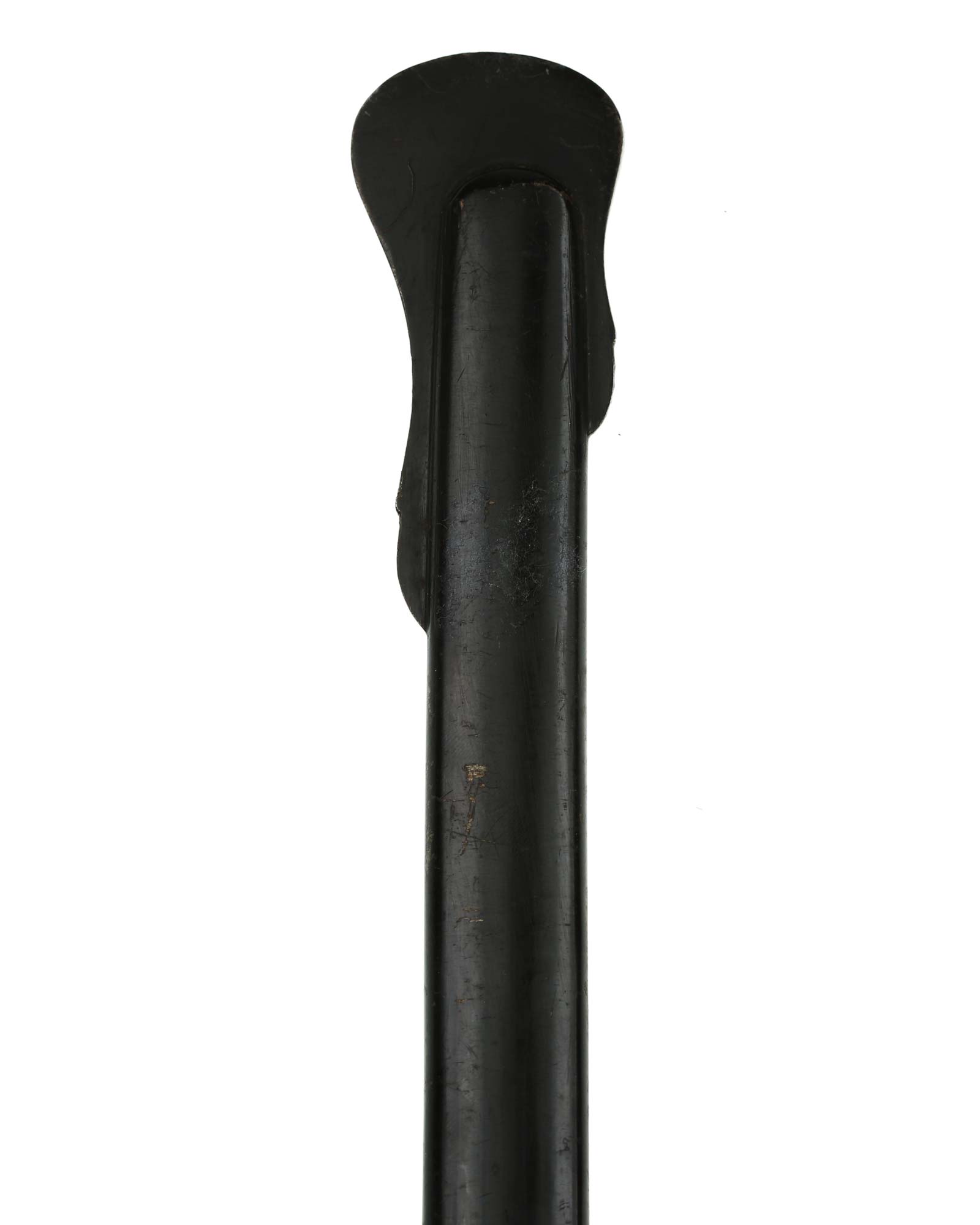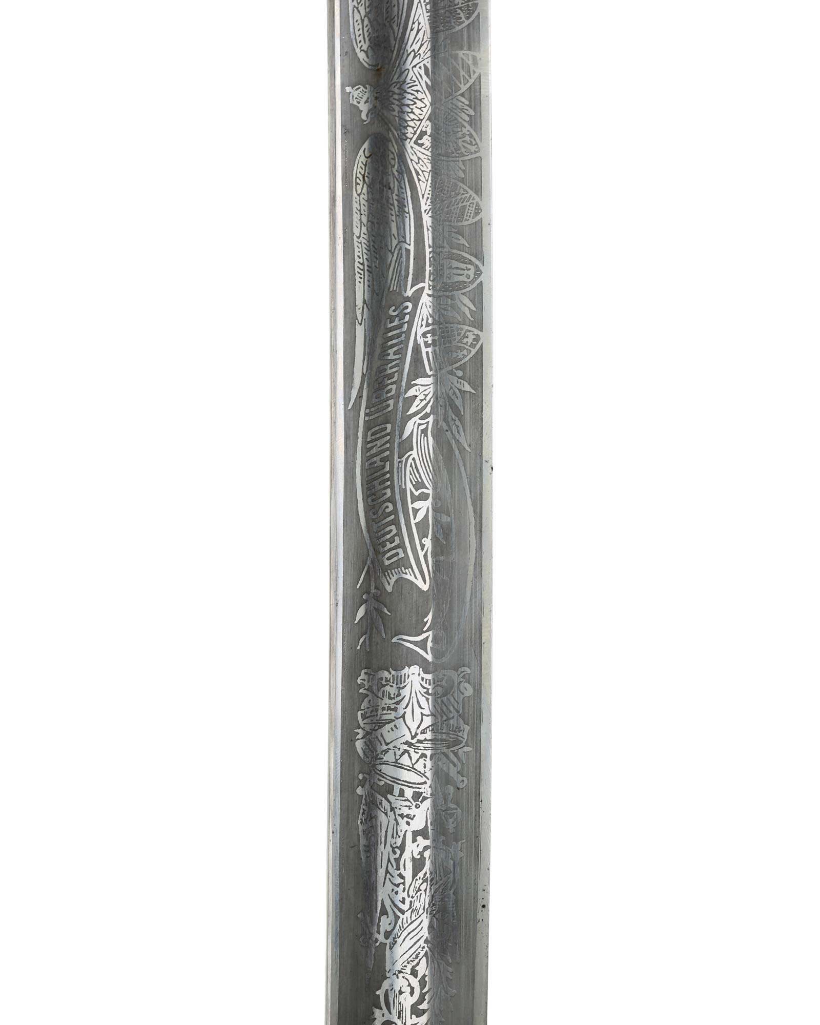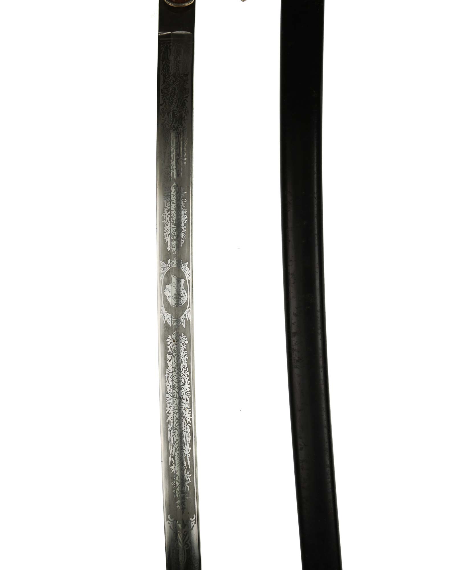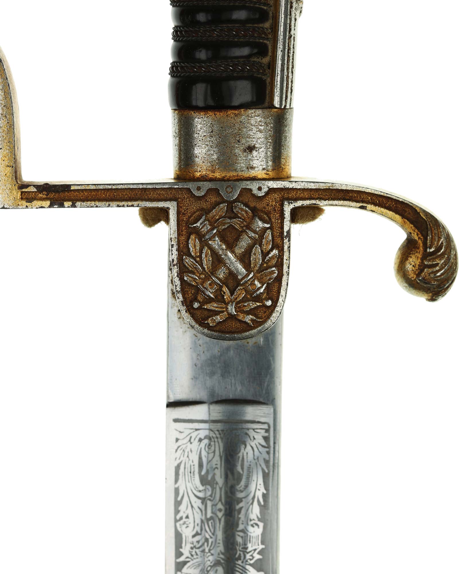This is a Prussian Artillery Officer's Sword is interesting and features a very large and unique hilt. The quality of the hilt is very good and comprises a finely detailed lionshead pommel. The langet includes crossed cannon motif. The grip is black and brass twistwire to the grip. The scabbard is a straight example and painted black. The scabbard is fitted with one ring carriage. Blade is with maker mark by E. Pack & Söhne Solingen.