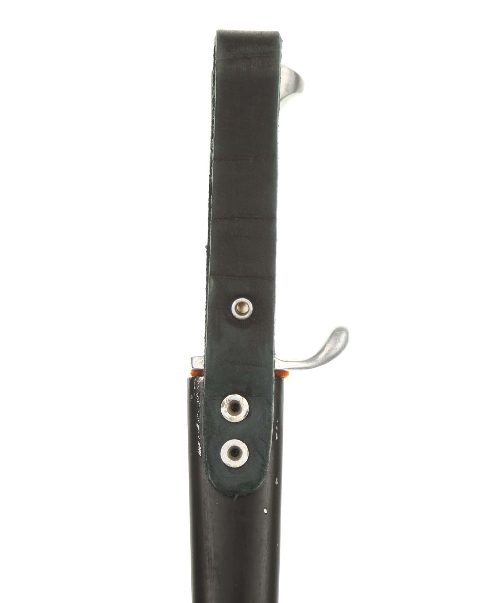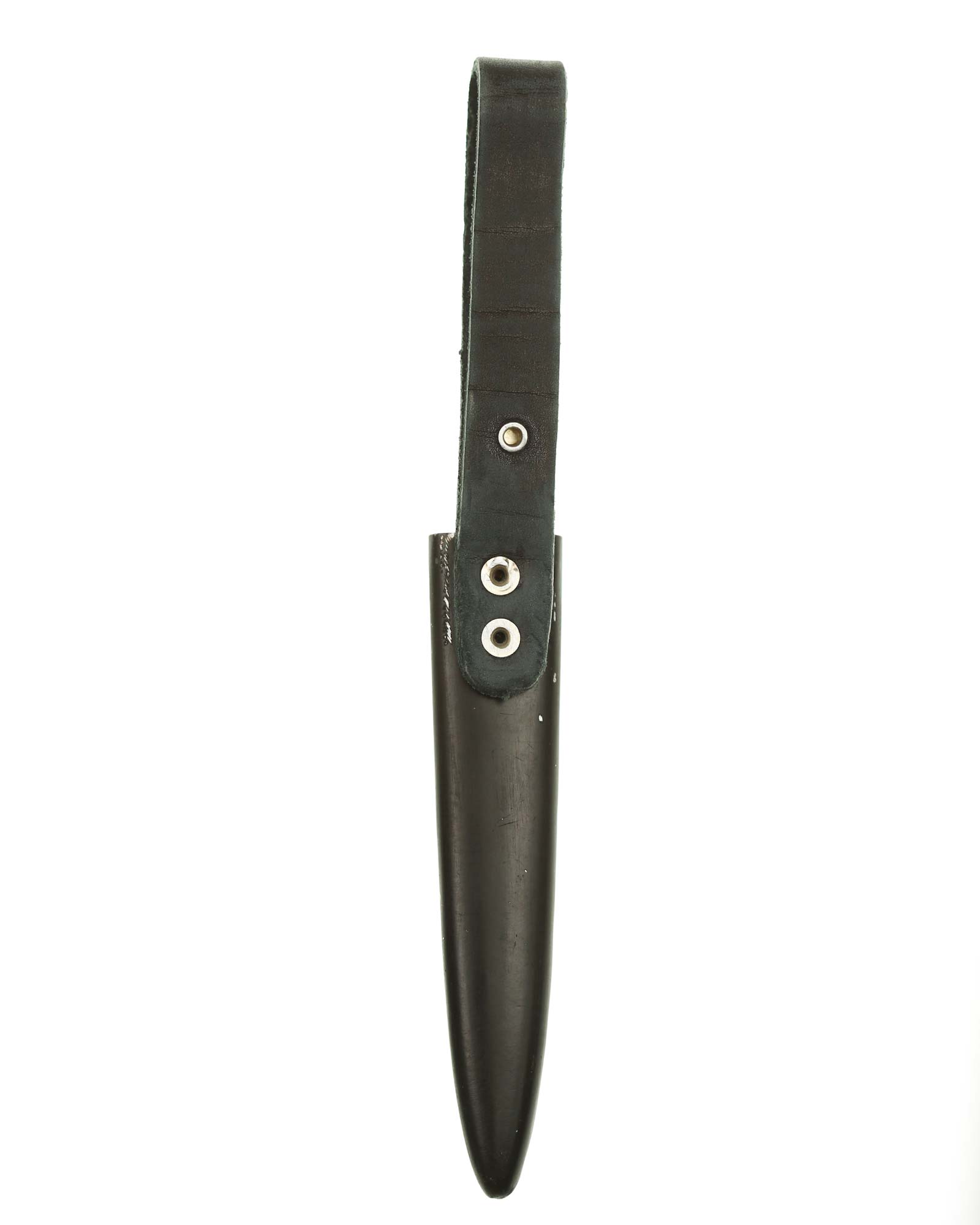 Scabbard: The scabbard shell has good, black paint. This paint has a few mild age spots spread evenly throughout the surface. Attached to the scabbard is an excellent leather hanger.