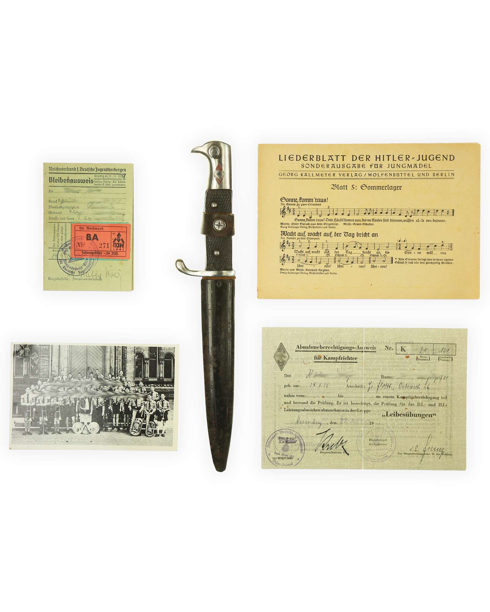 This early Hitler Youth Knife in trench dagger form is with SS Motto «Meine Ehre heißt Treue». Model 1933-1935 [Early-period]. The total length is 27,5 cm. The Knife has the maker mark on the blade: Carl Eickhorn Solingen.