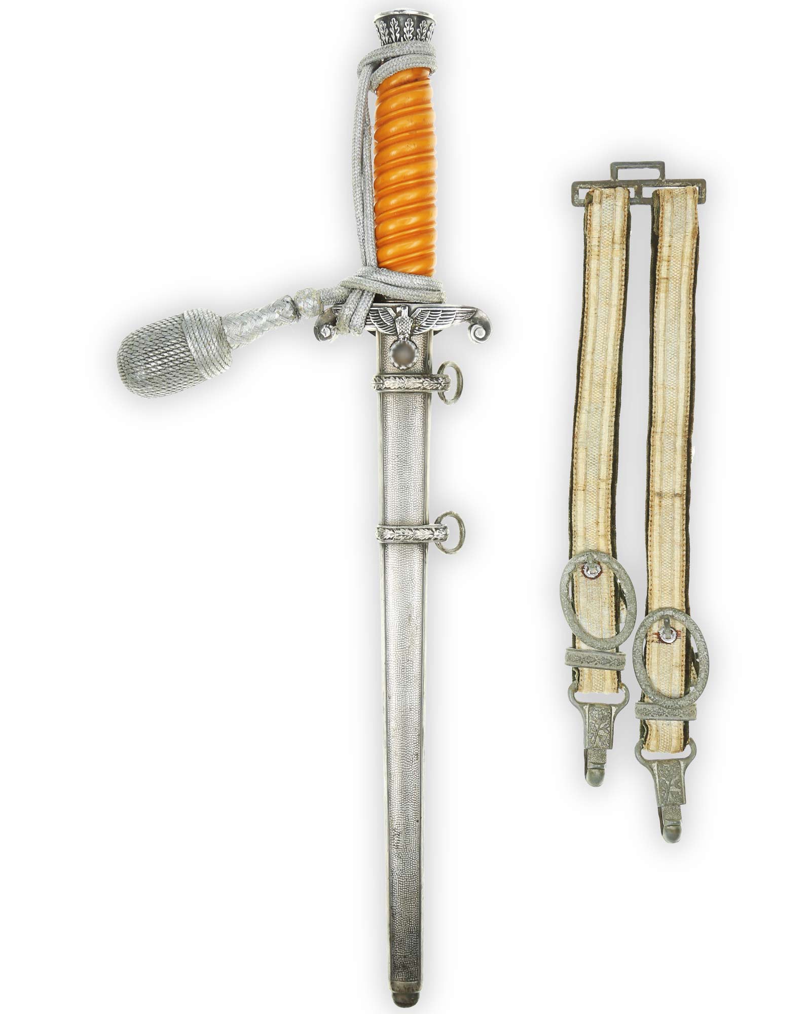 Grip: Cylindrical grip made of orange trylon, featuring double-twisted convex grooves. The conical pommel is tightly screwed to the tang and decorated with detailed oak leaves. At the lower end, a ring ornamented with aligned oak leaves. The crossguard bears the typical German eagle looking to the left, wings flowing downward, clutching a swastika within a wreath.