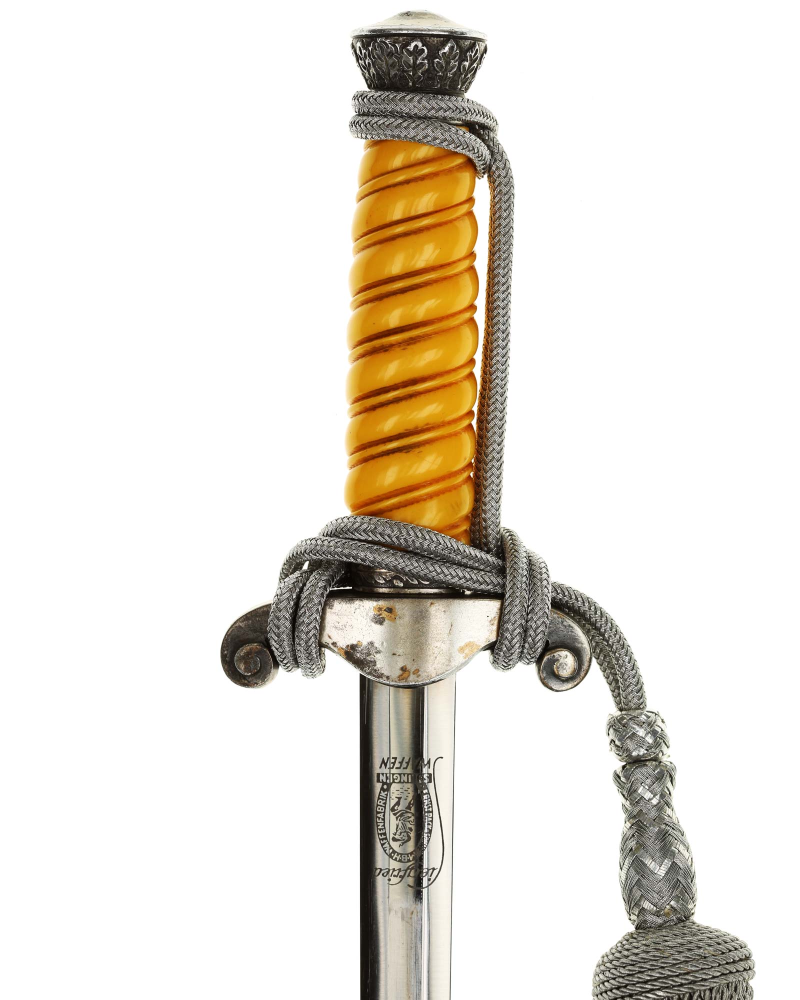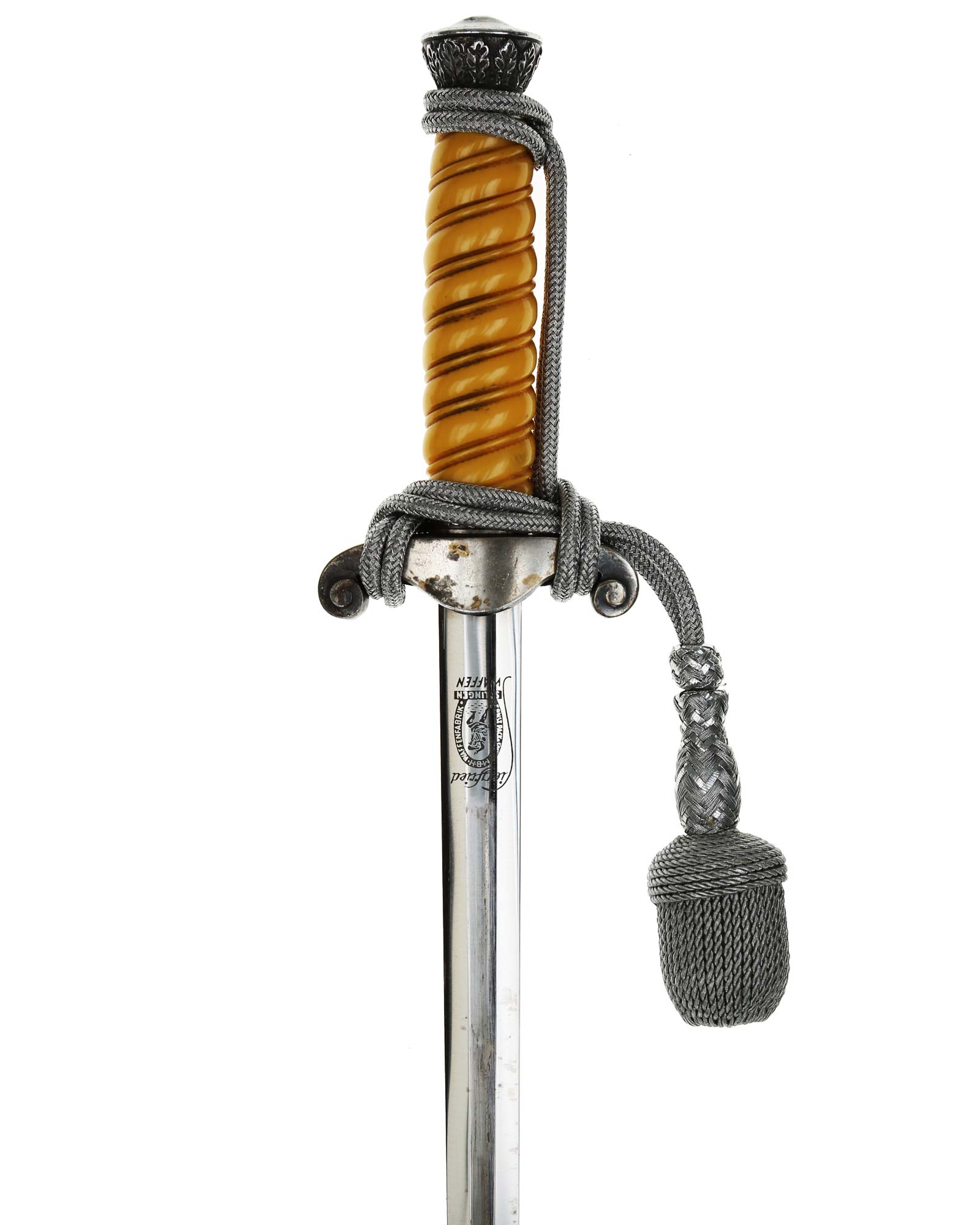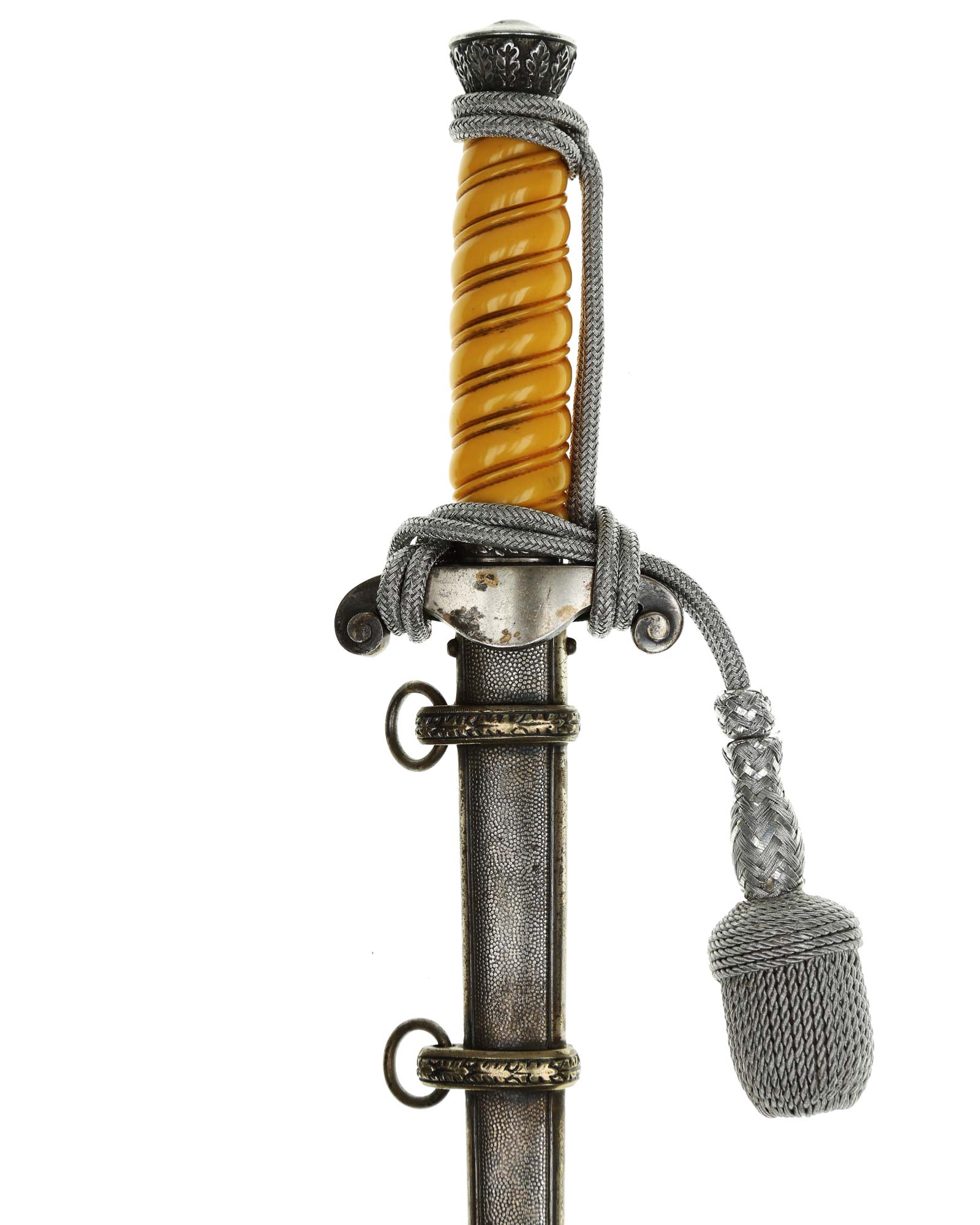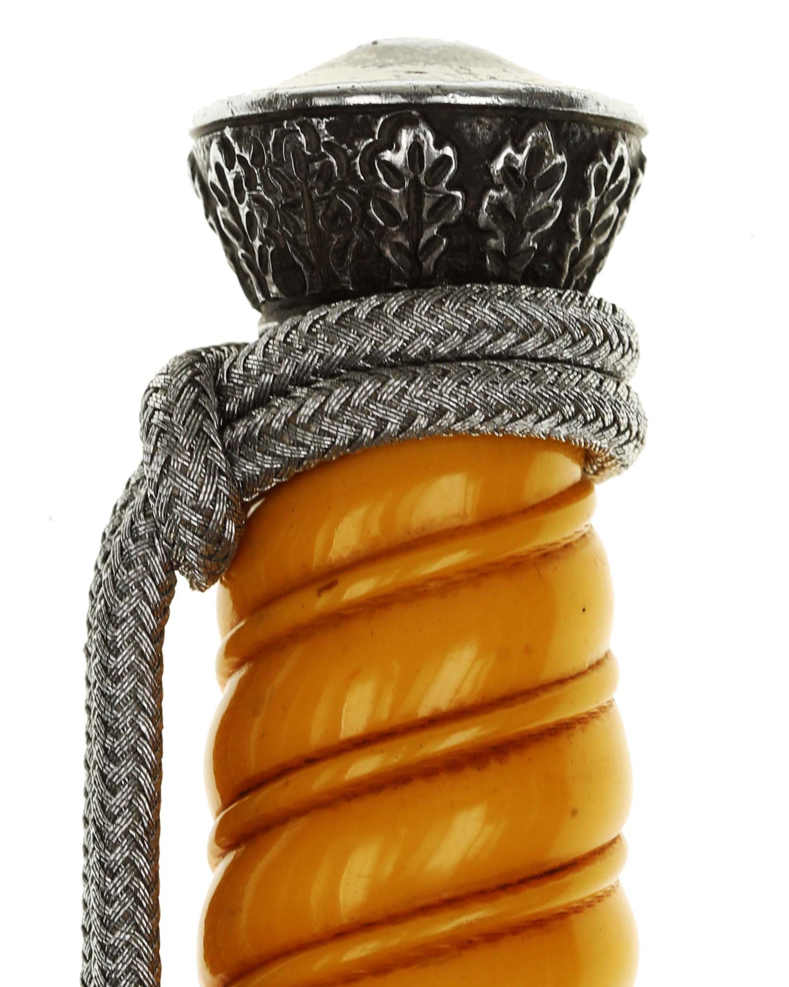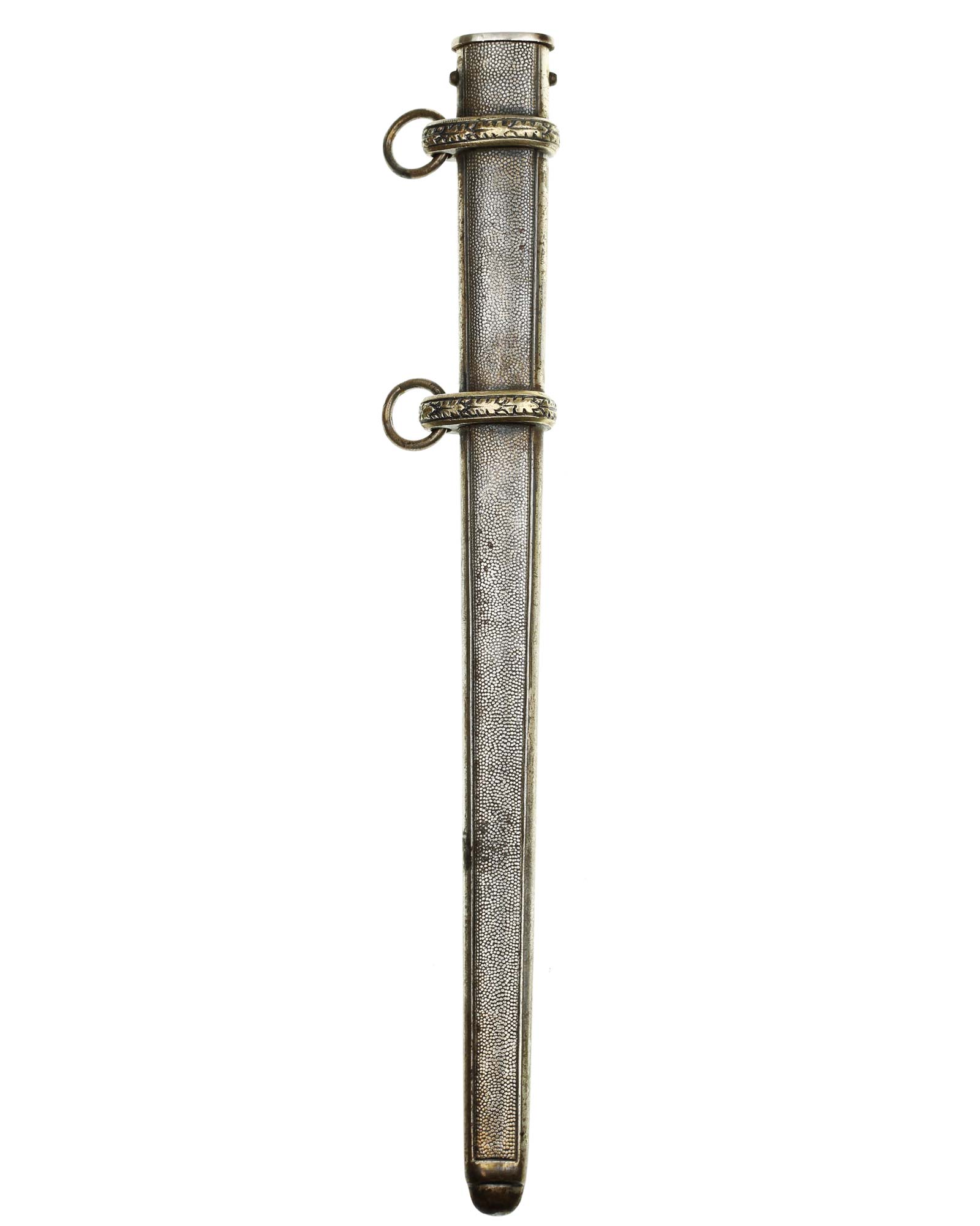 Scabbard: This scabbard is straight and has excellent silver plating. This plating is nicely patinated throughout. The bands are particularly interesting as they depict oak leaves which have been completely hand rendered. These oak leaves have pebbled backgrounds and are made in a series of lines to resemble veins. The throat is retained by two dome head side screws.
