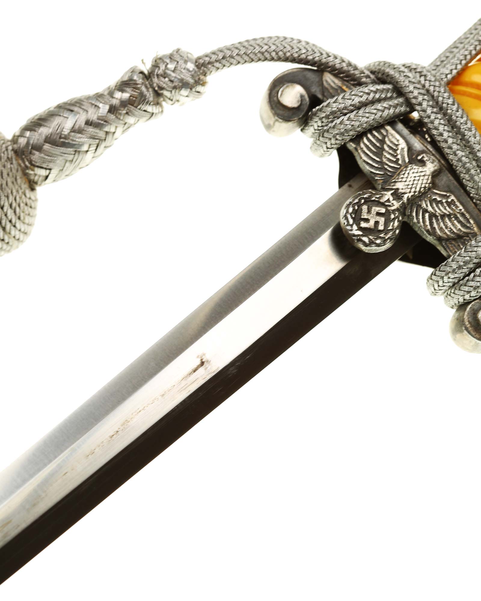 Grip: The grip of this dagger is a yellow color and remains in perfect condition. The pommel shows minor traces of carrying time on the upper end, but still has frosting around the edges. The 12 standing oak leaves are in excellent condition, all having hand enhancement. The eagle has quite a bit of frosting clinging to the recessed areas as well as the upper arms of the guards.