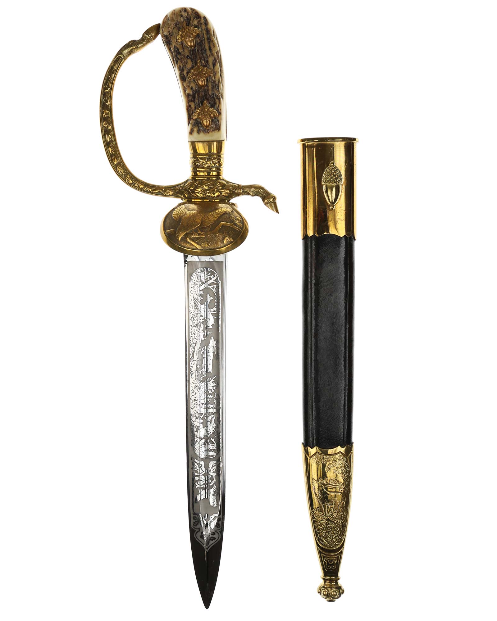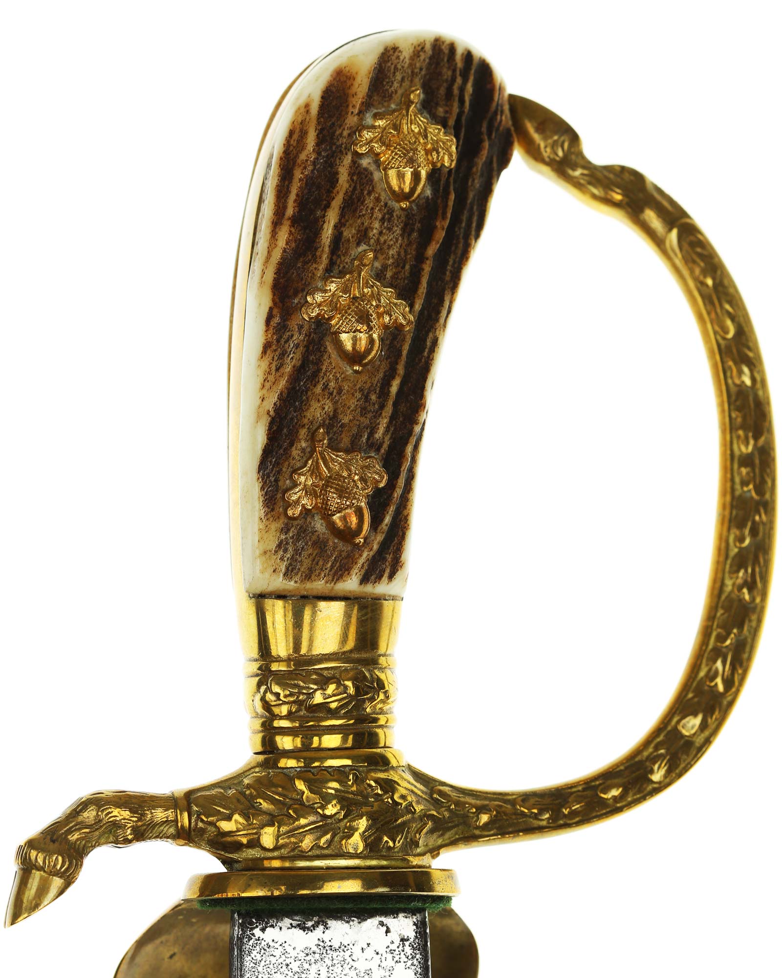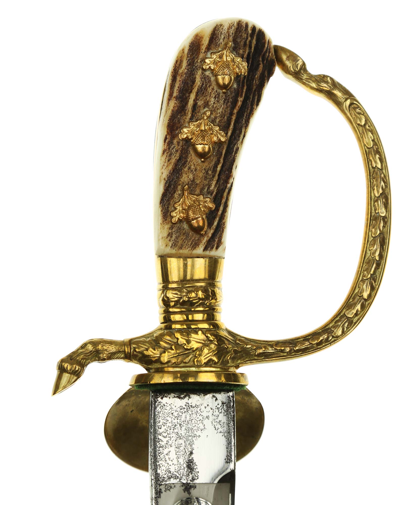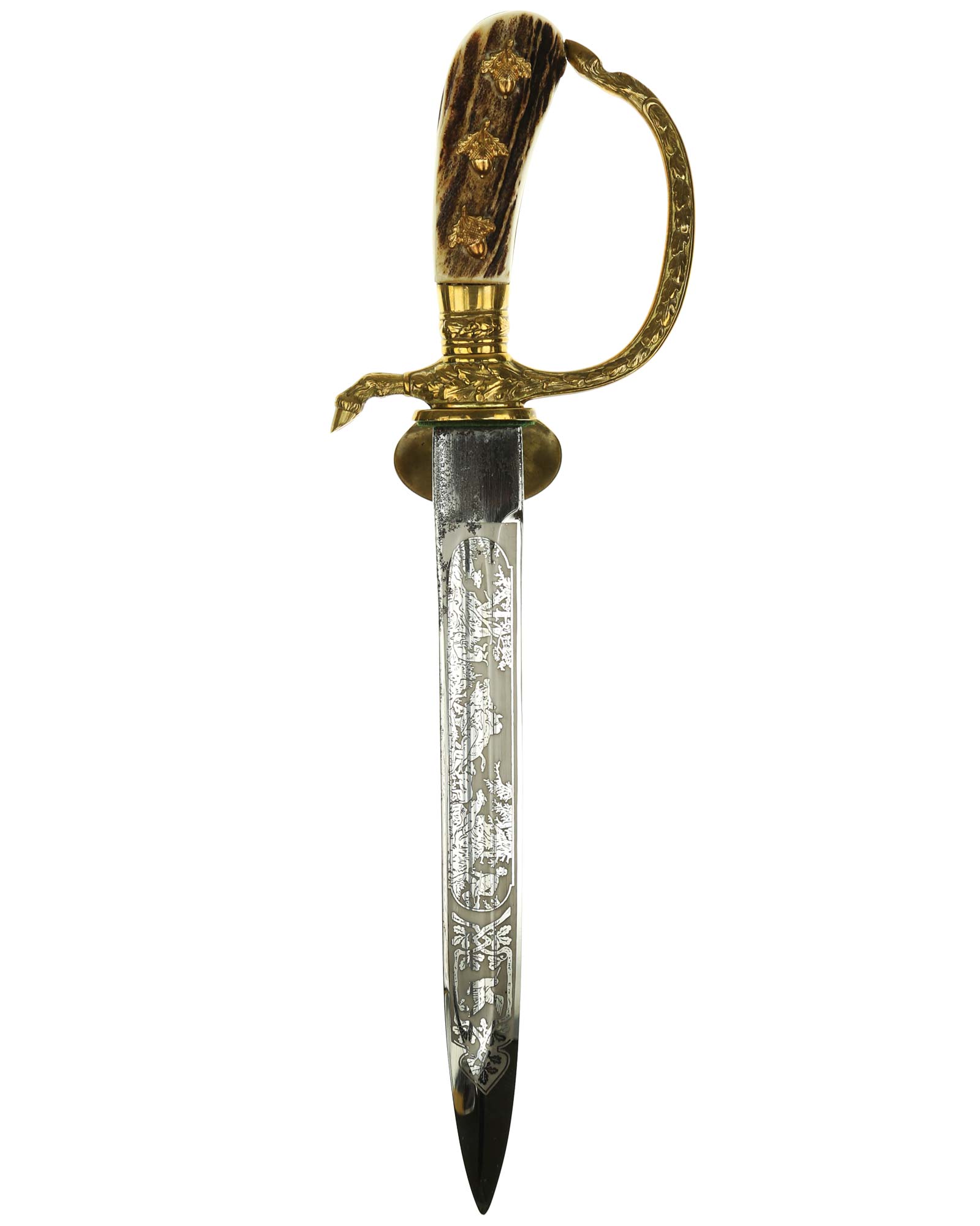 Deluxe Hunting Association Cutlass "Hirschfanger" in near mint condition, triple engraved Eickhorn blade. Retains original green felt washer. The fittings all retain almost all of their lacquer with the exception of some wear to the cross guard. Has beautiful stag grip handle with a superior depth that gives it a lot of character.