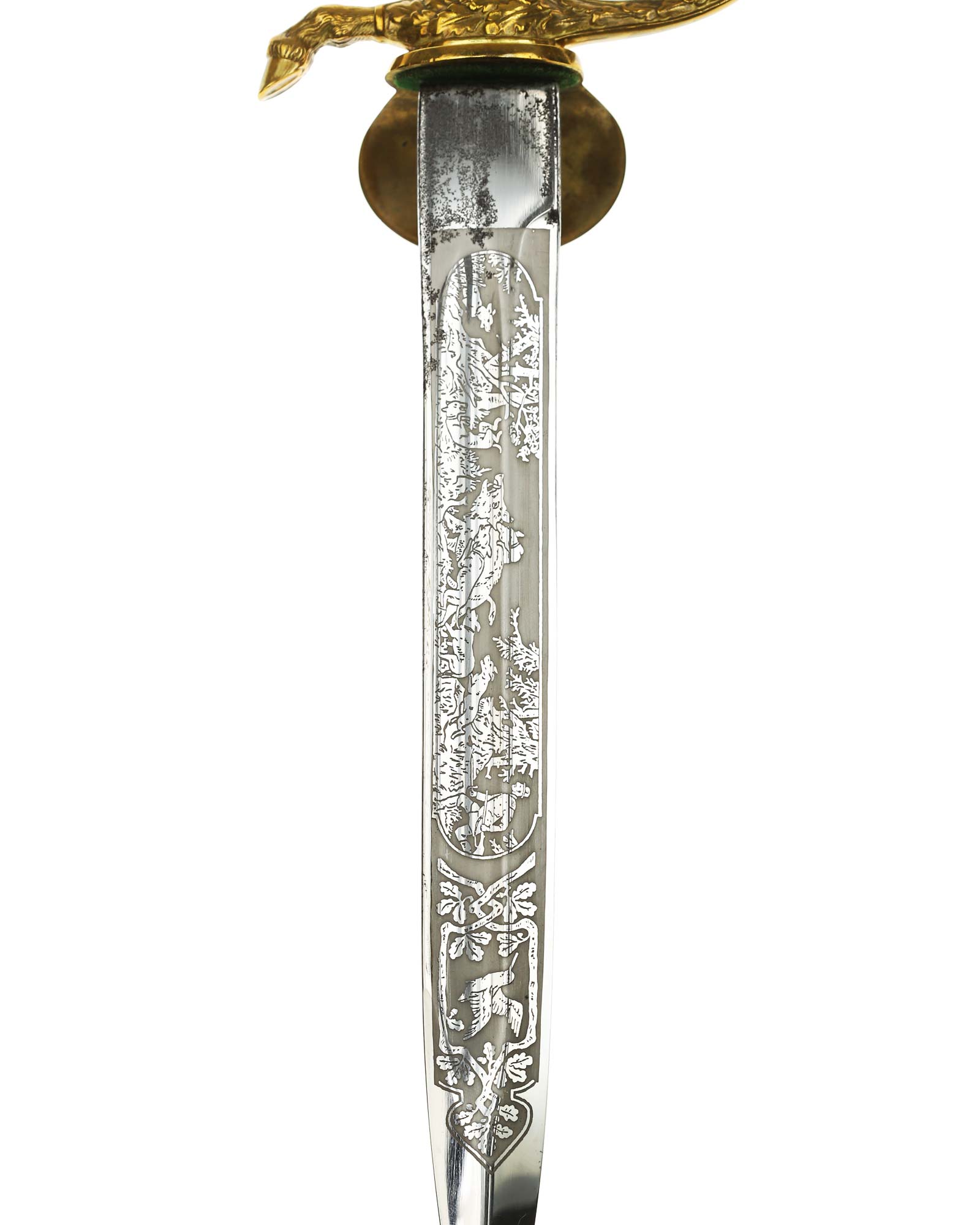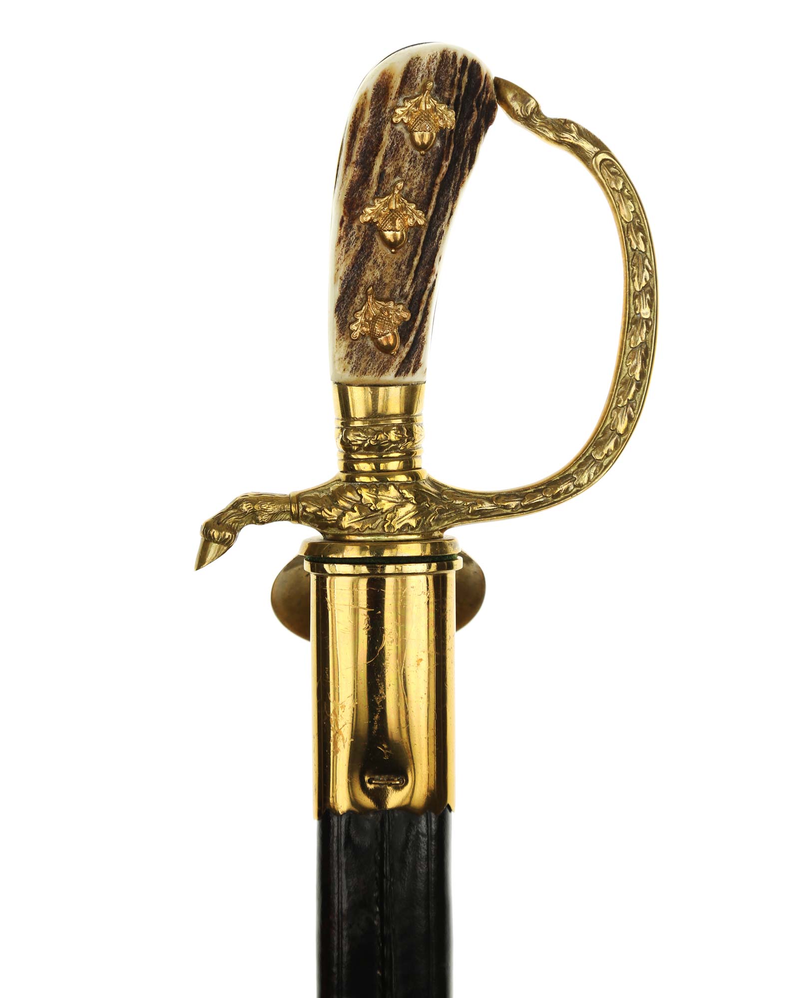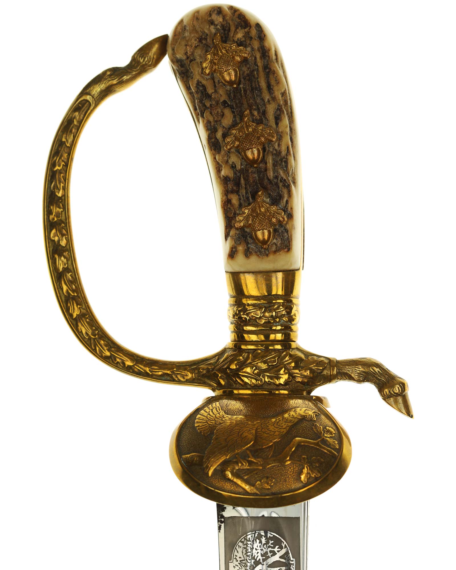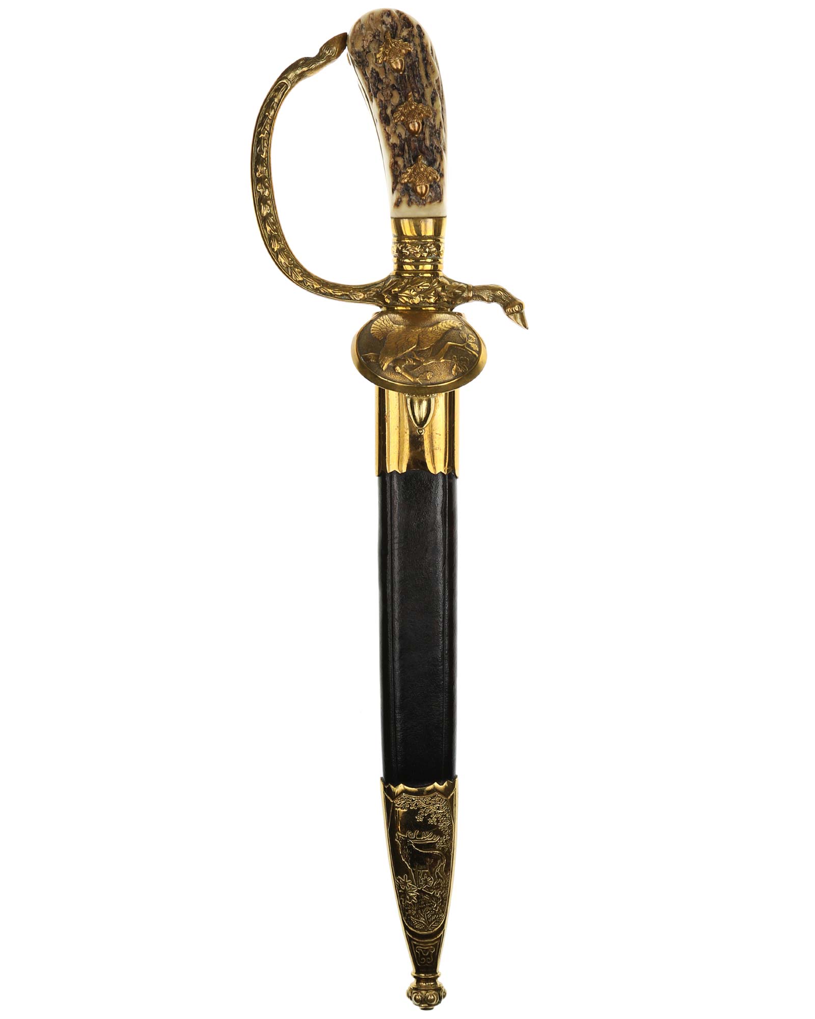 Deluxe Hunting Association Cutlass "Hirschfanger" in near mint condition, triple engraved Eickhorn blade. Retains original green felt washer. The fittings all retain almost all of their lacquer with the exception of some wear to the cross guard. Has beautiful stag grip handle with a superior depth that gives it a lot of character.
