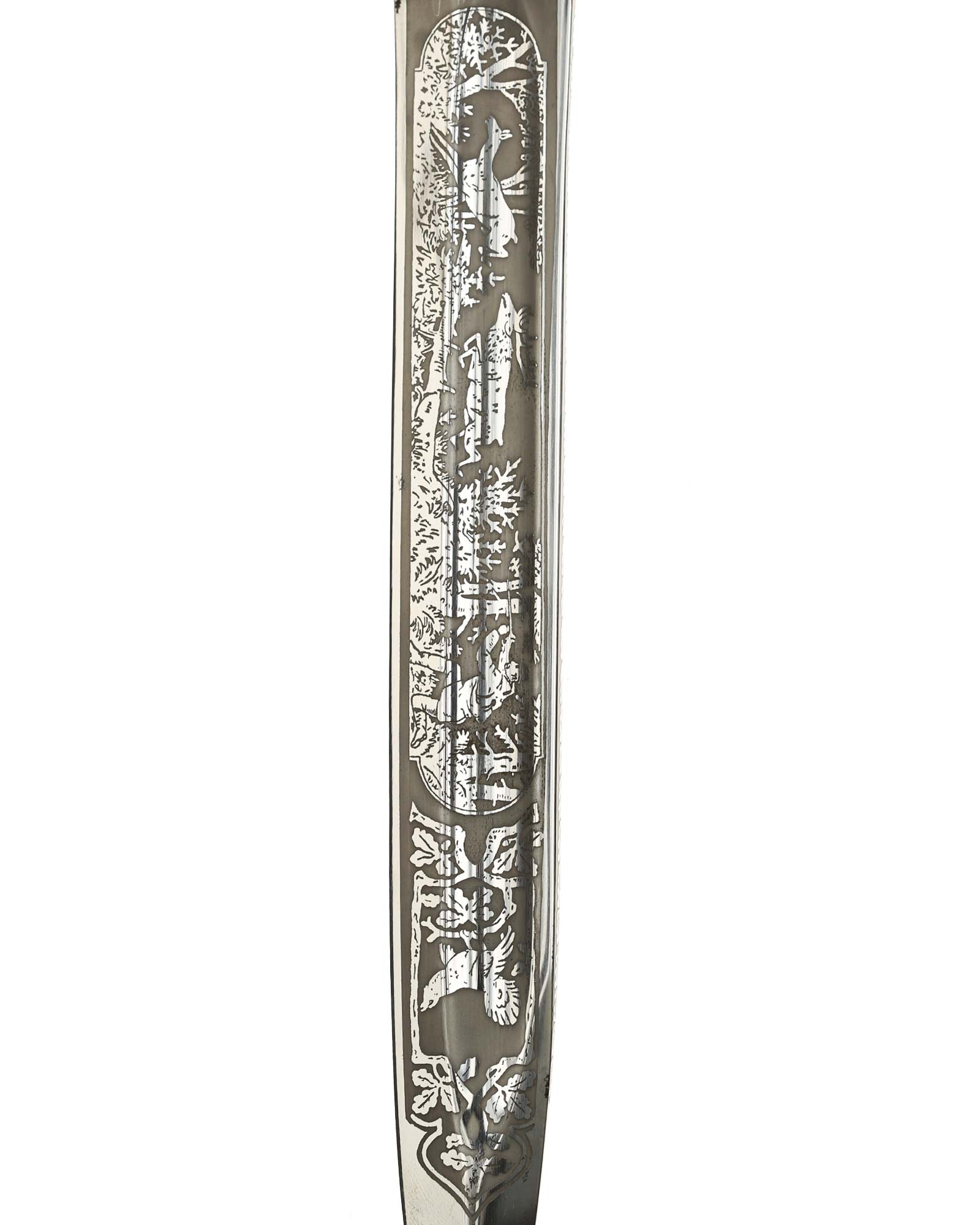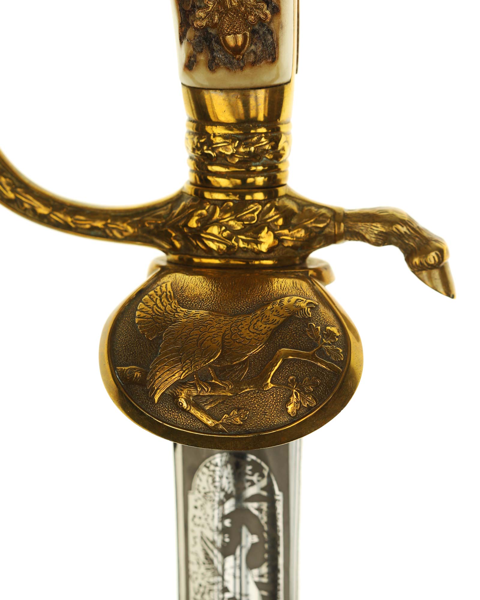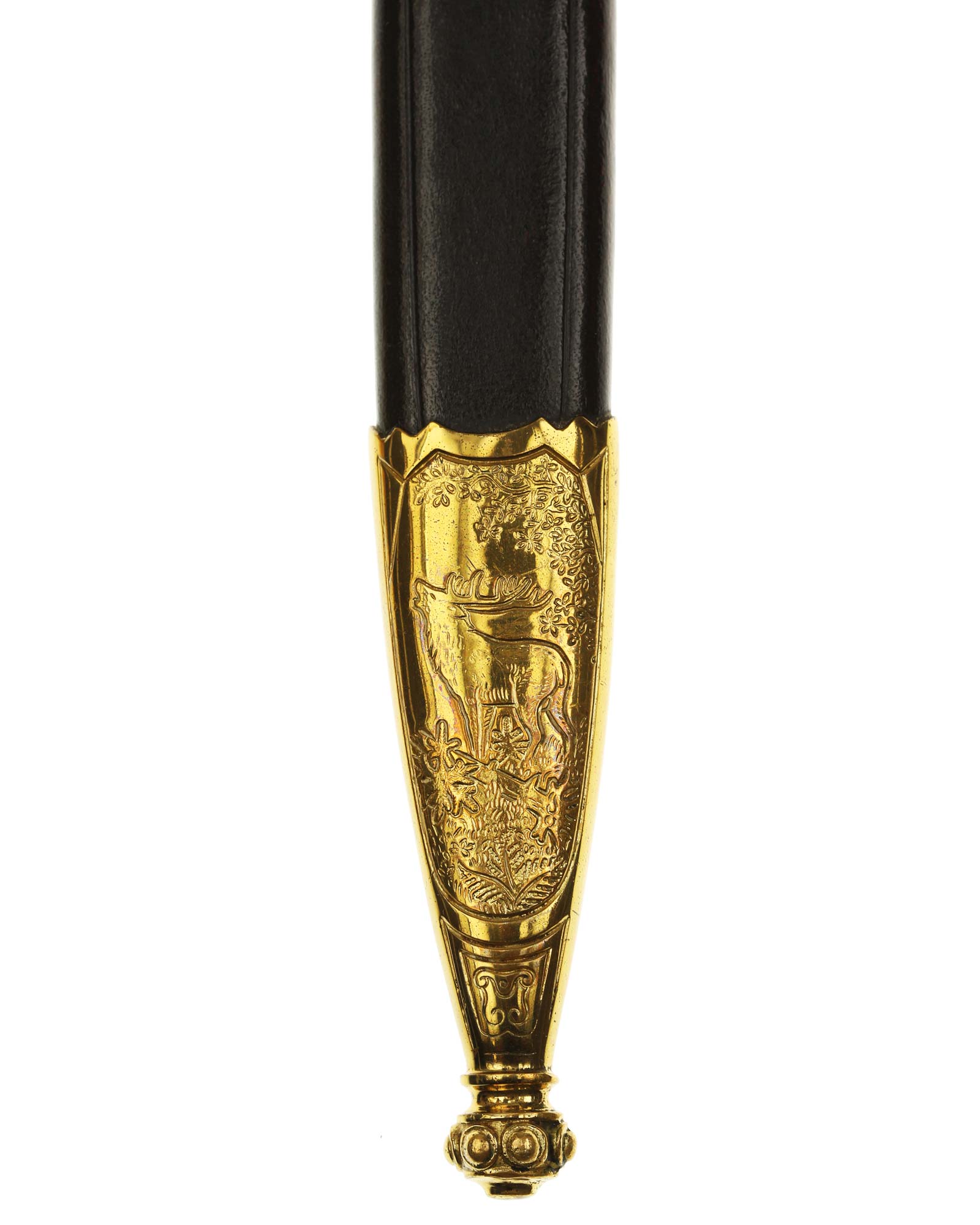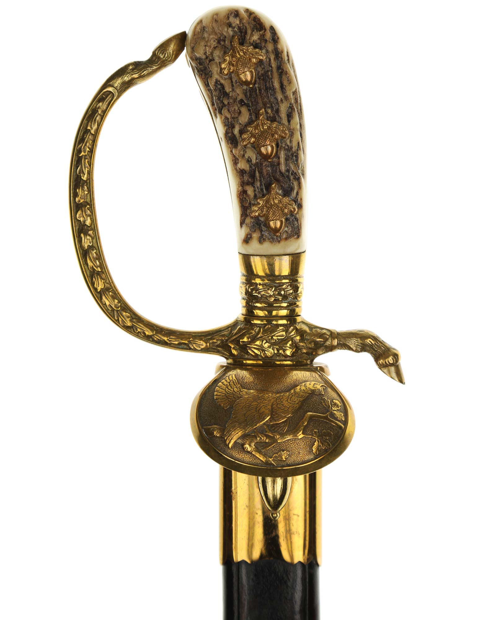 Deluxe Hunting Association Cutlass "Hirschfanger" in near mint condition, triple engraved Eickhorn blade. Retains original green felt washer. The fittings all retain almost all of their lacquer with the exception of some wear to the cross guard. Has beautiful stag grip handle with a superior depth that gives it a lot of character.