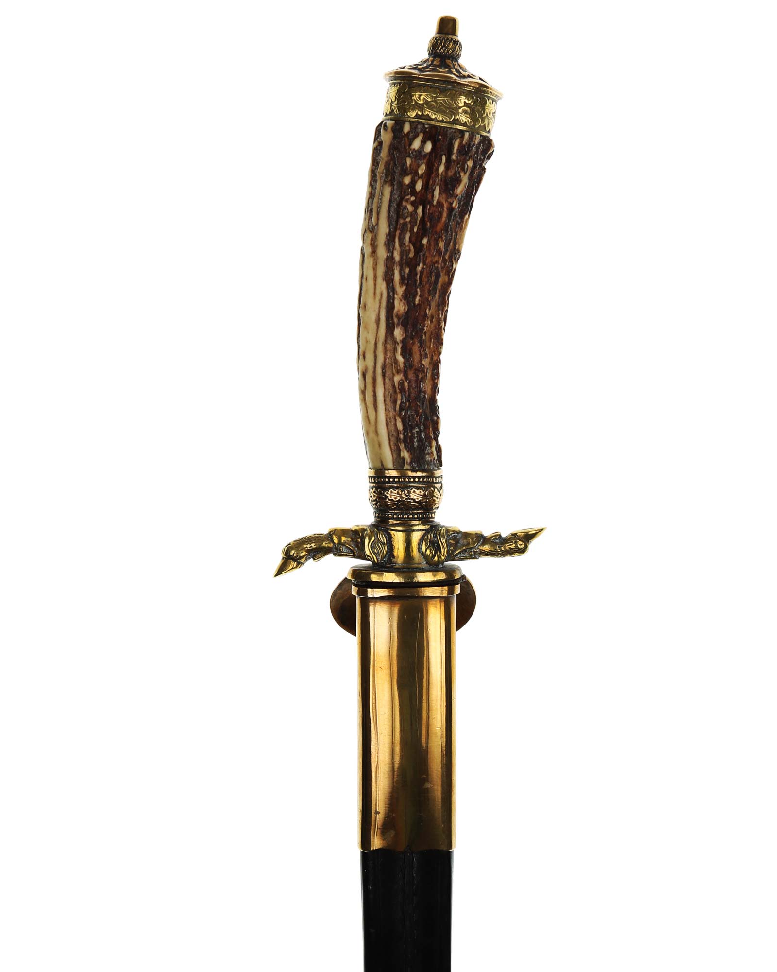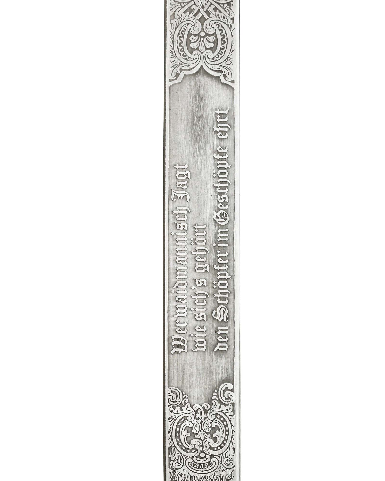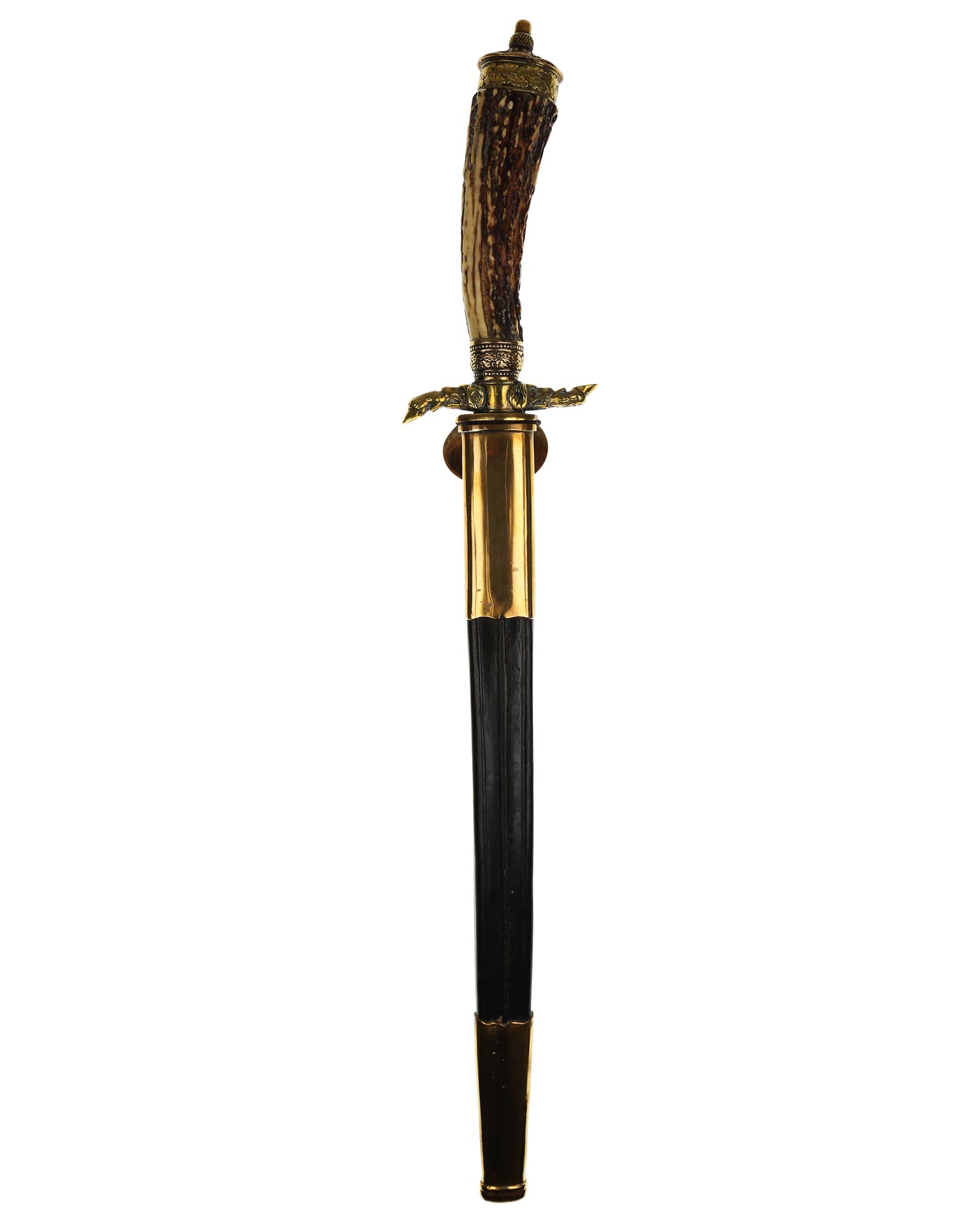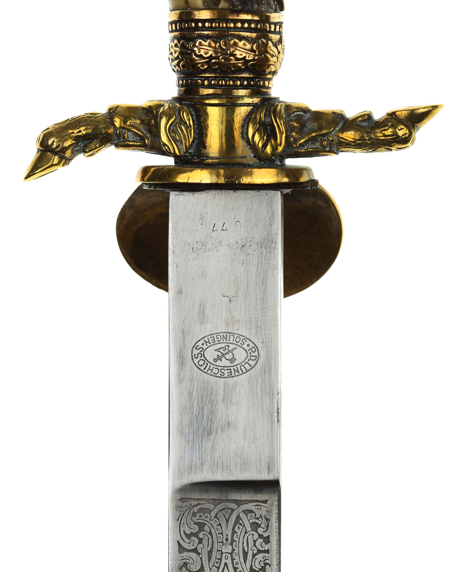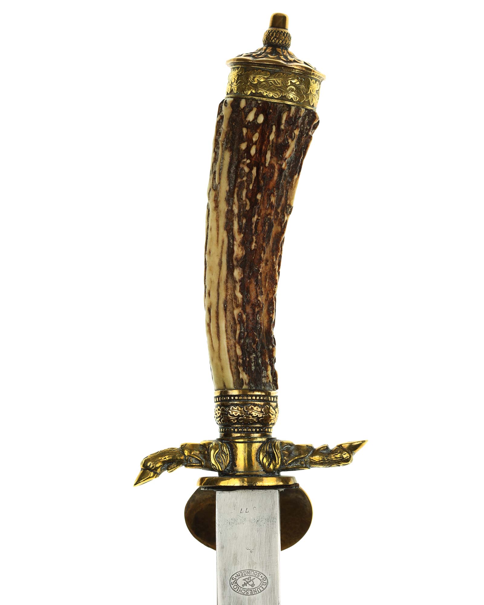 German Hunting Cutlass «Werwaidmannisch Jagt» in Near Mint condition, engraved blade. Retains original leather washer. The fittings all retain almost all of their lacquer with the exception of some wear to the cross guard. Beautiful stag grip handle. Blade with inscription: Werwaidmannisch Jagt wie sich's gehört den Schöpfer im Geschöpfe ehrt. Reverse with maker mark: P.D. Lüneschloss Solingen.