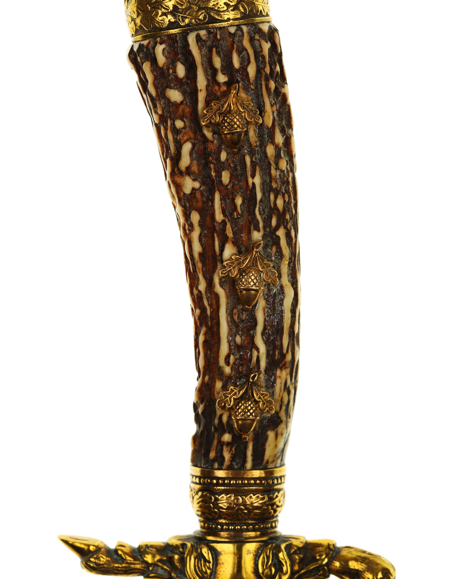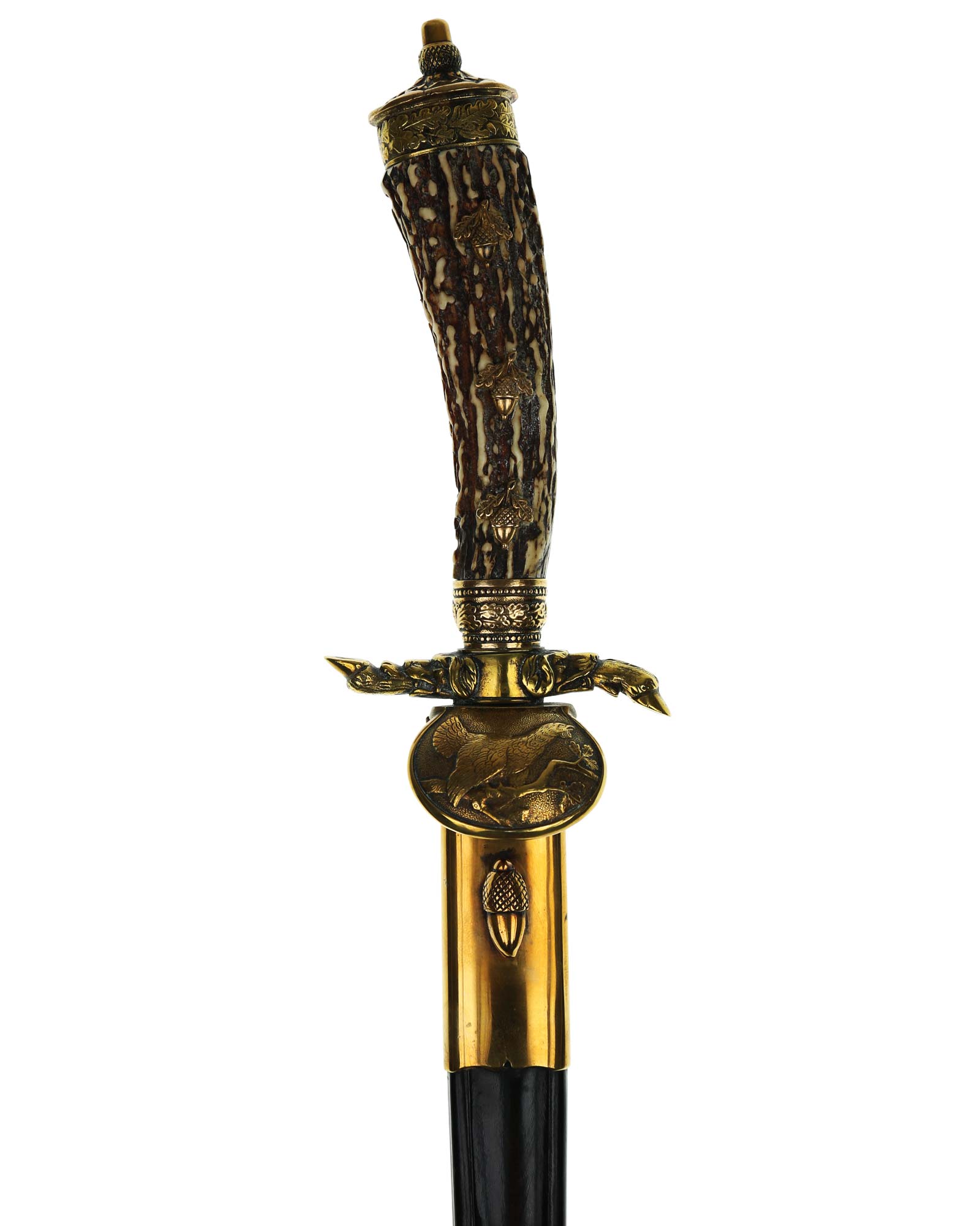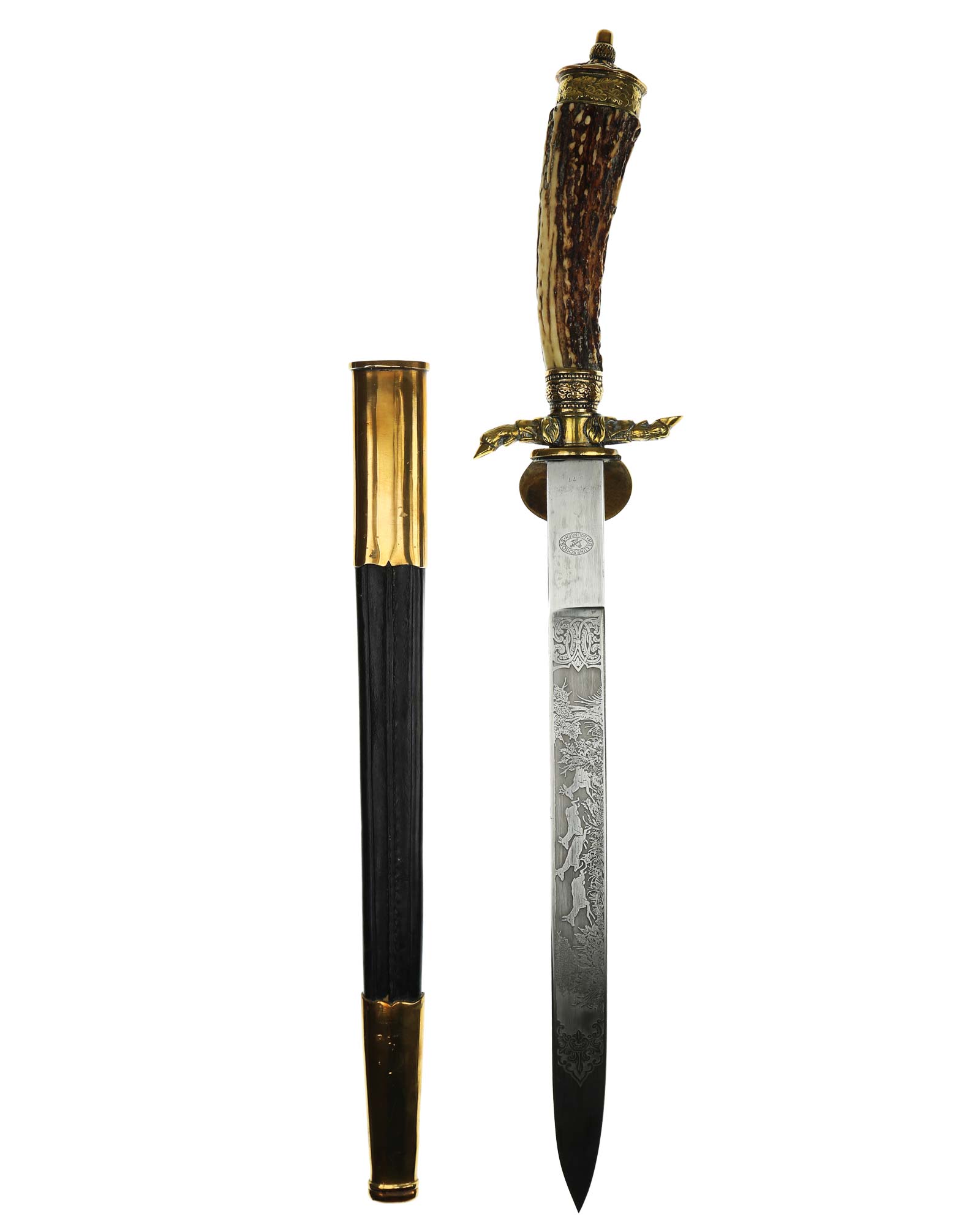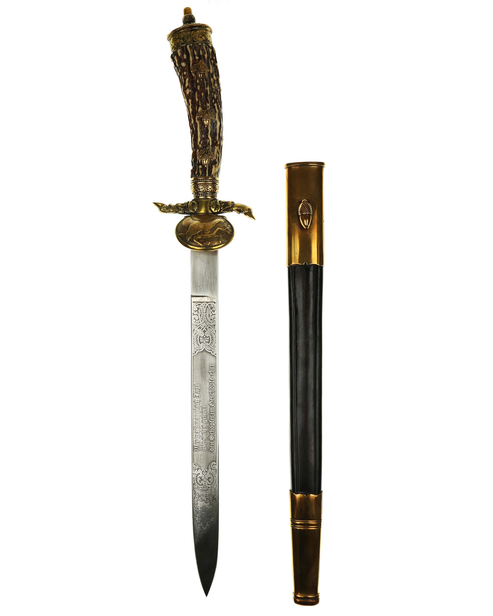 German Hunting Cutlass «Werwaidmannisch Jagt» in Near Mint condition, engraved blade. Retains original leather washer. The fittings all retain almost all of their lacquer with the exception of some wear to the cross guard. Beautiful stag grip handle. Blade with inscription: Werwaidmannisch Jagt wie sich's gehört den Schöpfer im Geschöpfe ehrt. Reverse with maker mark: P.D. Lüneschloss Solingen.