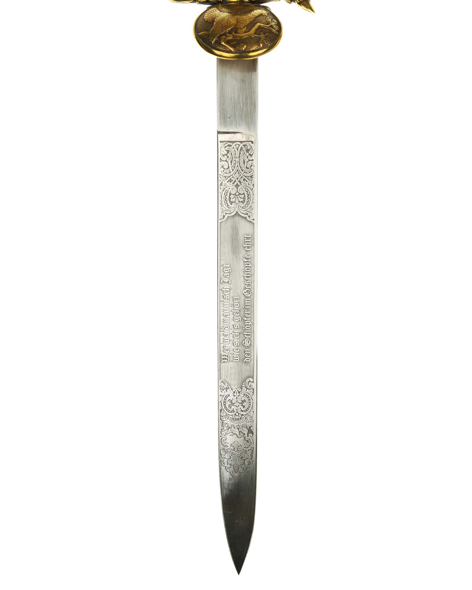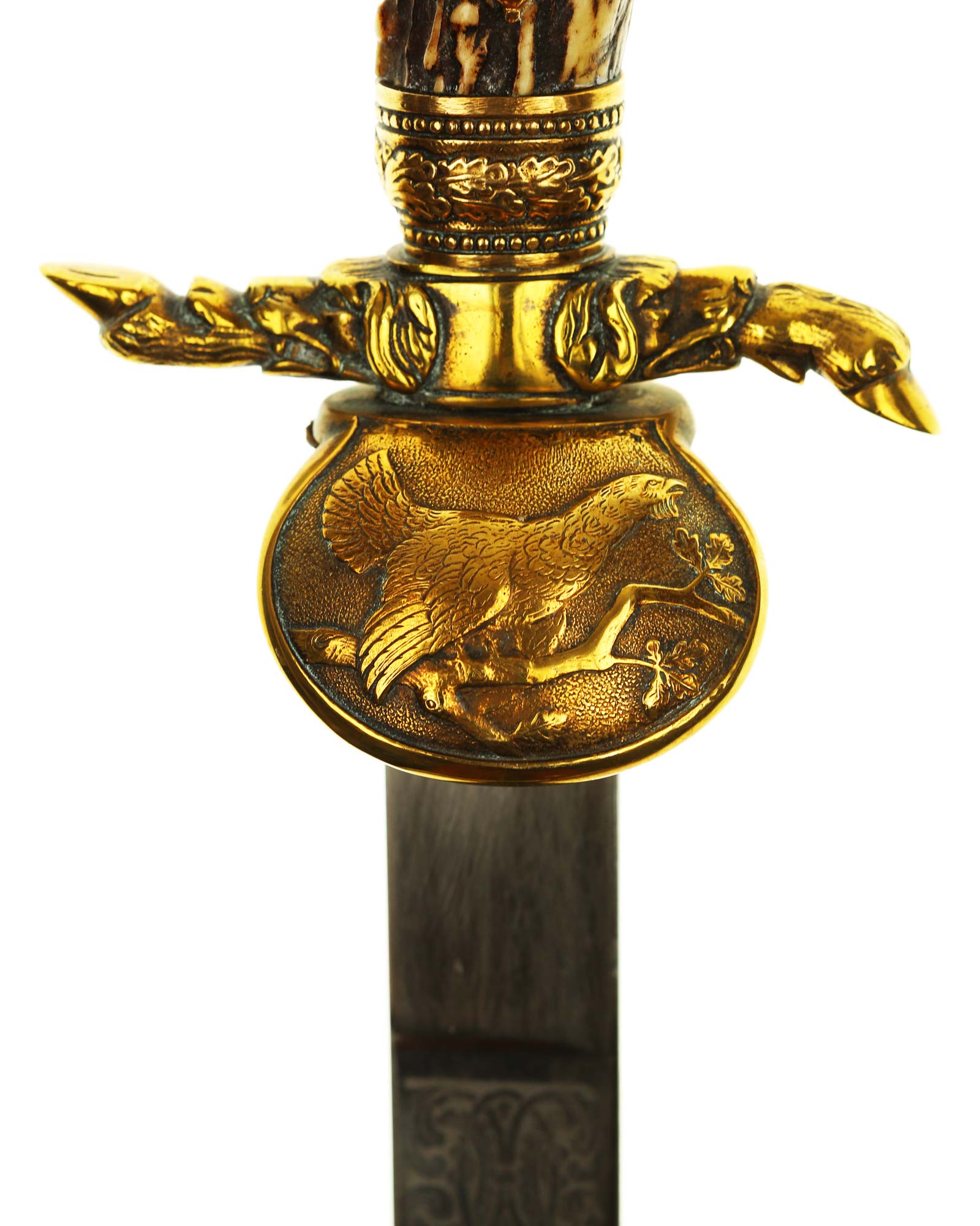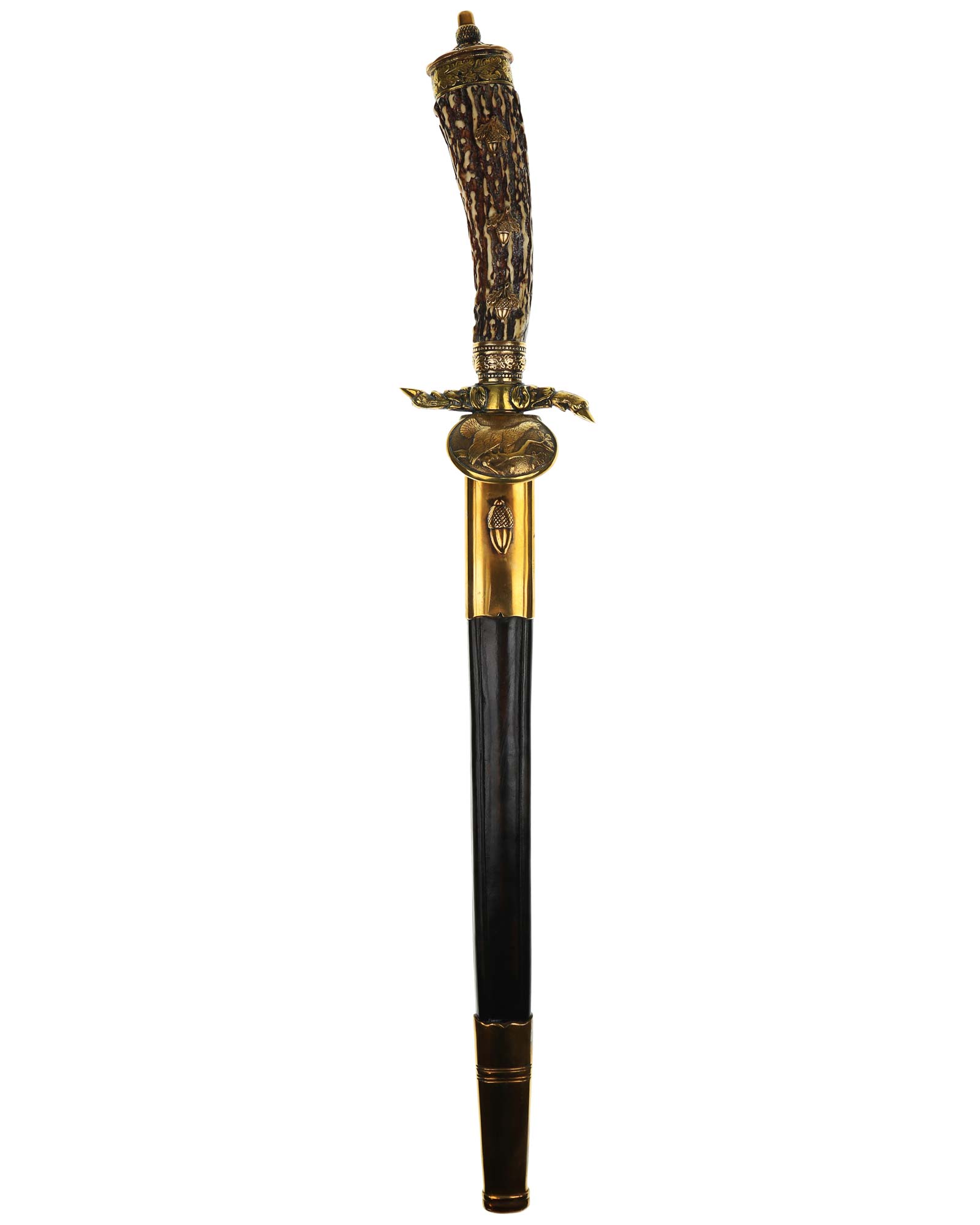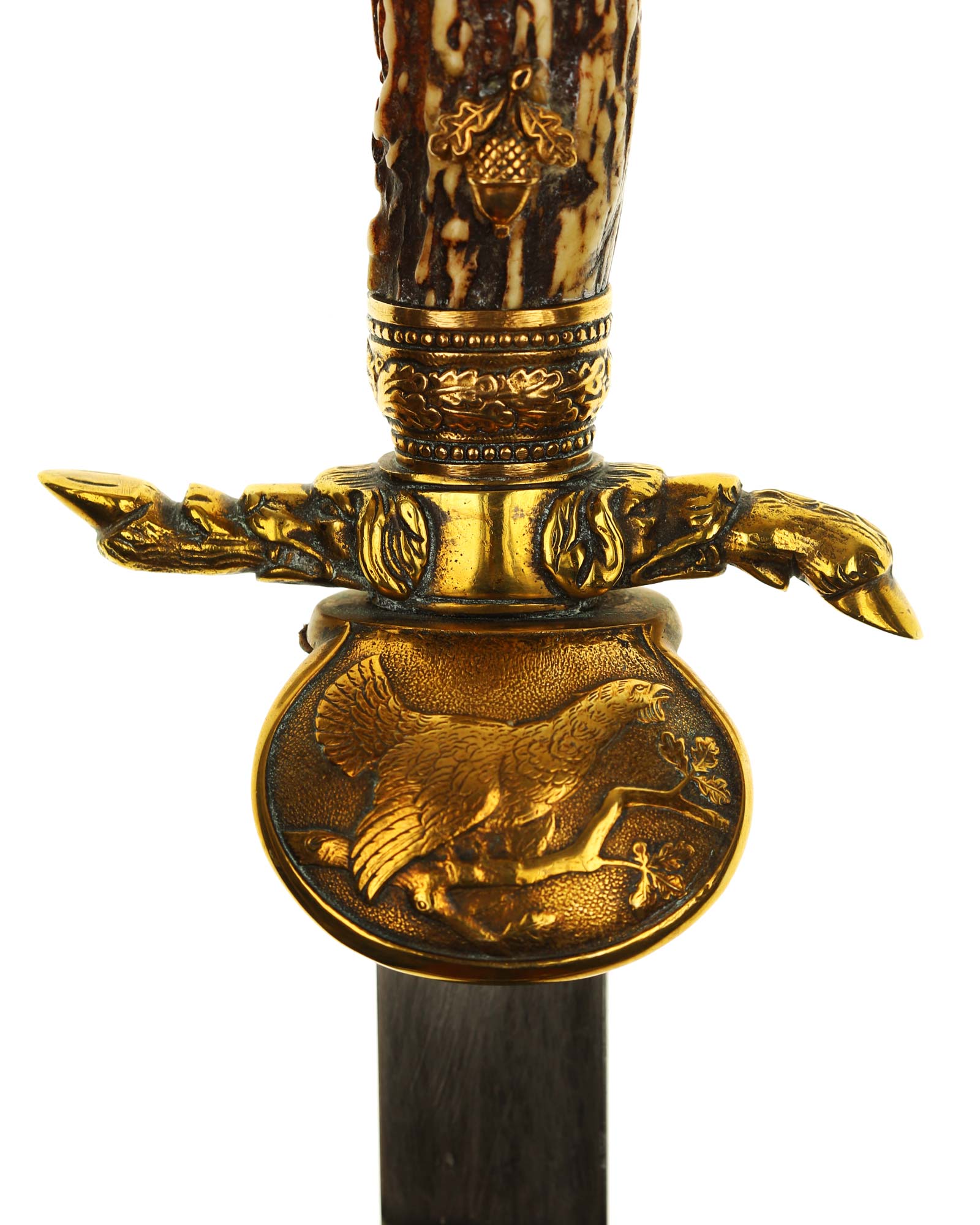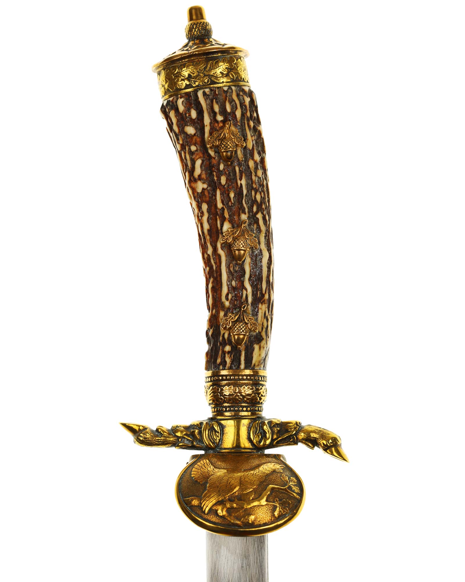 German Hunting Cutlass «Werwaidmannisch Jagt» in Near Mint condition, engraved blade. Retains original leather washer. The fittings all retain almost all of their lacquer with the exception of some wear to the cross guard. Beautiful stag grip handle. Blade with inscription: Werwaidmannisch Jagt wie sich's gehört den Schöpfer im Geschöpfe ehrt. Reverse with maker mark: P.D. Lüneschloss Solingen.
