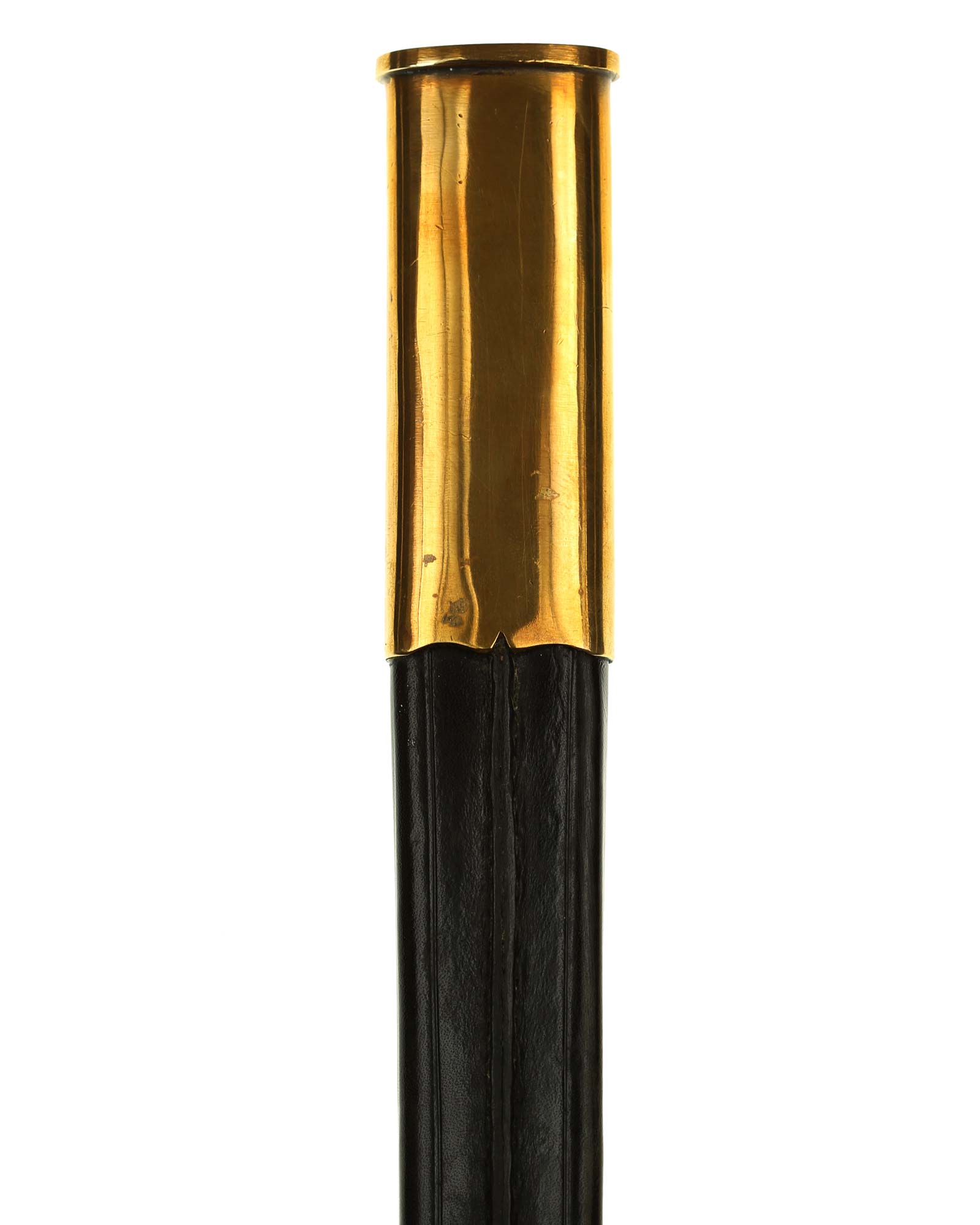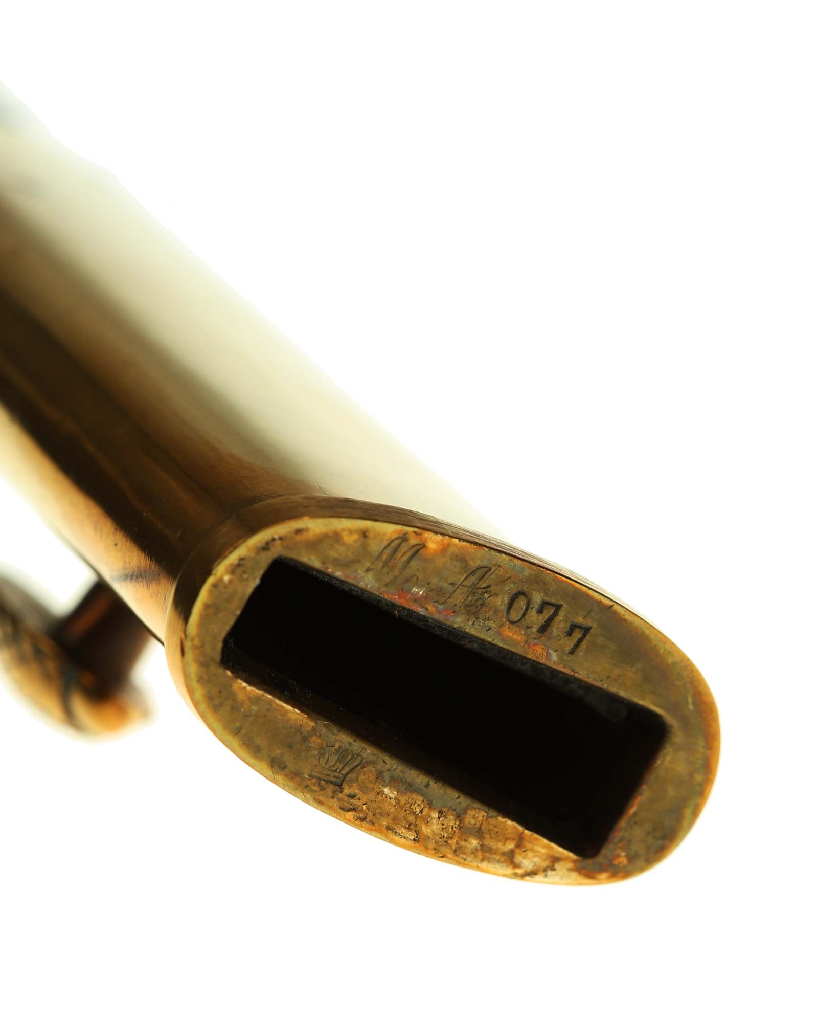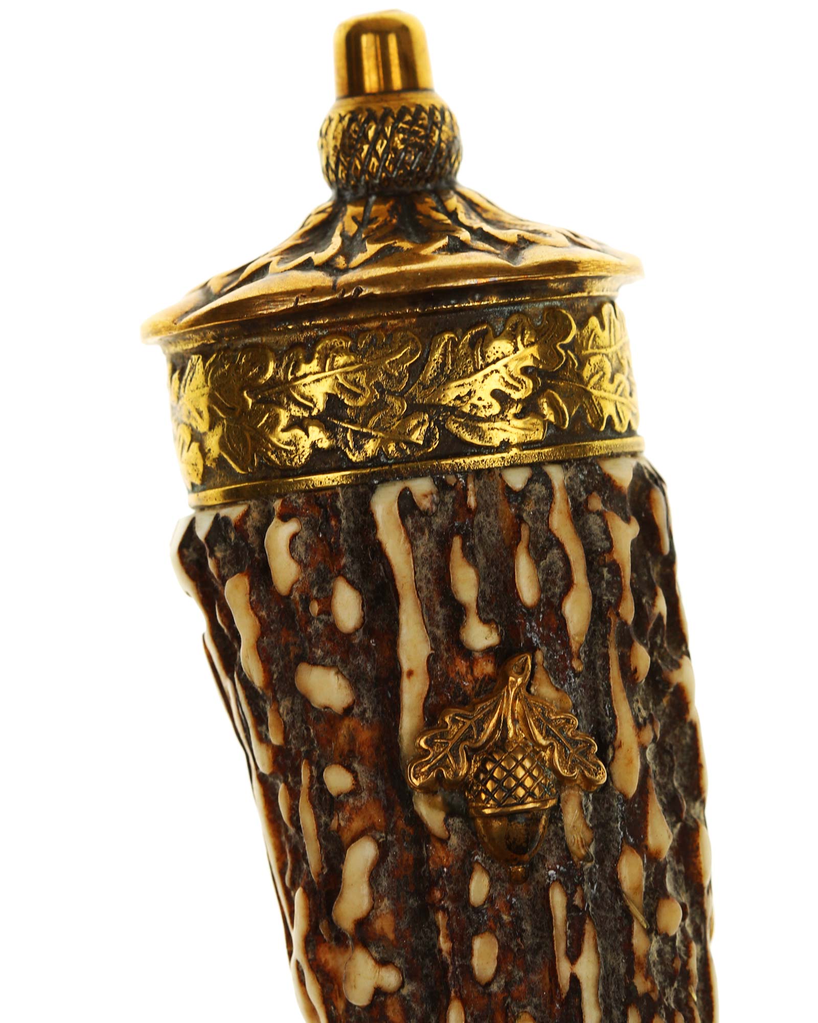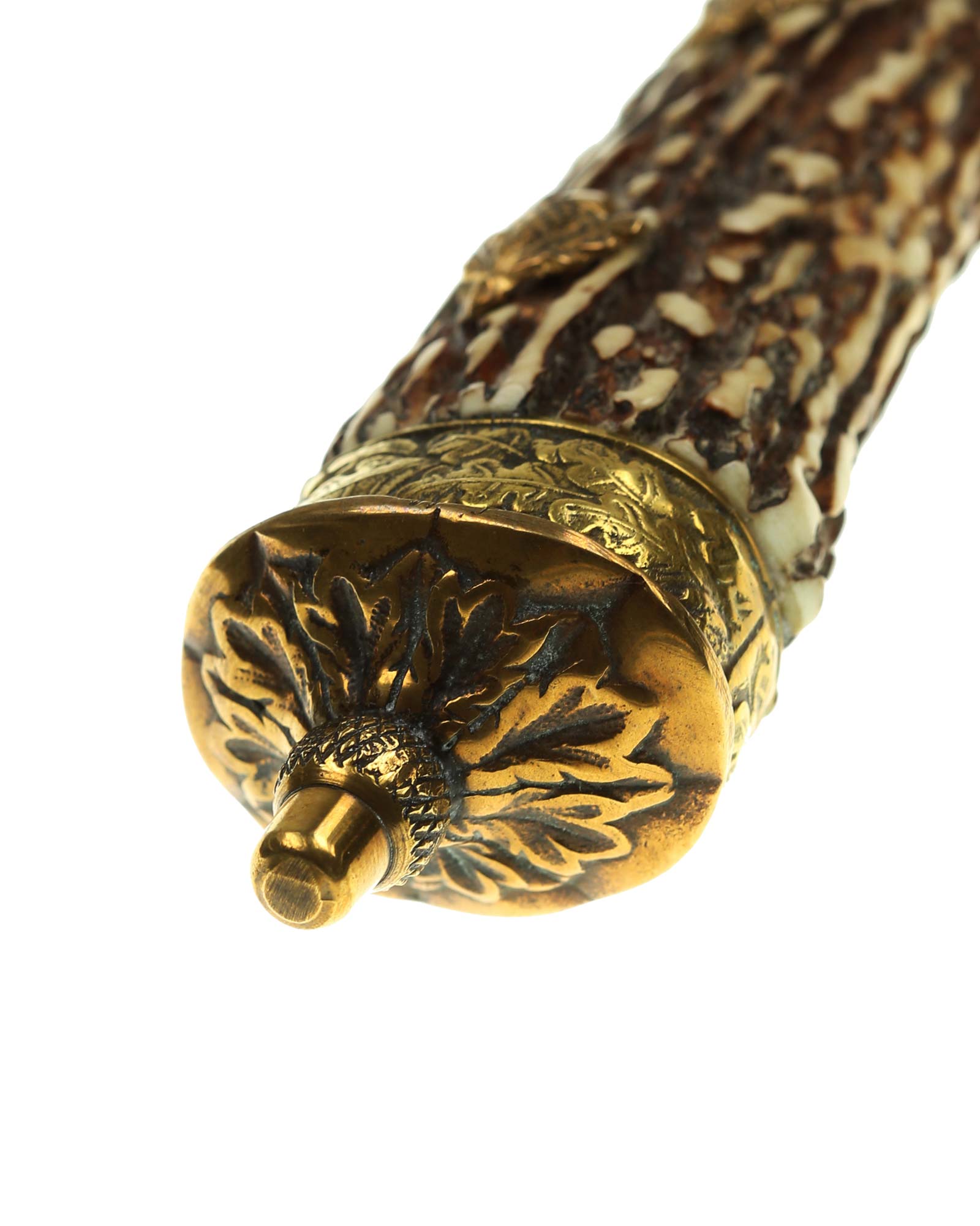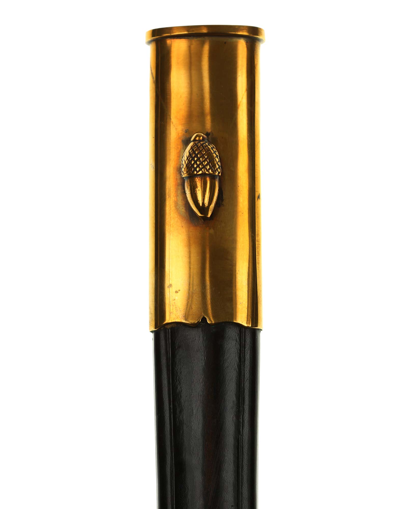 German Hunting Cutlass «Werwaidmannisch Jagt» in Near Mint condition, engraved blade. Retains original leather washer. The fittings all retain almost all of their lacquer with the exception of some wear to the cross guard. Beautiful stag grip handle. Blade with inscription: Werwaidmannisch Jagt wie sich's gehört den Schöpfer im Geschöpfe ehrt. Reverse with maker mark: P.D. Lüneschloss Solingen.