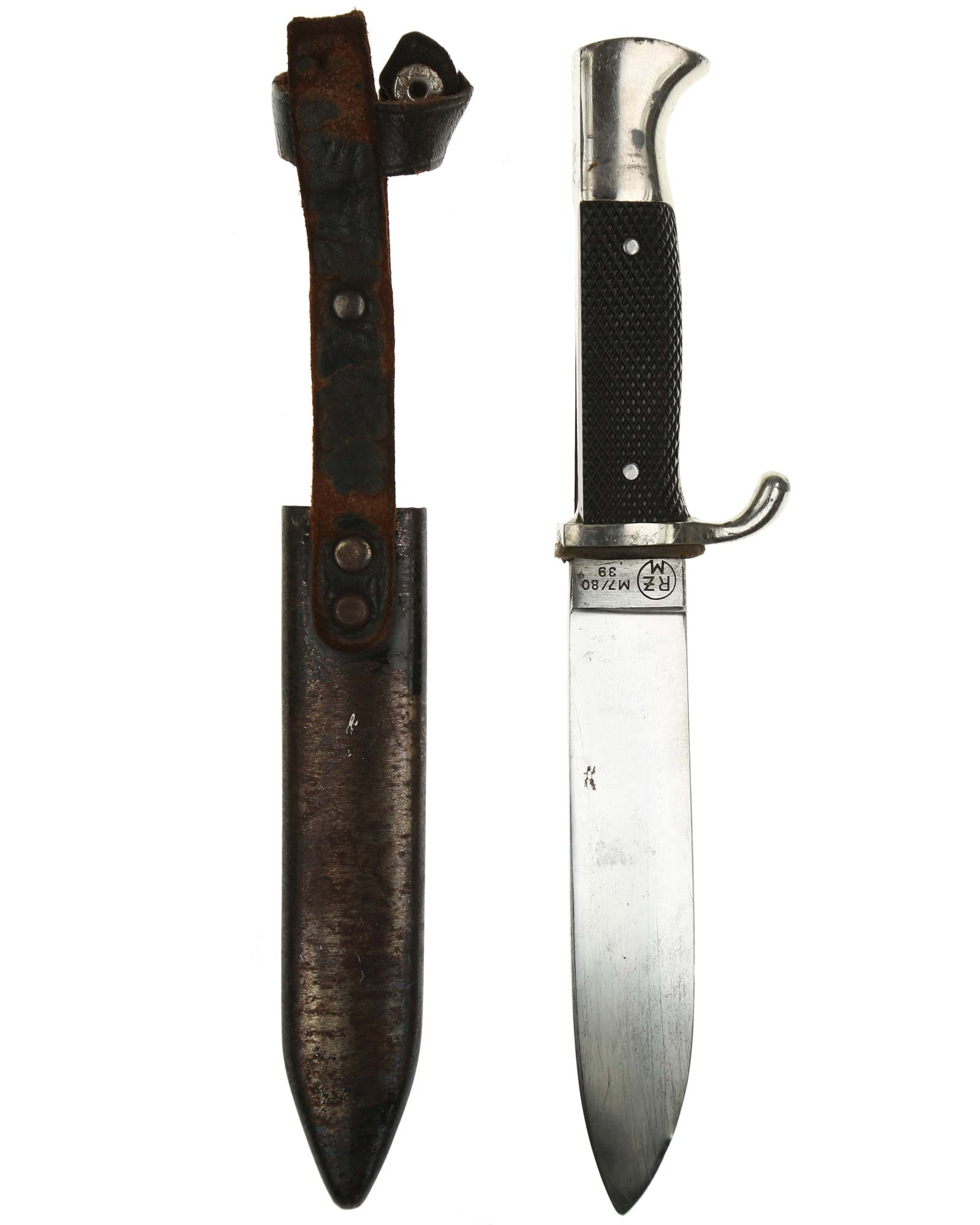 This Hitler Youth Knife is a Late-period Model (1940-1942). The total length is 25,2 cm. The Knife has the RZM Code: M7/80 (Gustav Spitzer Solingen).