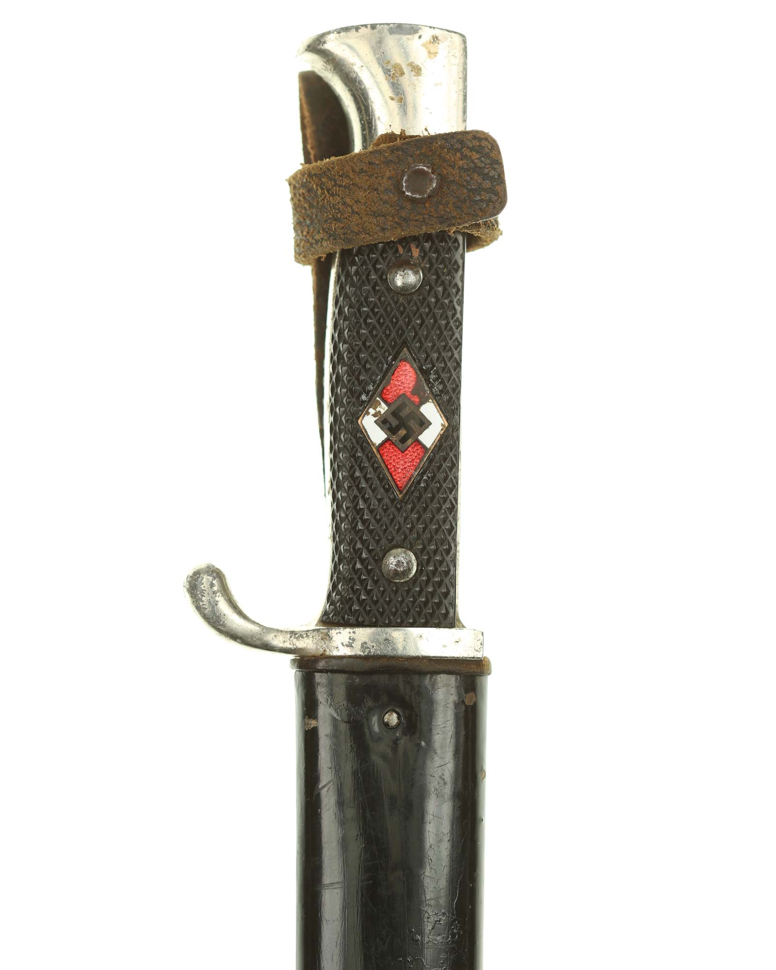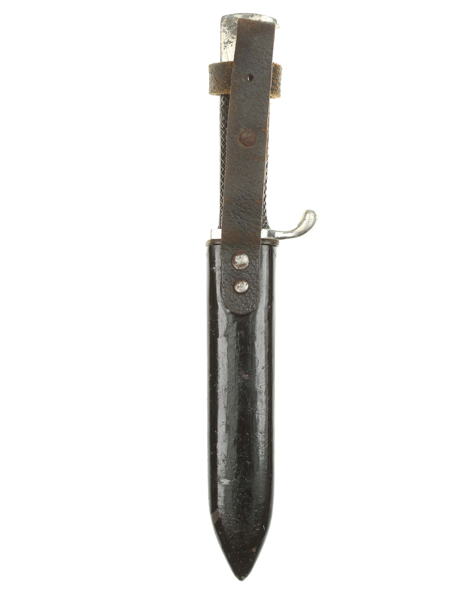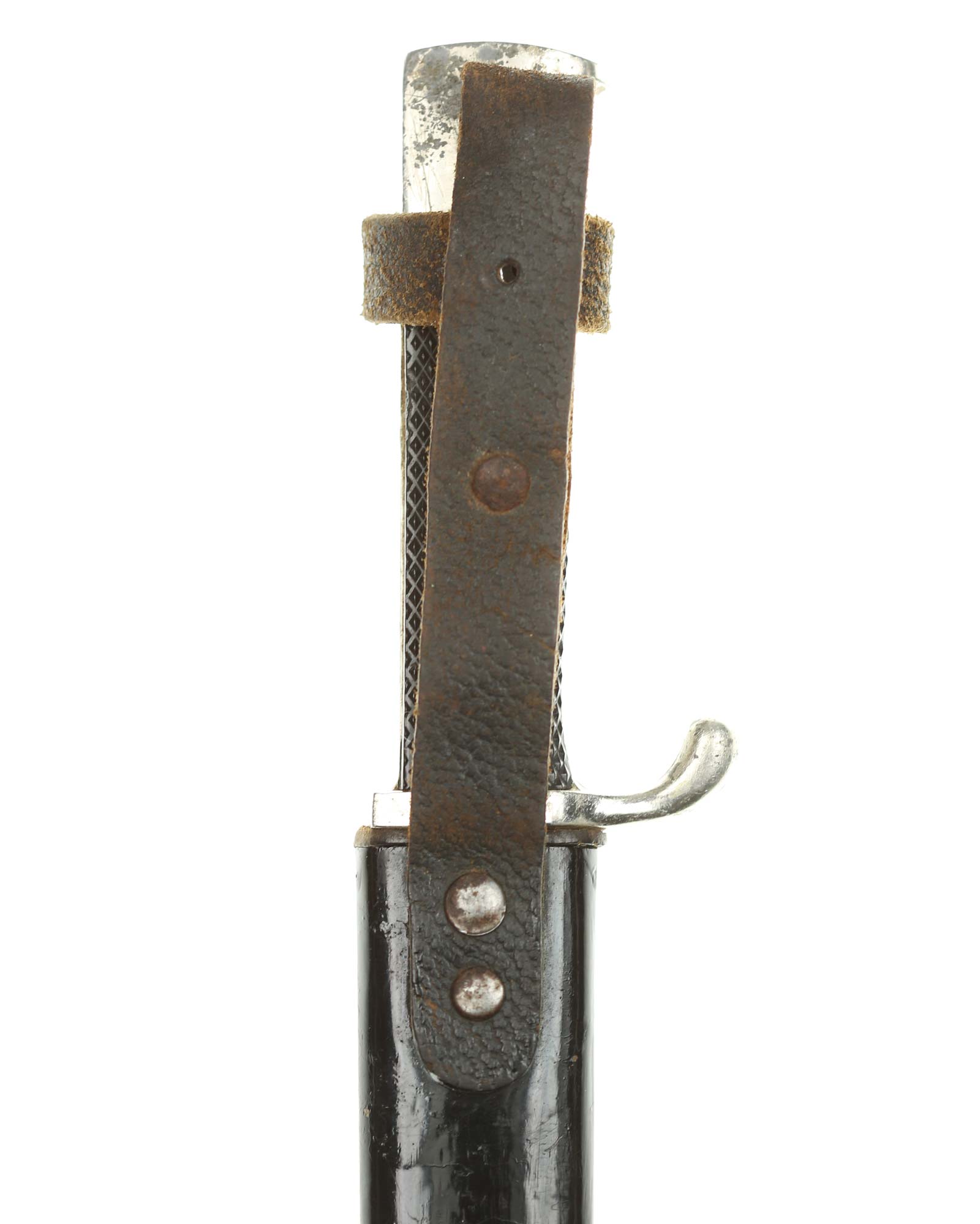 Scabbard: The scabbard shell has good, black paint. This paint has a few mild age spots spread evenly throughout the surface. Attached to the scabbard is an excellent leather hanger.