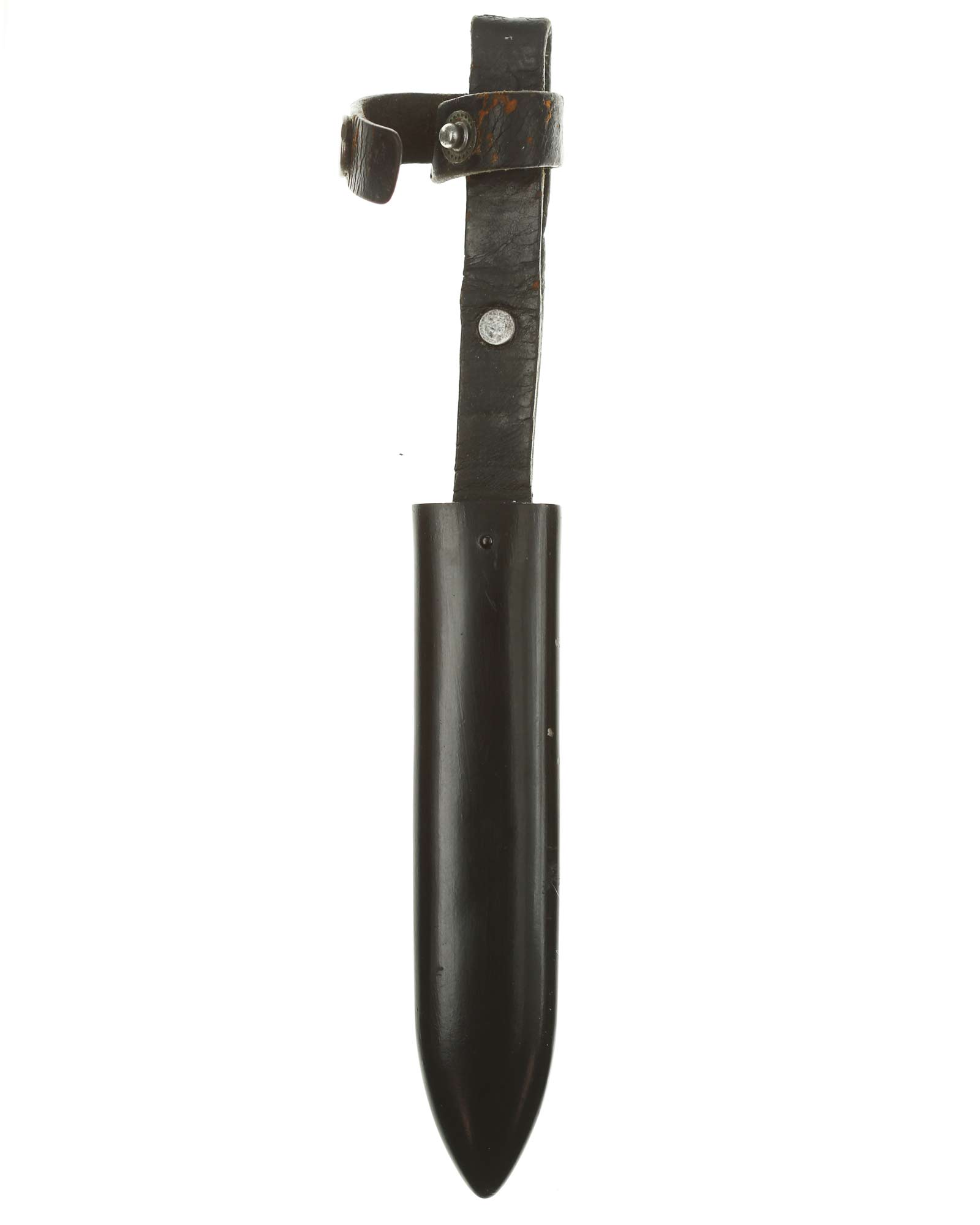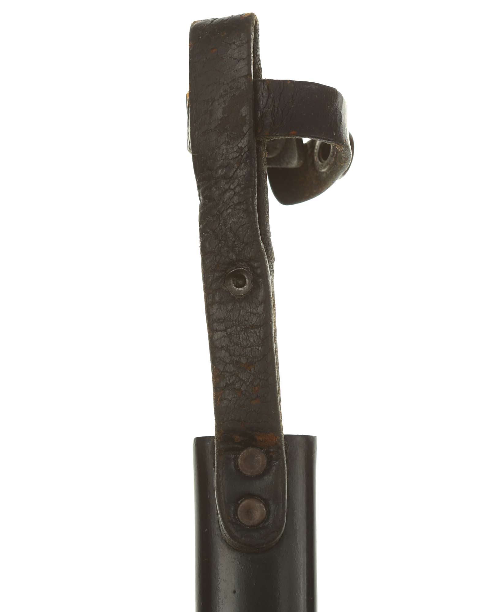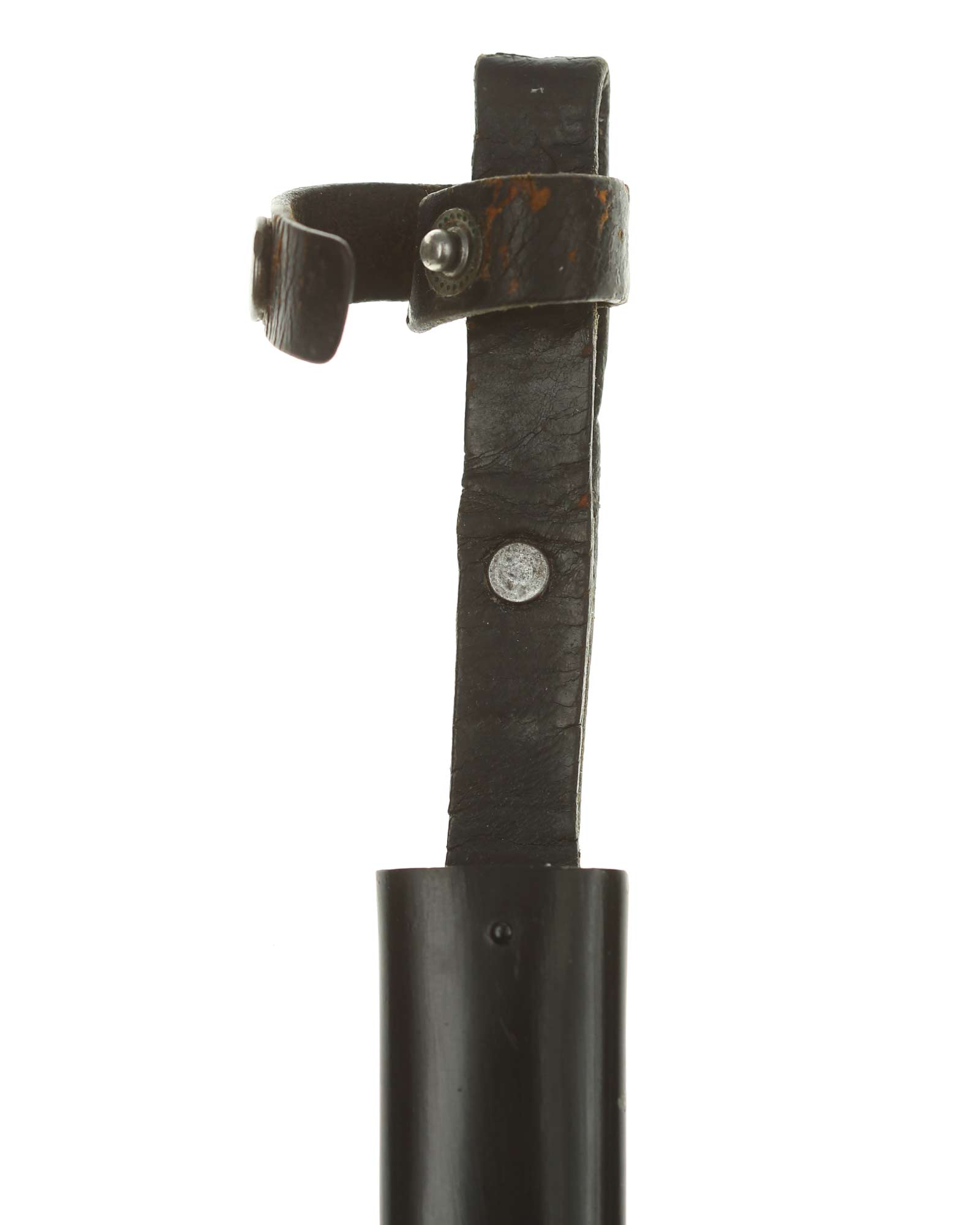 Scabbard: The scabbard shell has good, black paint. This paint has a few mild age spots spread evenly throughout the surface. Attached to the scabbard is an excellent leather hanger.