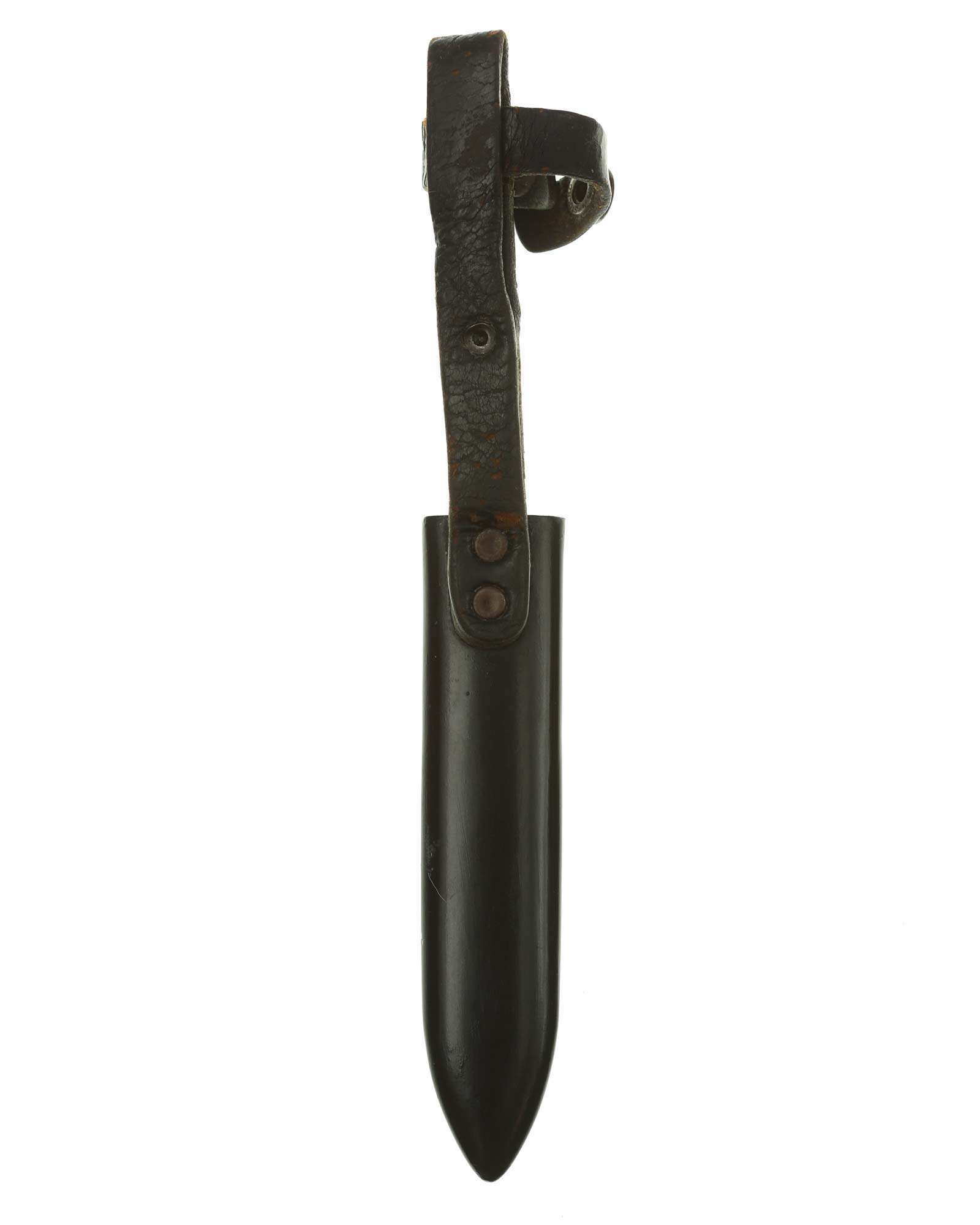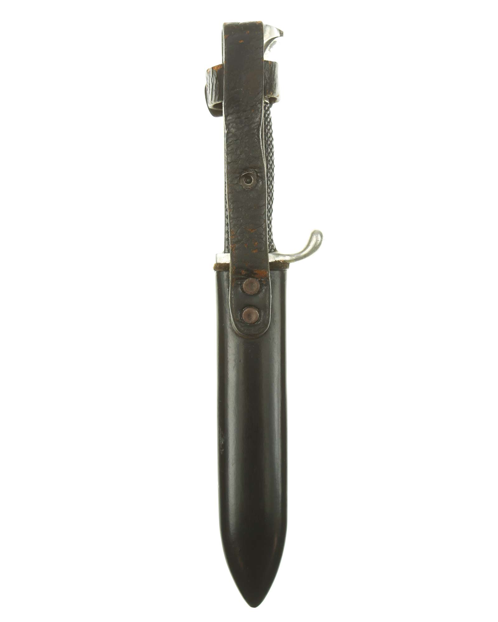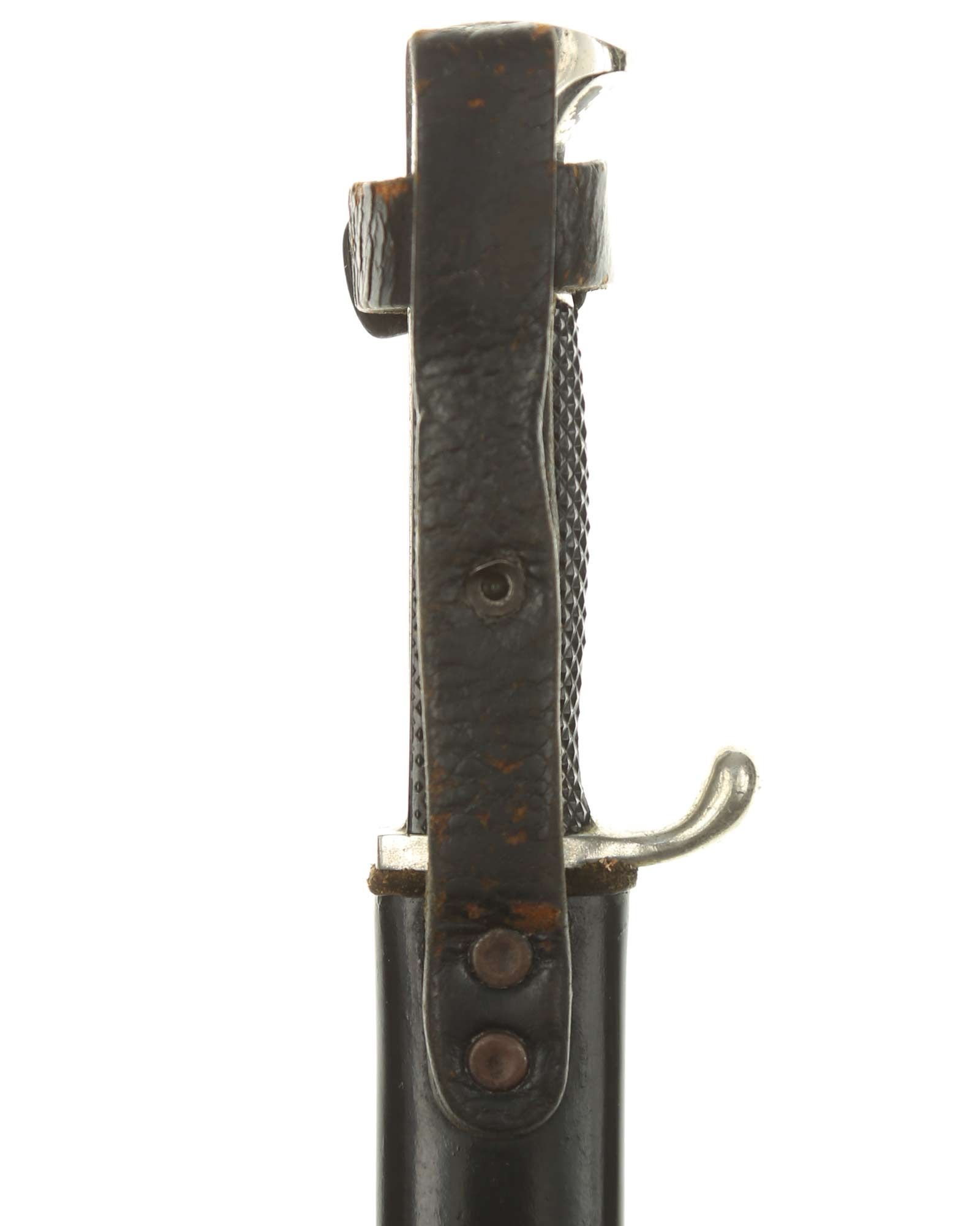 Scabbard: The scabbard shell has good, black paint. This paint has a few mild age spots spread evenly throughout the surface. Attached to the scabbard is an excellent leather hanger.