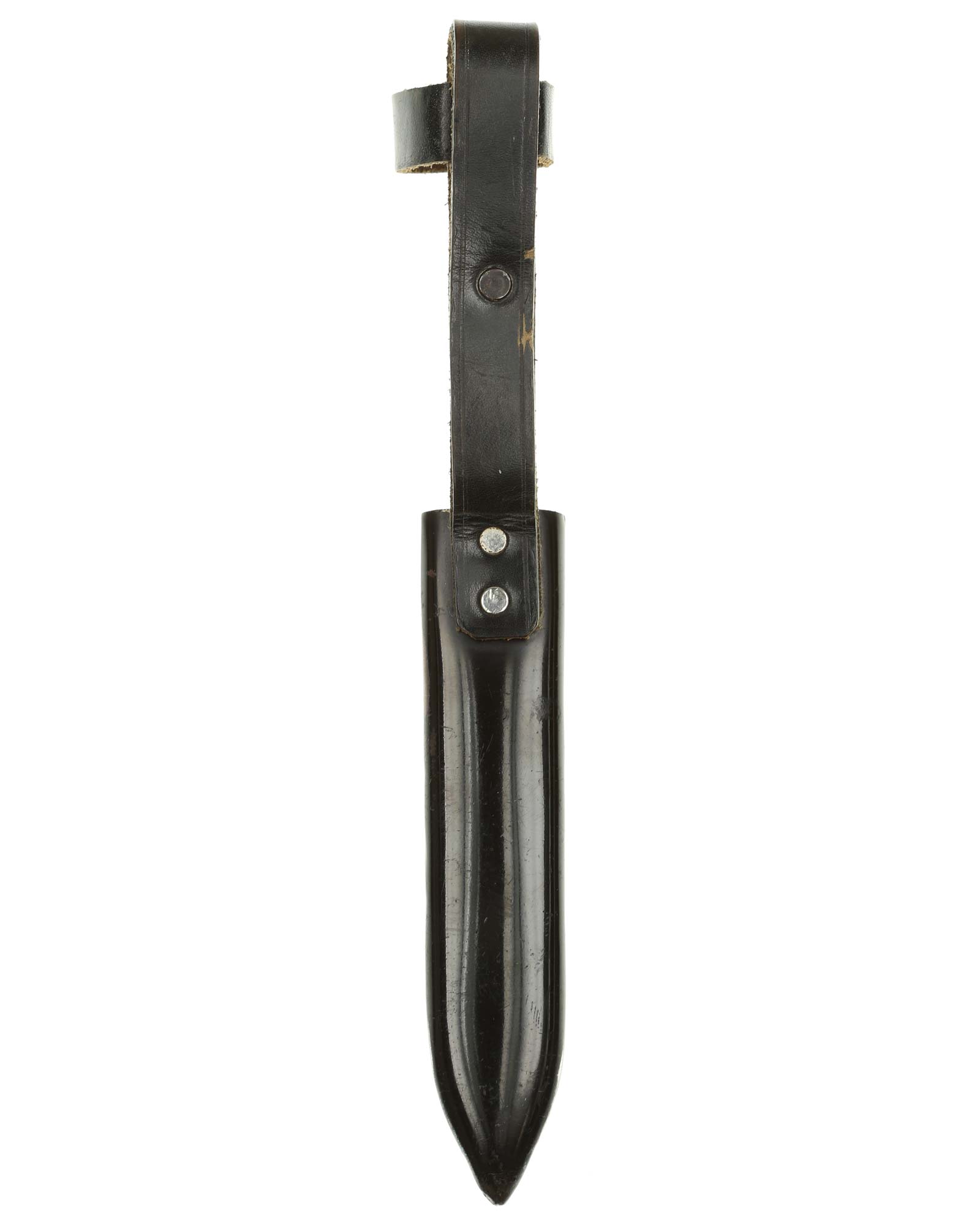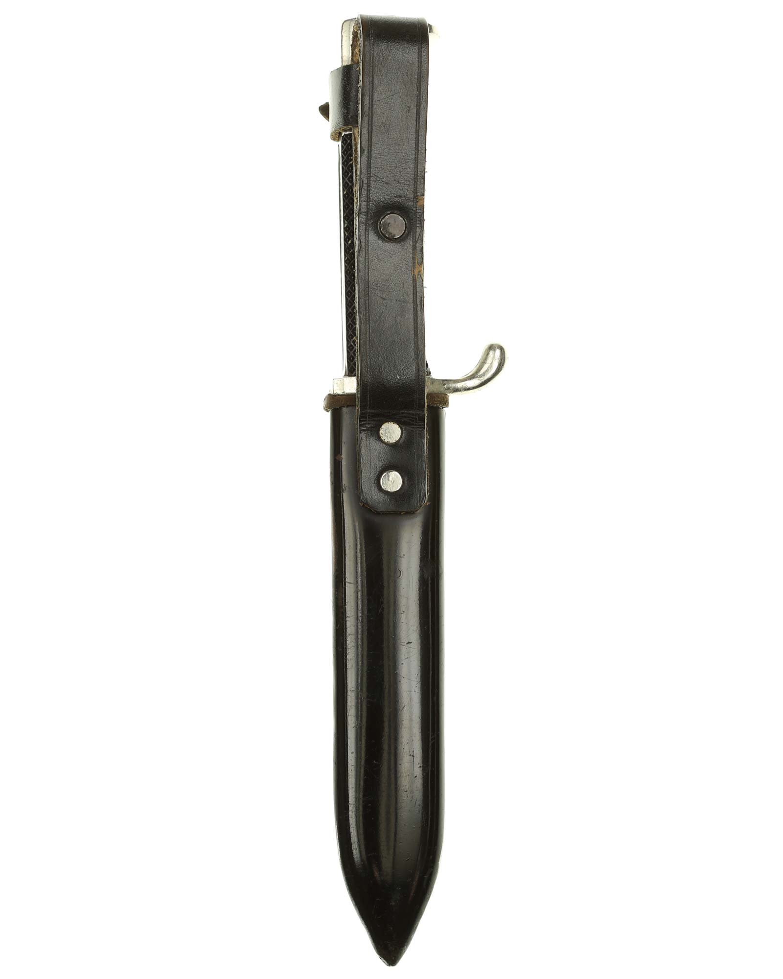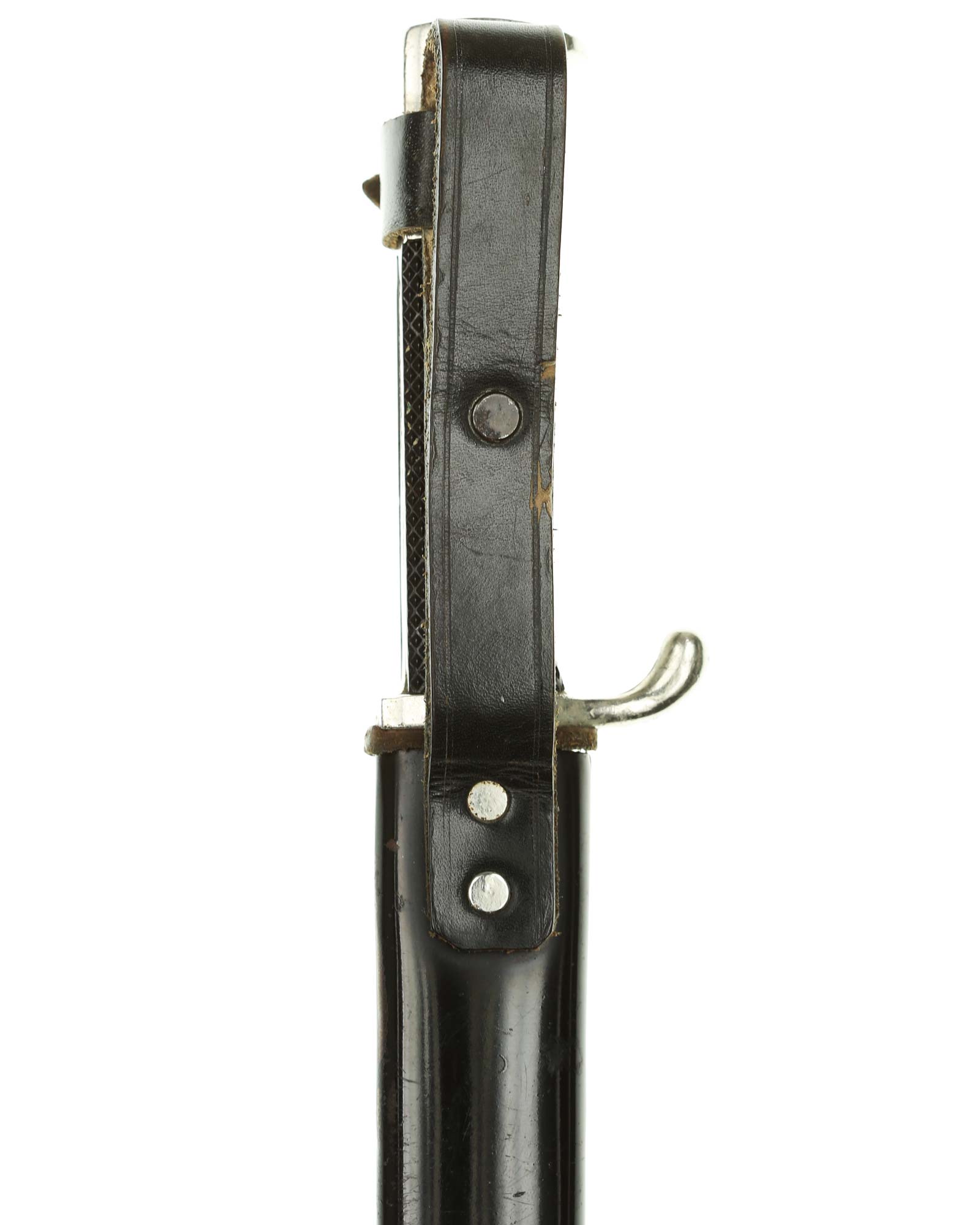 Scabbard: The scabbard shell has good, black paint. This paint has a few mild age spots spread evenly throughout the surface. Attached to the scabbard is an excellent leather hanger.