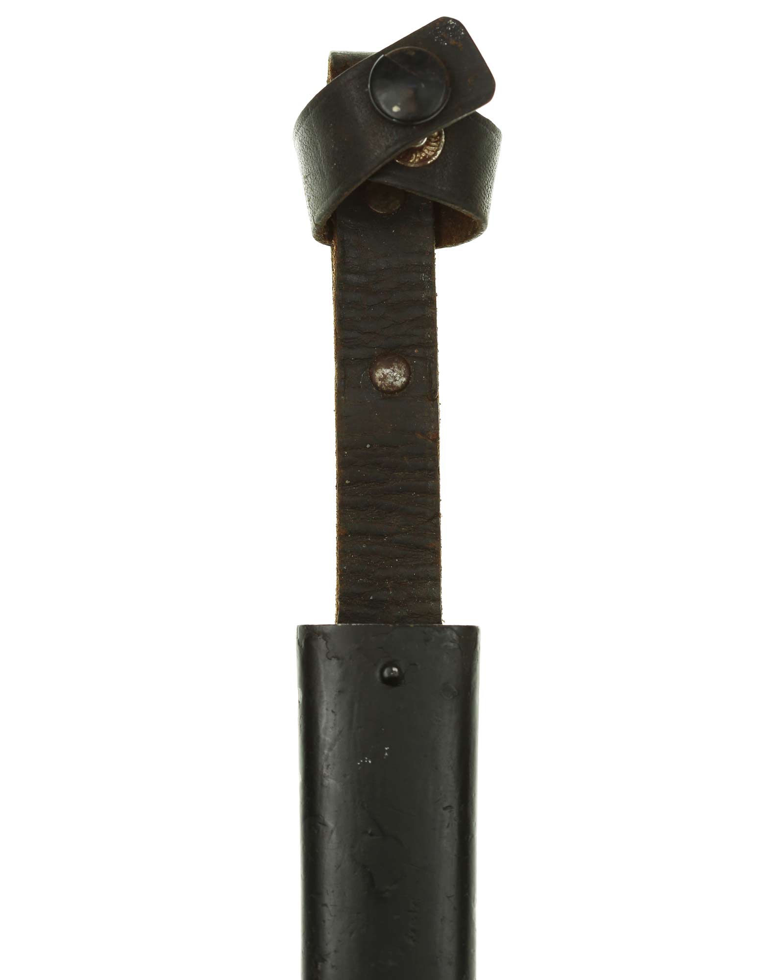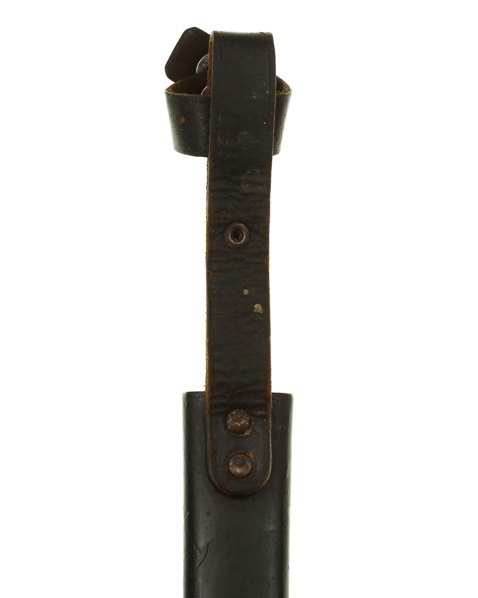 Scabbard: The scabbard shell has good, black paint. This paint has a few mild age spots spread evenly throughout the surface. Attached to the scabbard is an excellent leather hanger.