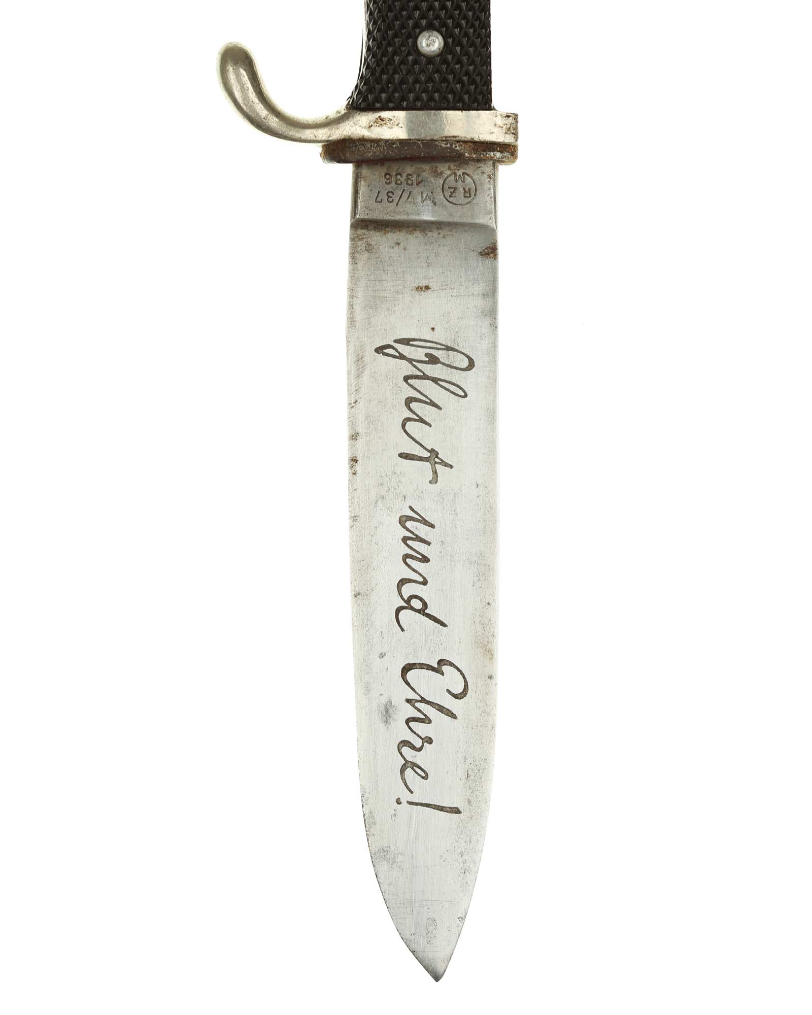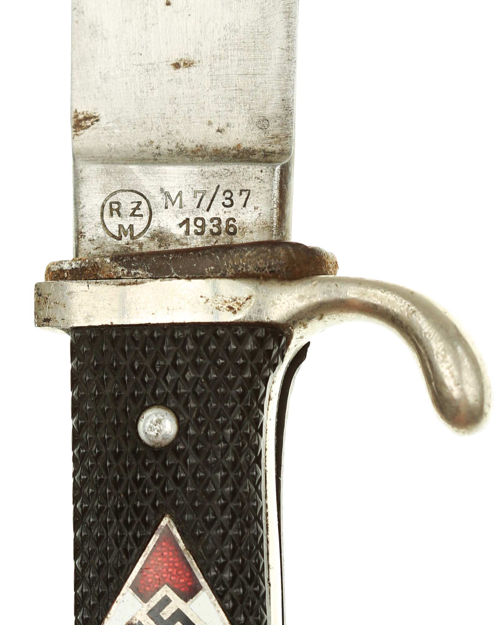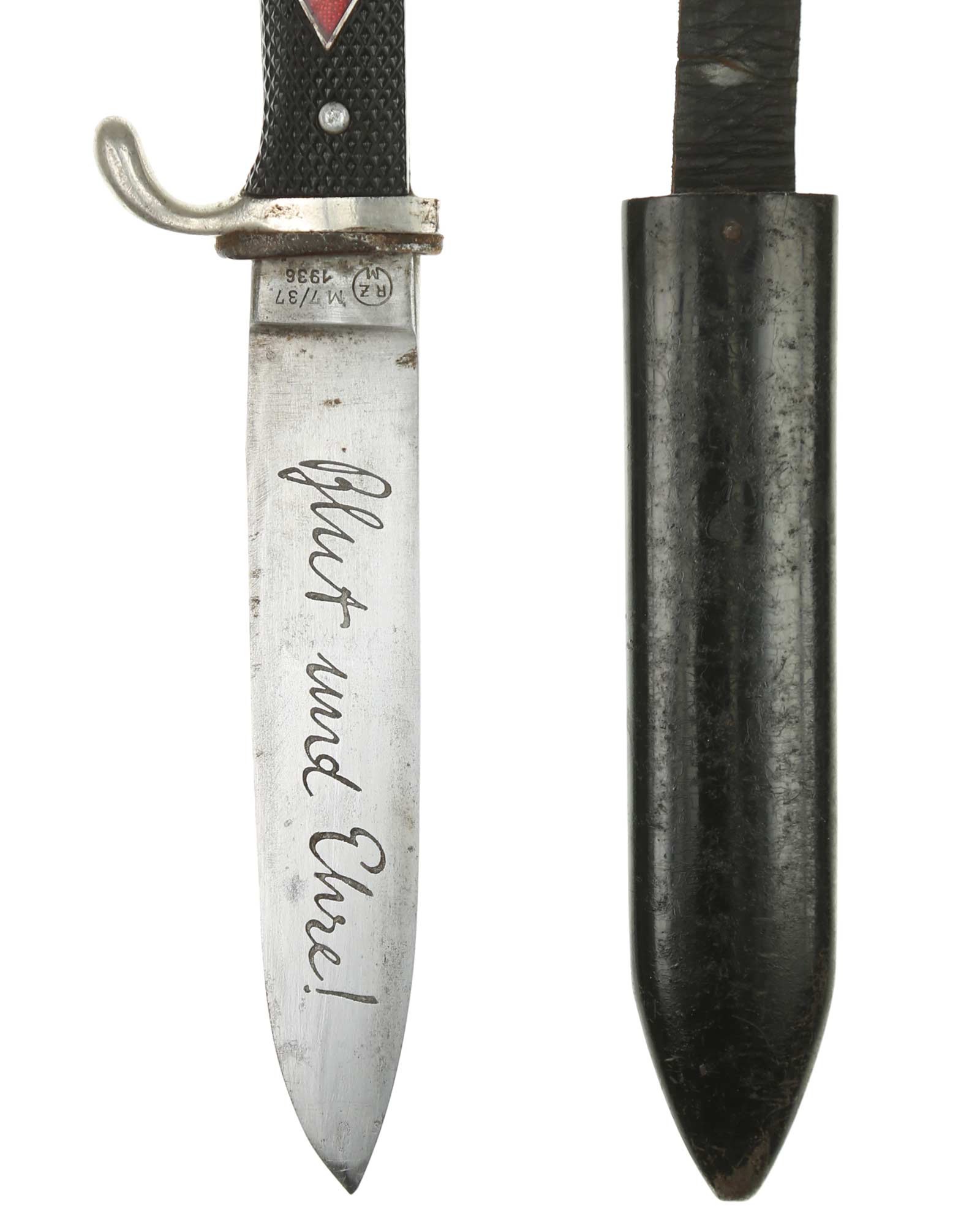 This Hitler Youth Knife is with Motto. Model 1936-1938 [Mid-period]. The total length is 25,5 cm. The Knife has the RZM maker mark on the blade: RZM M7/37 (Robert Klaas Solingen).