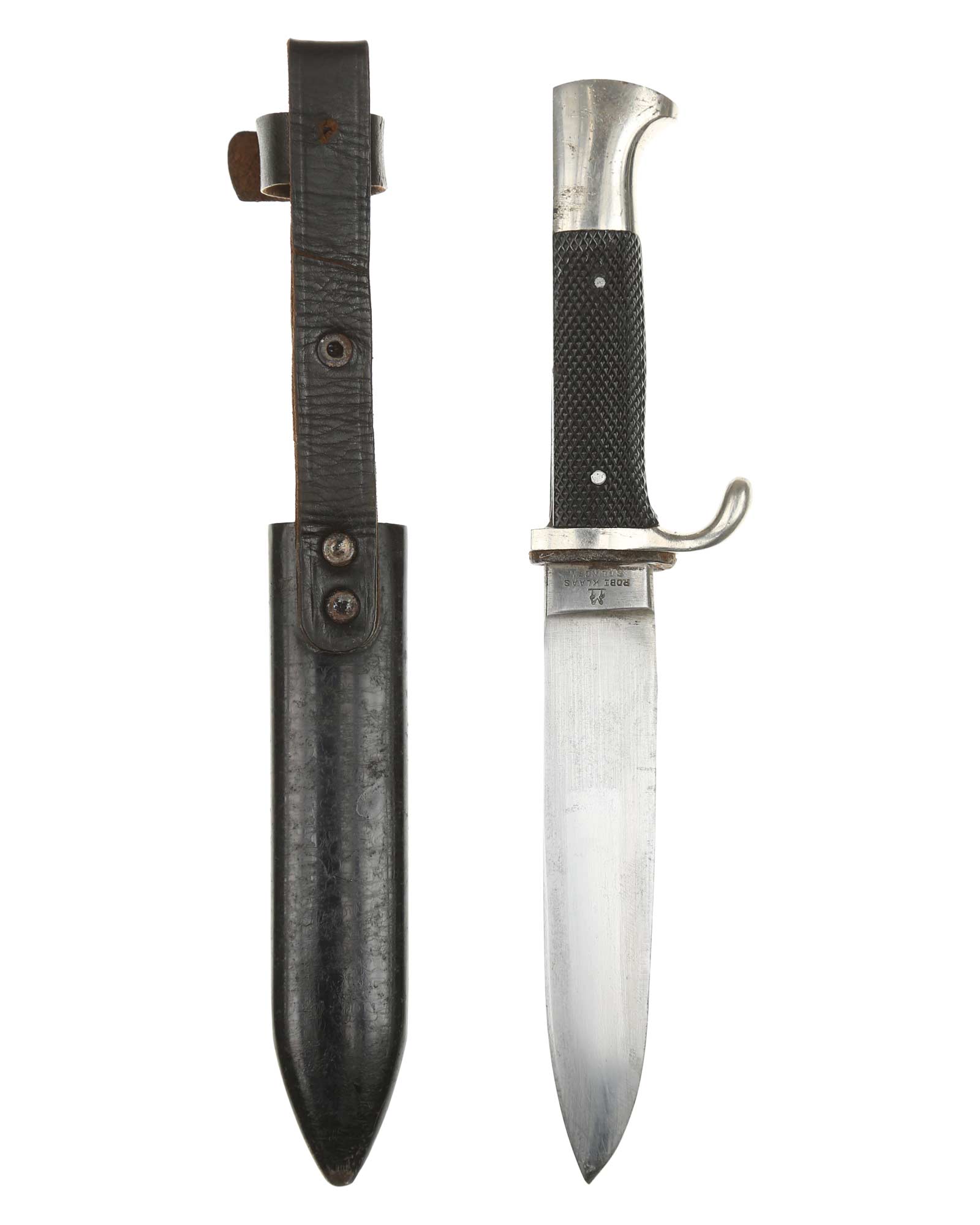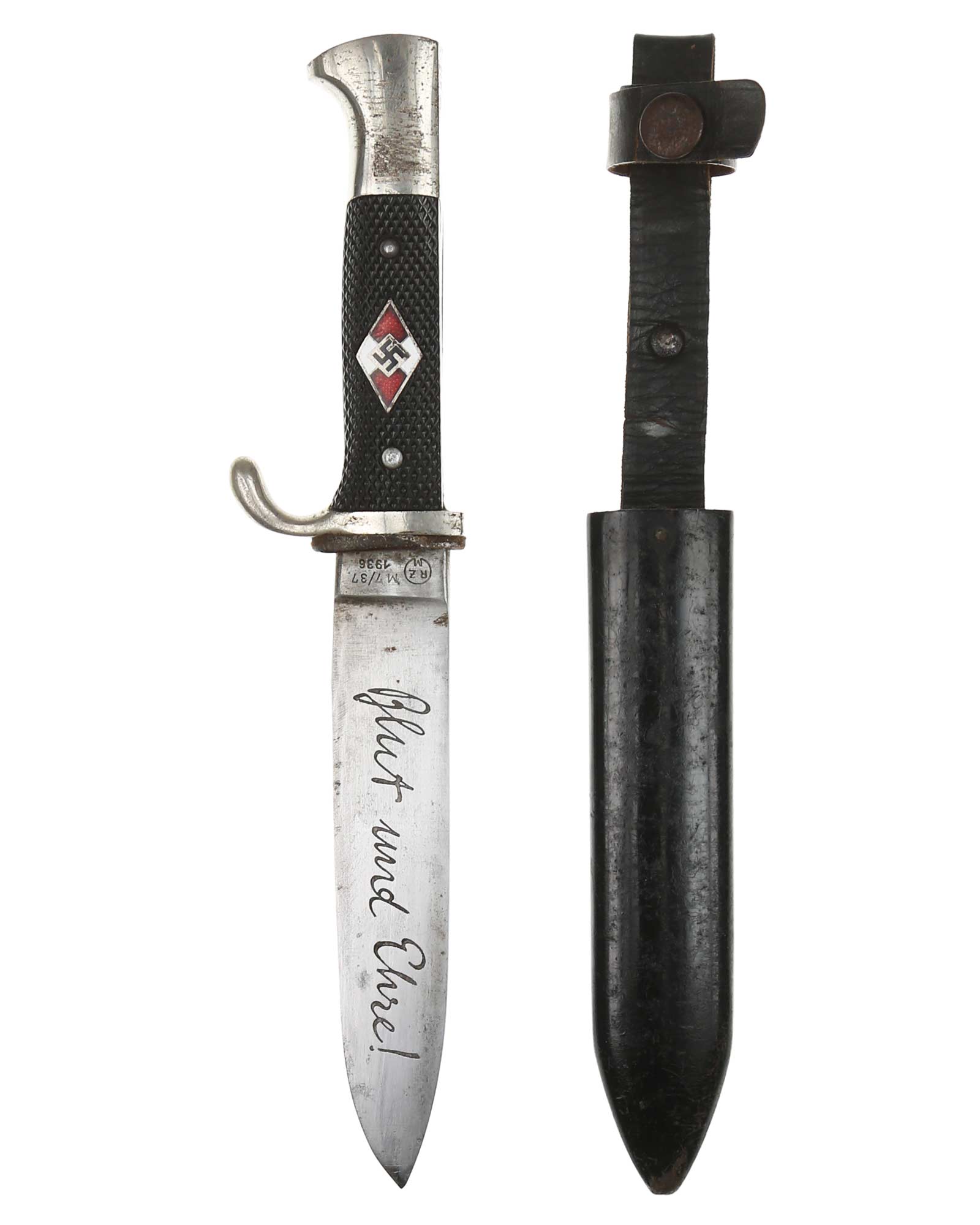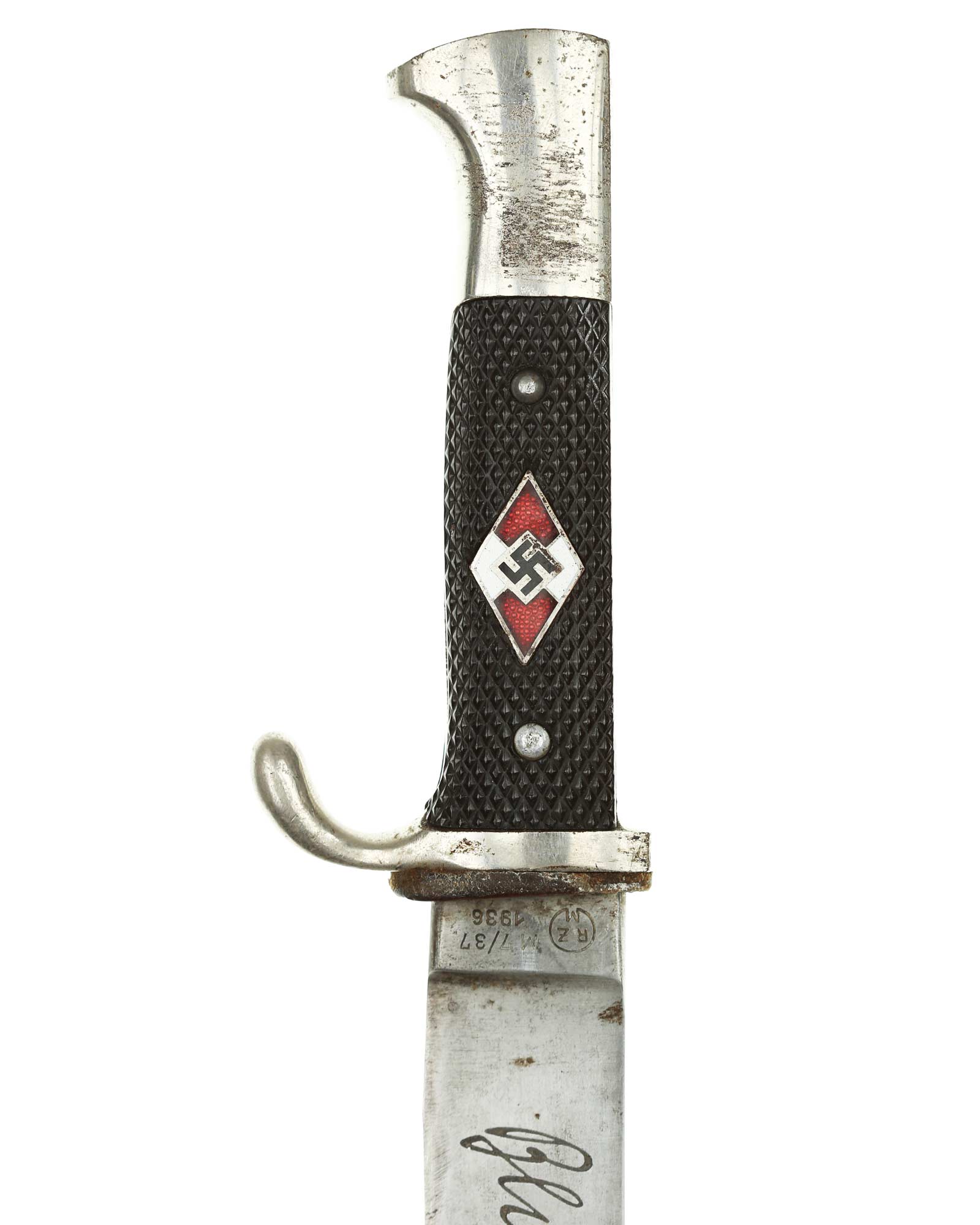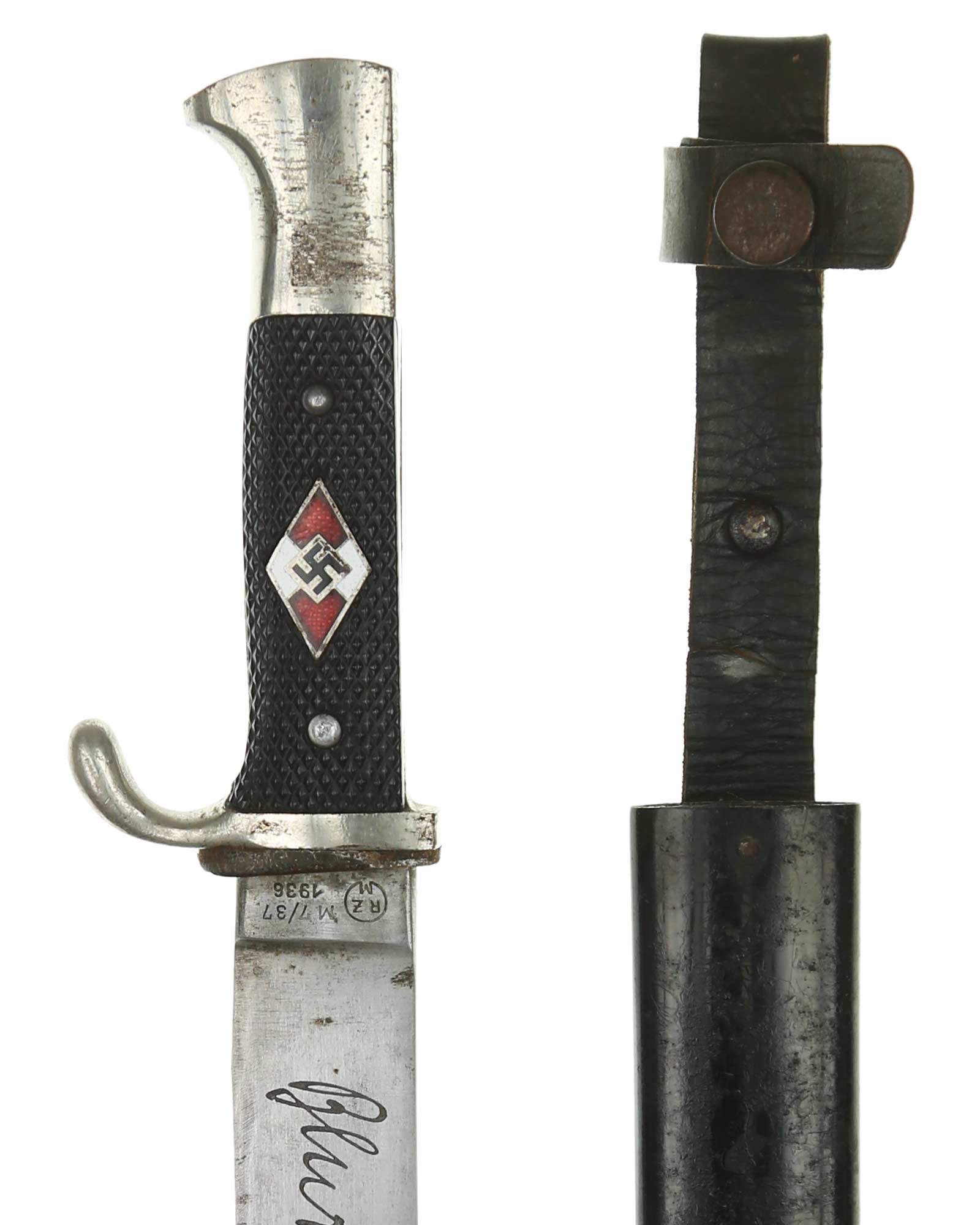This Hitler Youth Knife is with Motto. Model 1936-1938 [Mid-period]. The total length is 25,5 cm. The Knife has the RZM maker mark on the blade: RZM M7/37 (Robert Klaas Solingen).