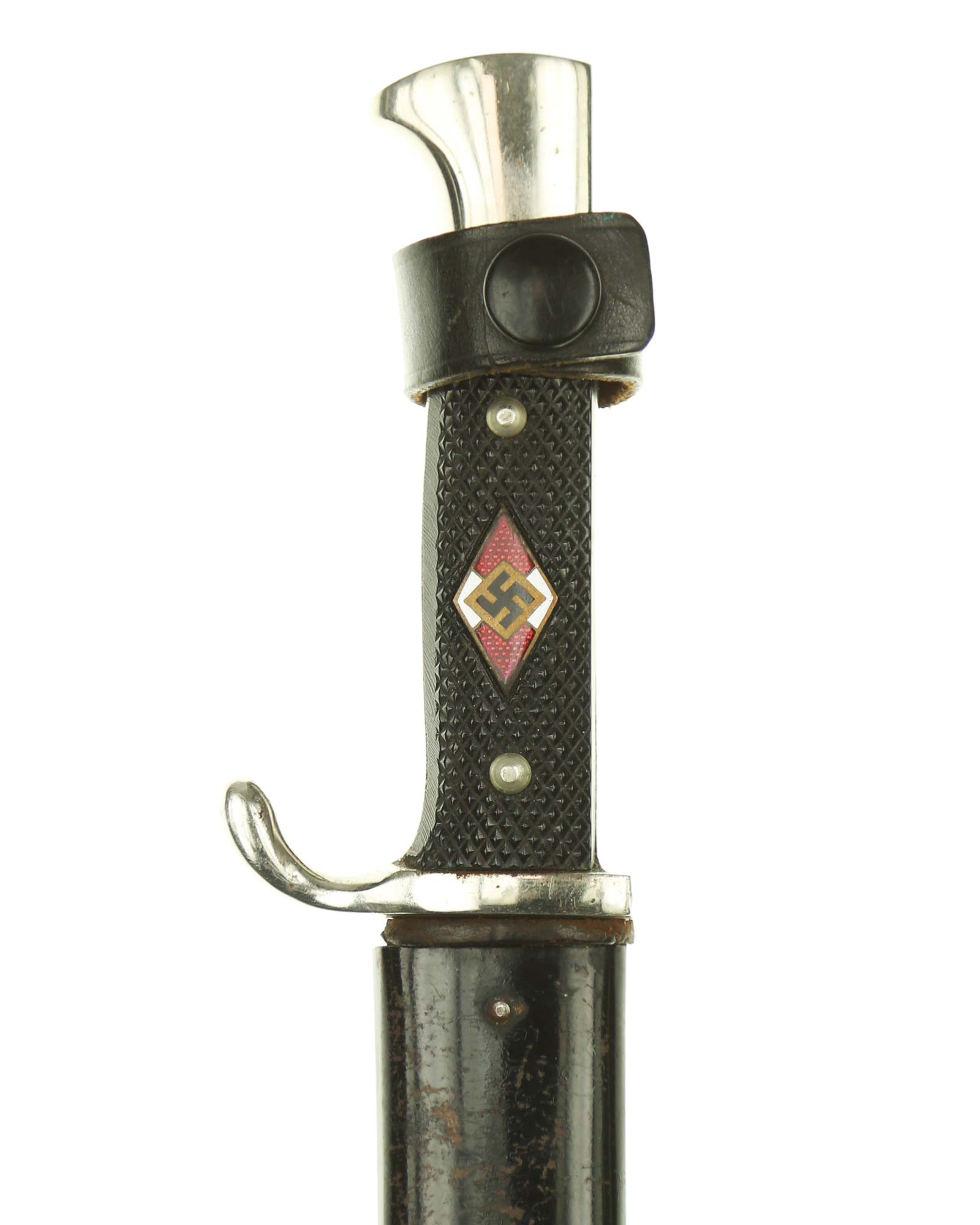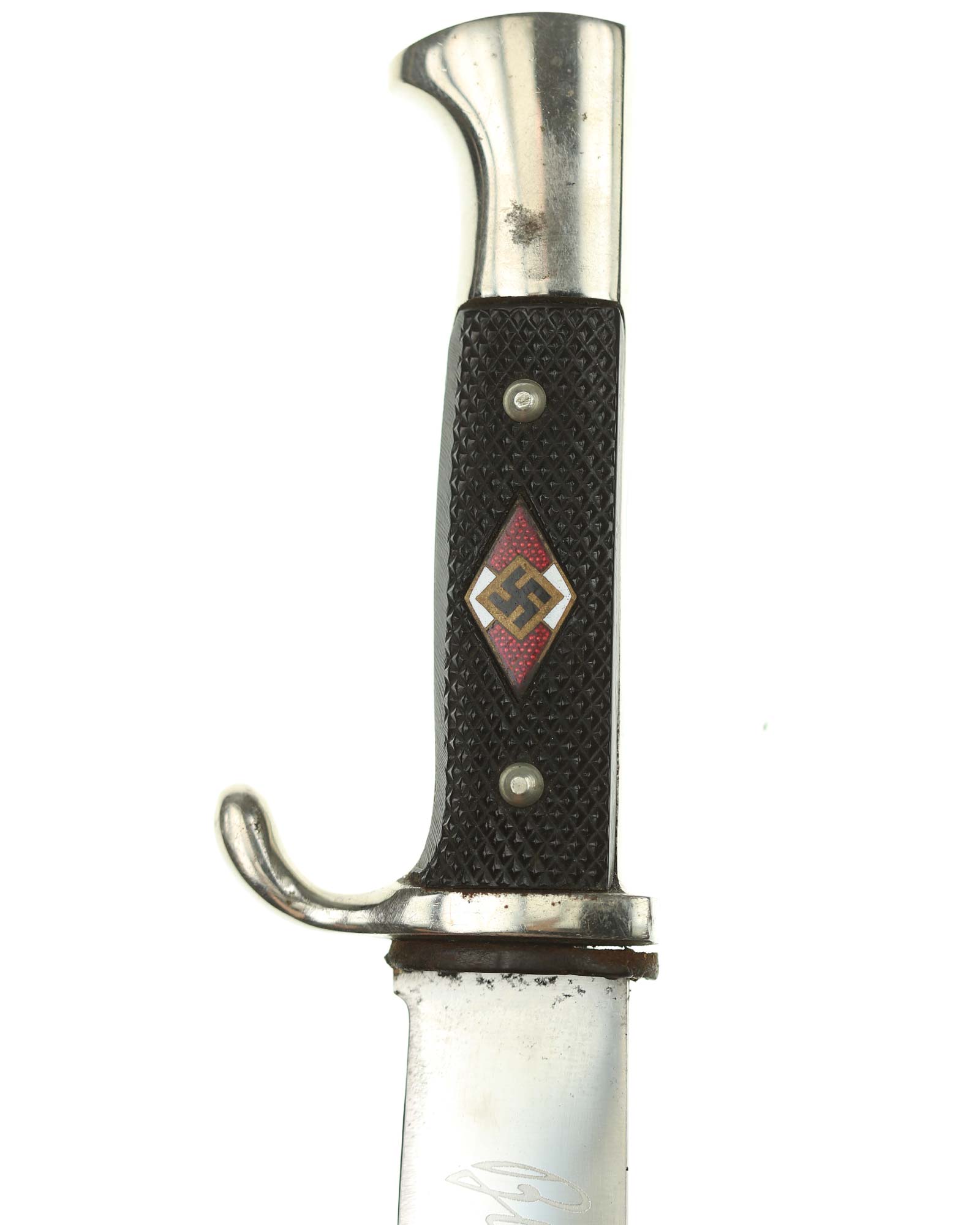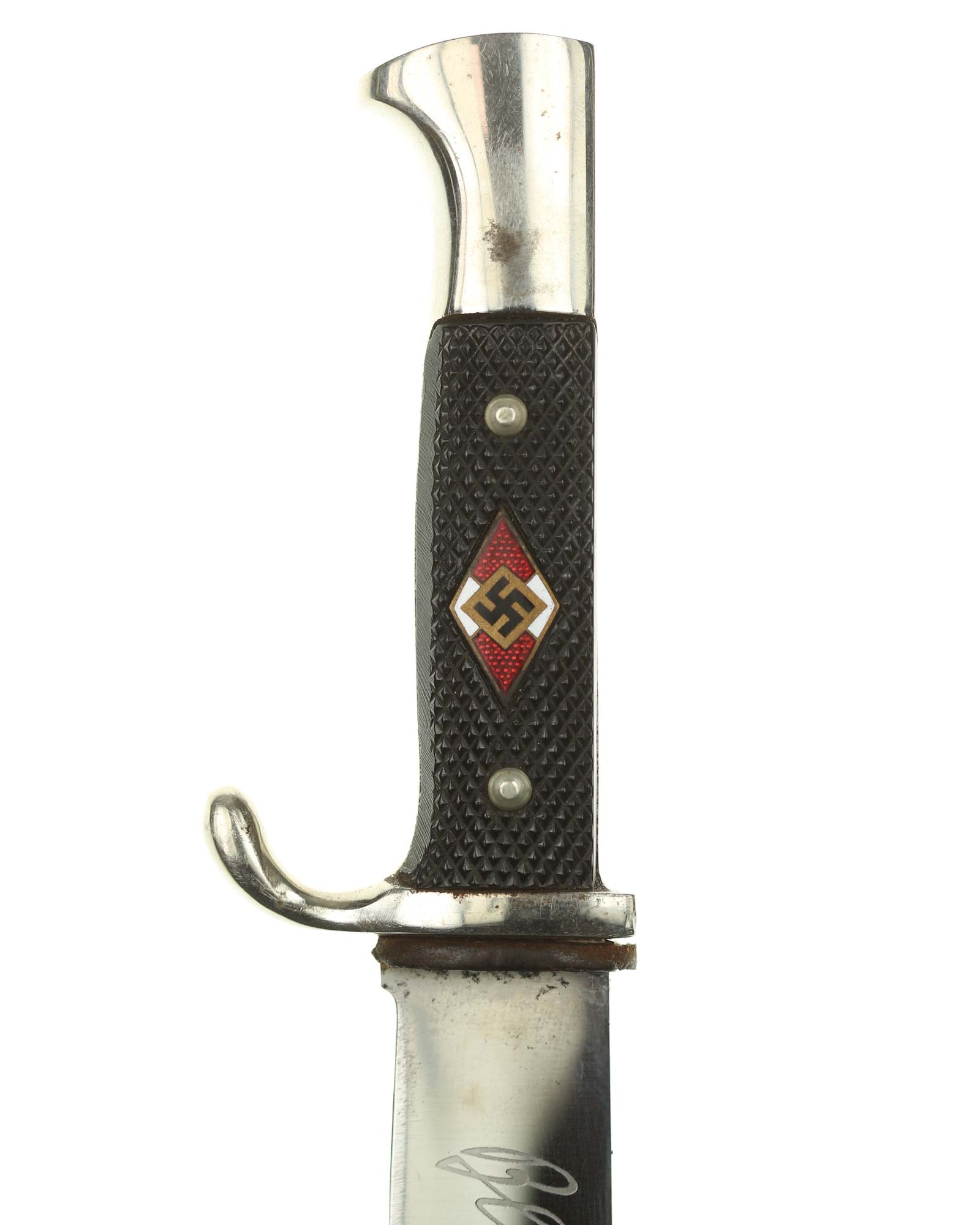 Grip: The grip plates are the early, finely checkered Bakelite type. They are in good condition, being retained by nickel rivets with dressed obverse heads. The enamel HJ insignia is in fine condition throughout.