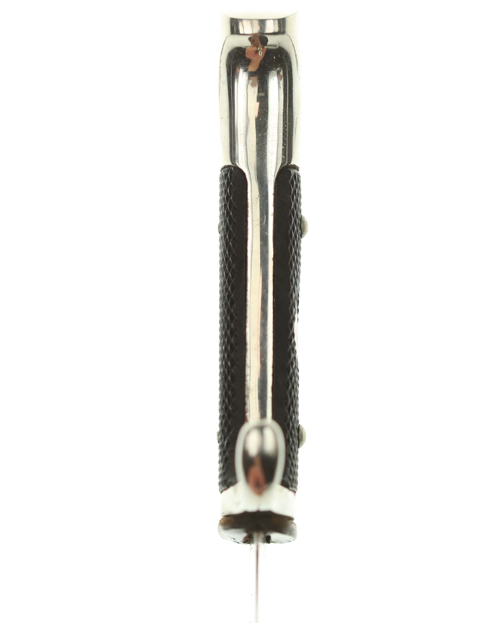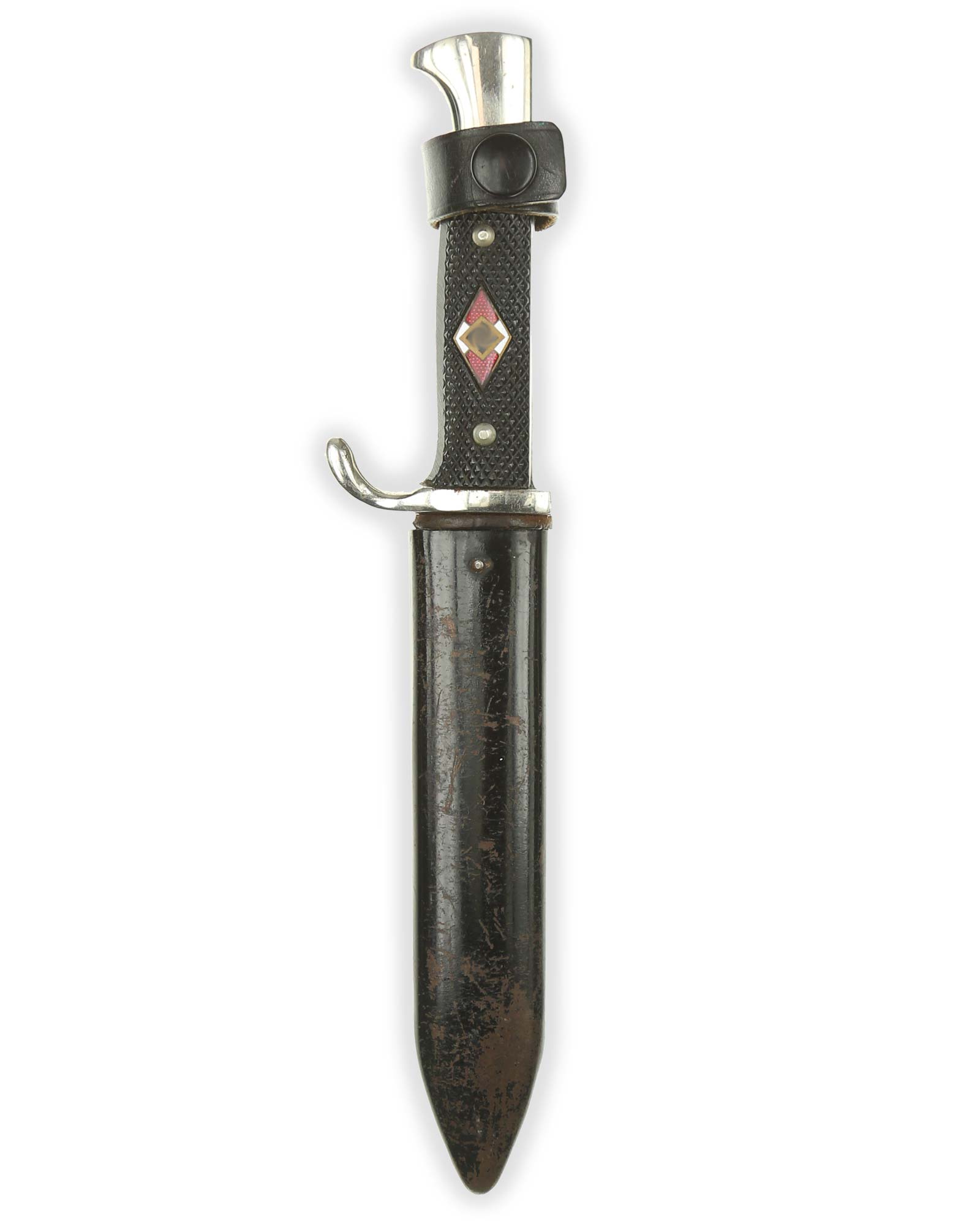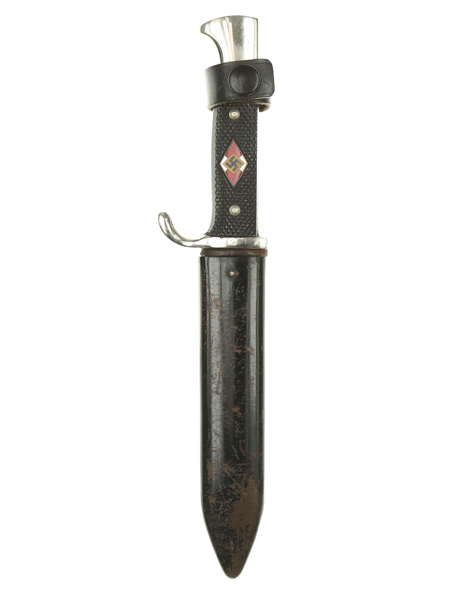 Grip: The grip plates are the early, finely checkered Bakelite type. They are in good condition, being retained by nickel rivets with dressed obverse heads. The enamel HJ insignia is in fine condition throughout.