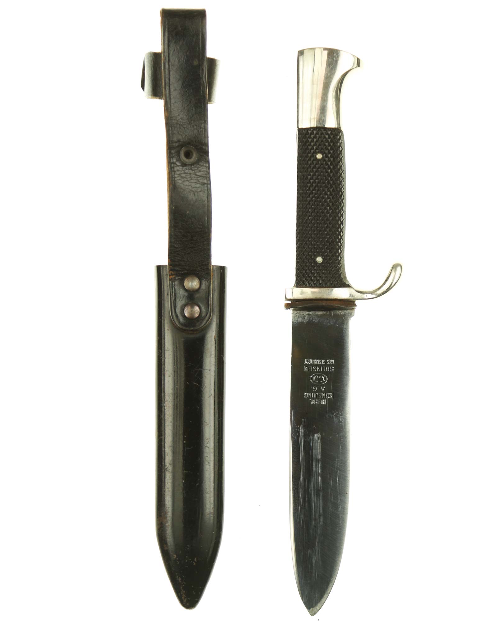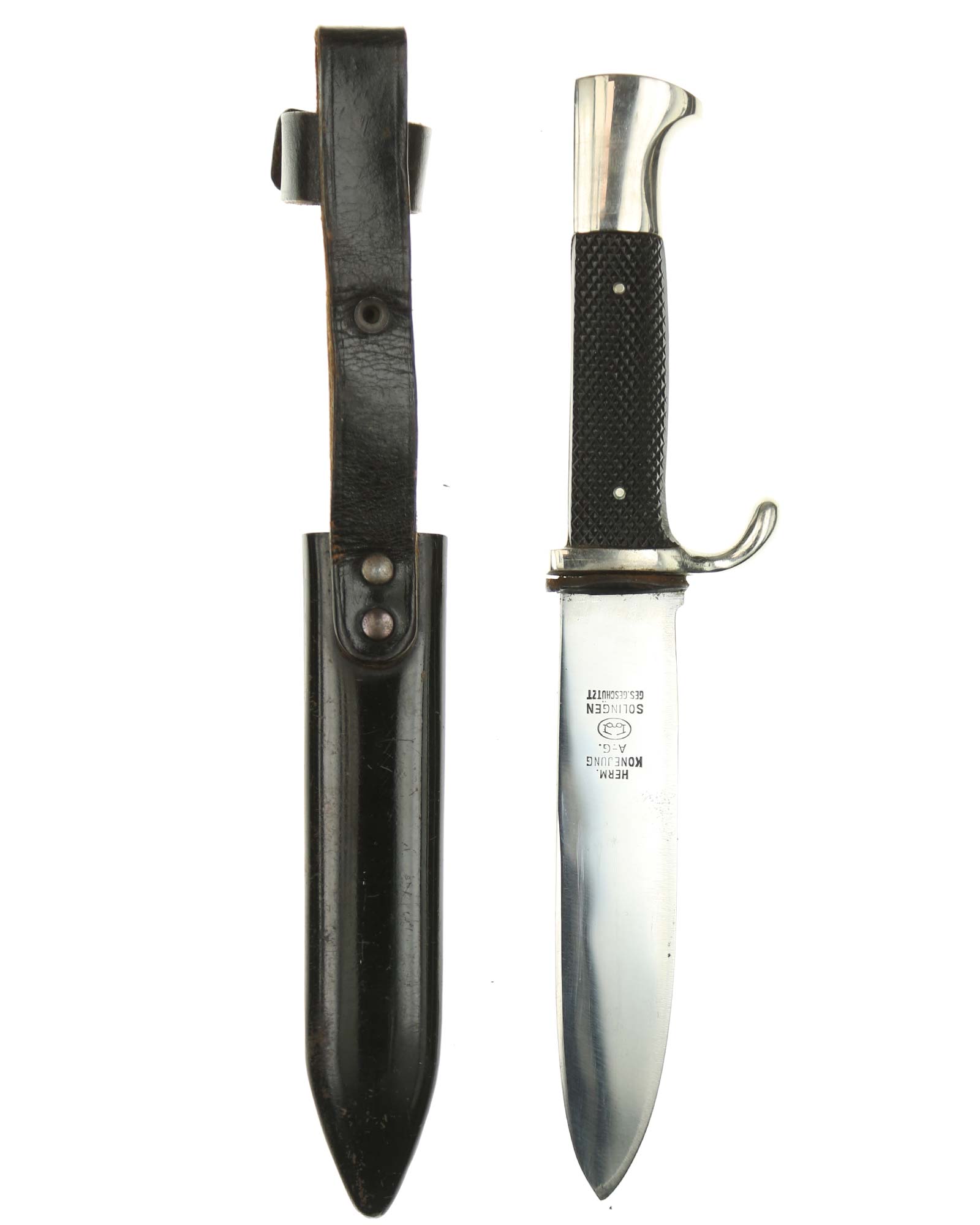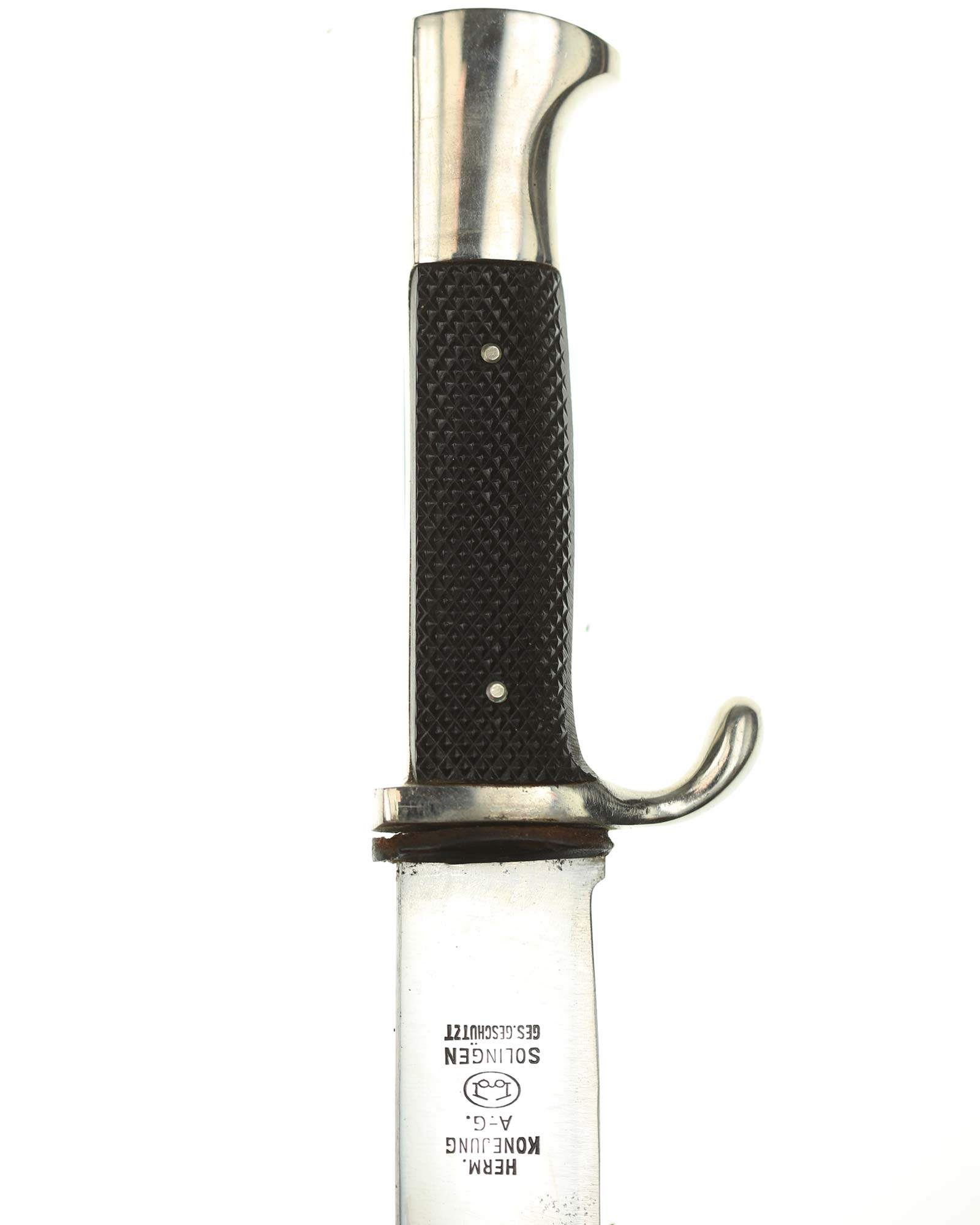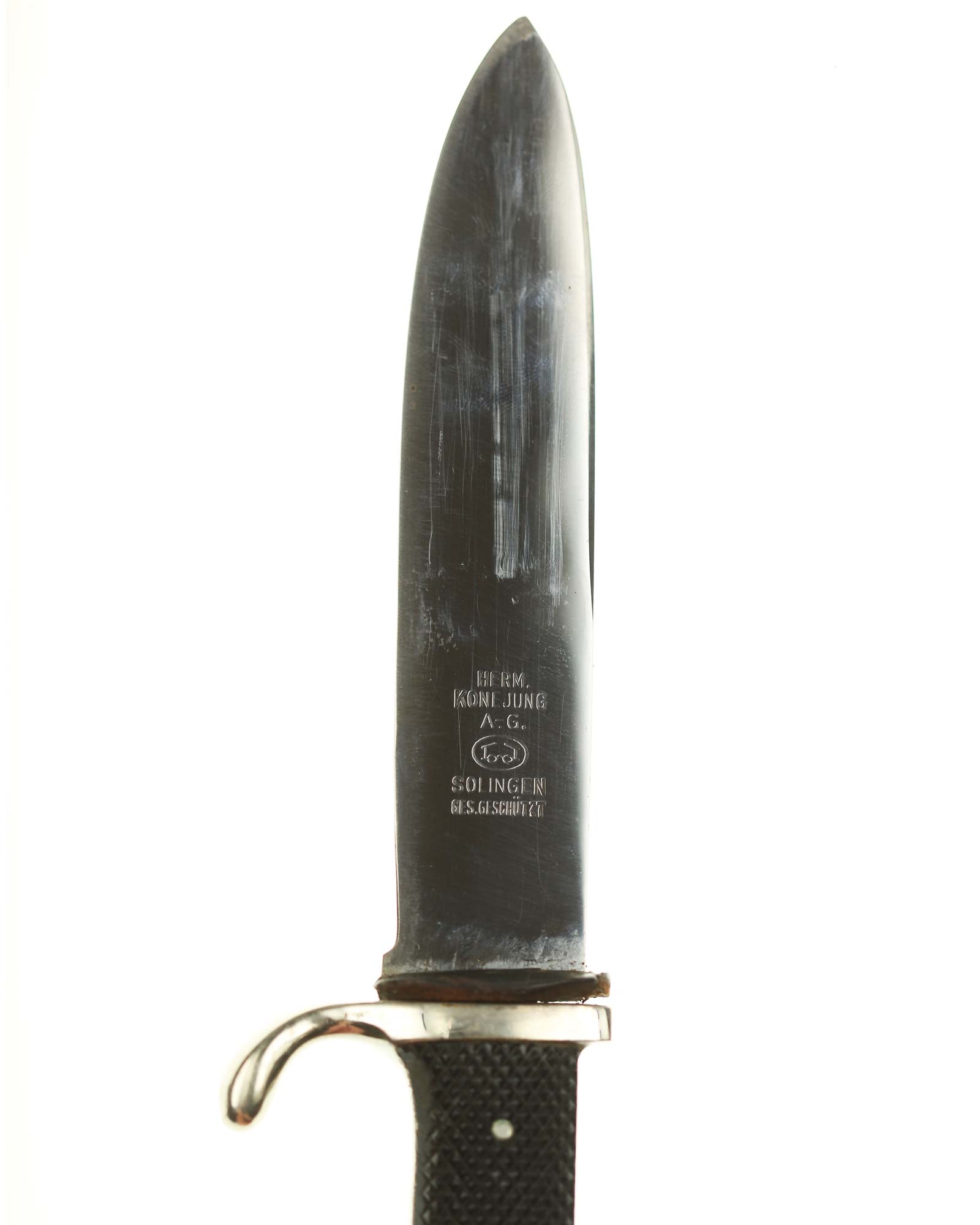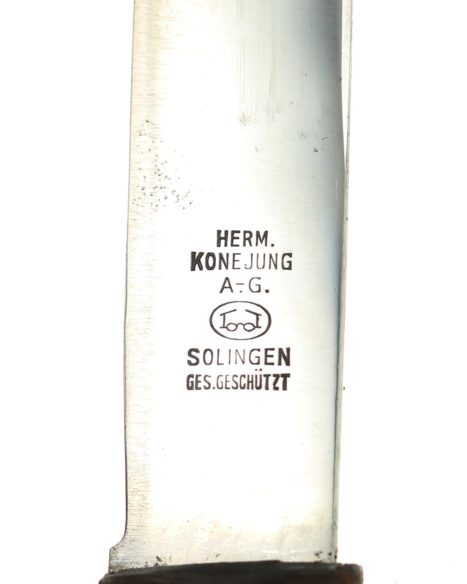 Blade: The blade of this knife is a nice example. This blade is the early-period type. The reverse of the blade is marked with Logo of the Konejung firm; with the firm's name and location, “Hermann Konejung Solingen”.
