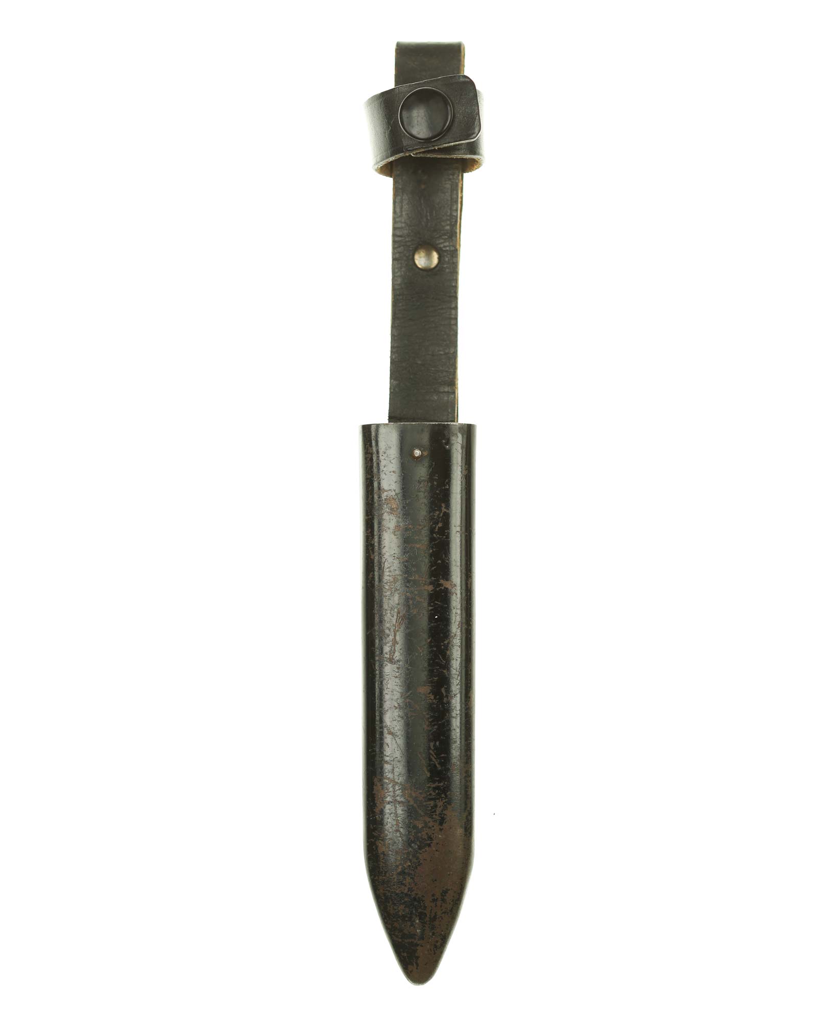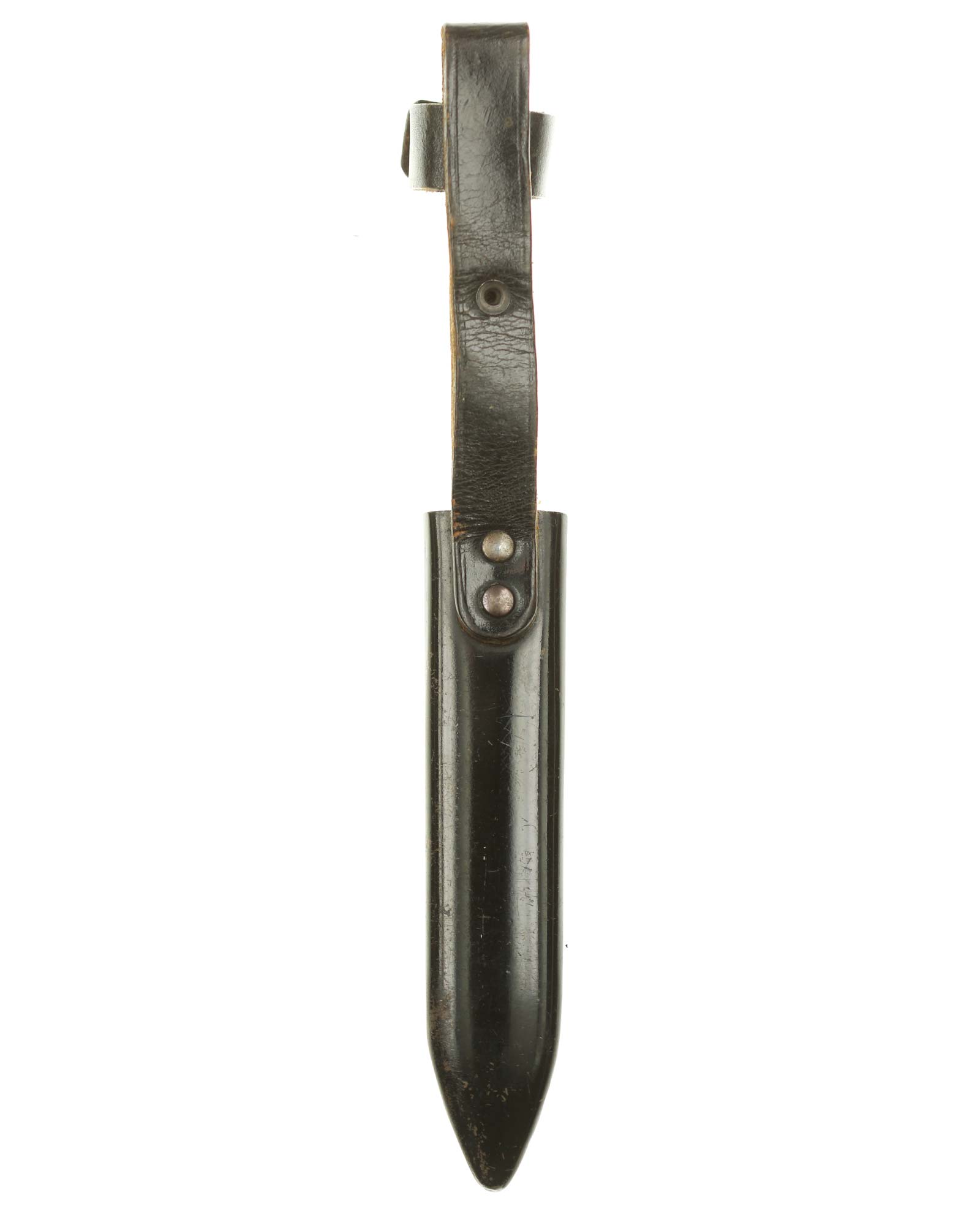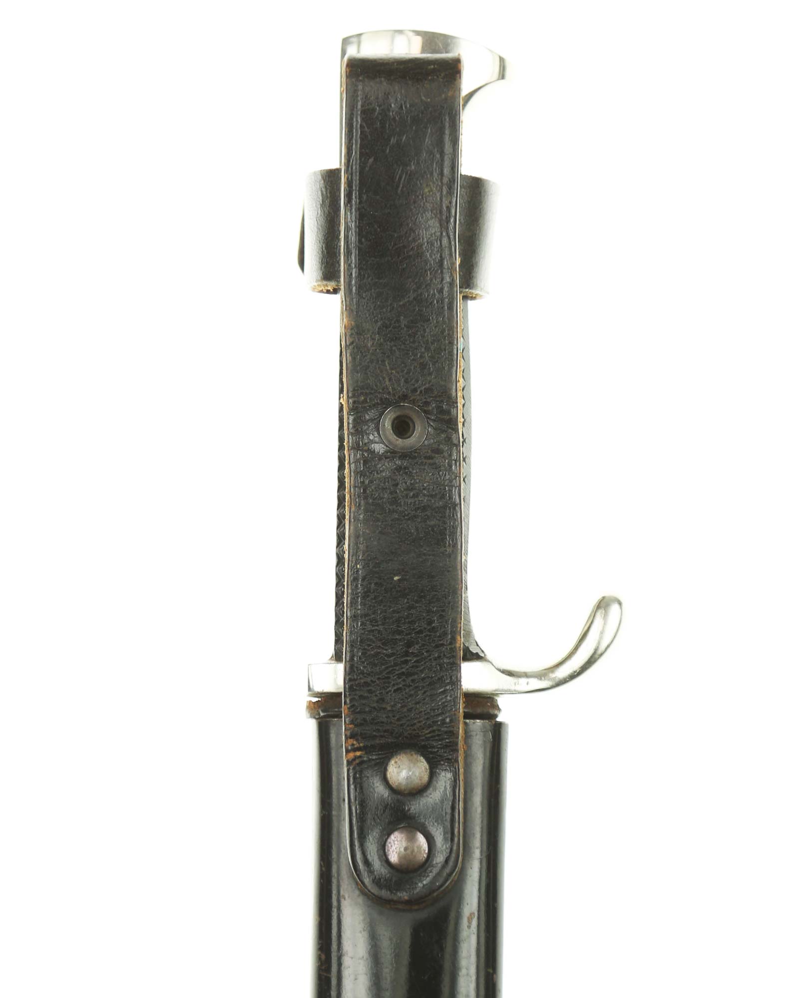 Scabbard: The scabbard shell has good, black paint. This paint has a few mild age spots spread evenly throughout the surface. Attached to the scabbard is an excellent leather hanger.