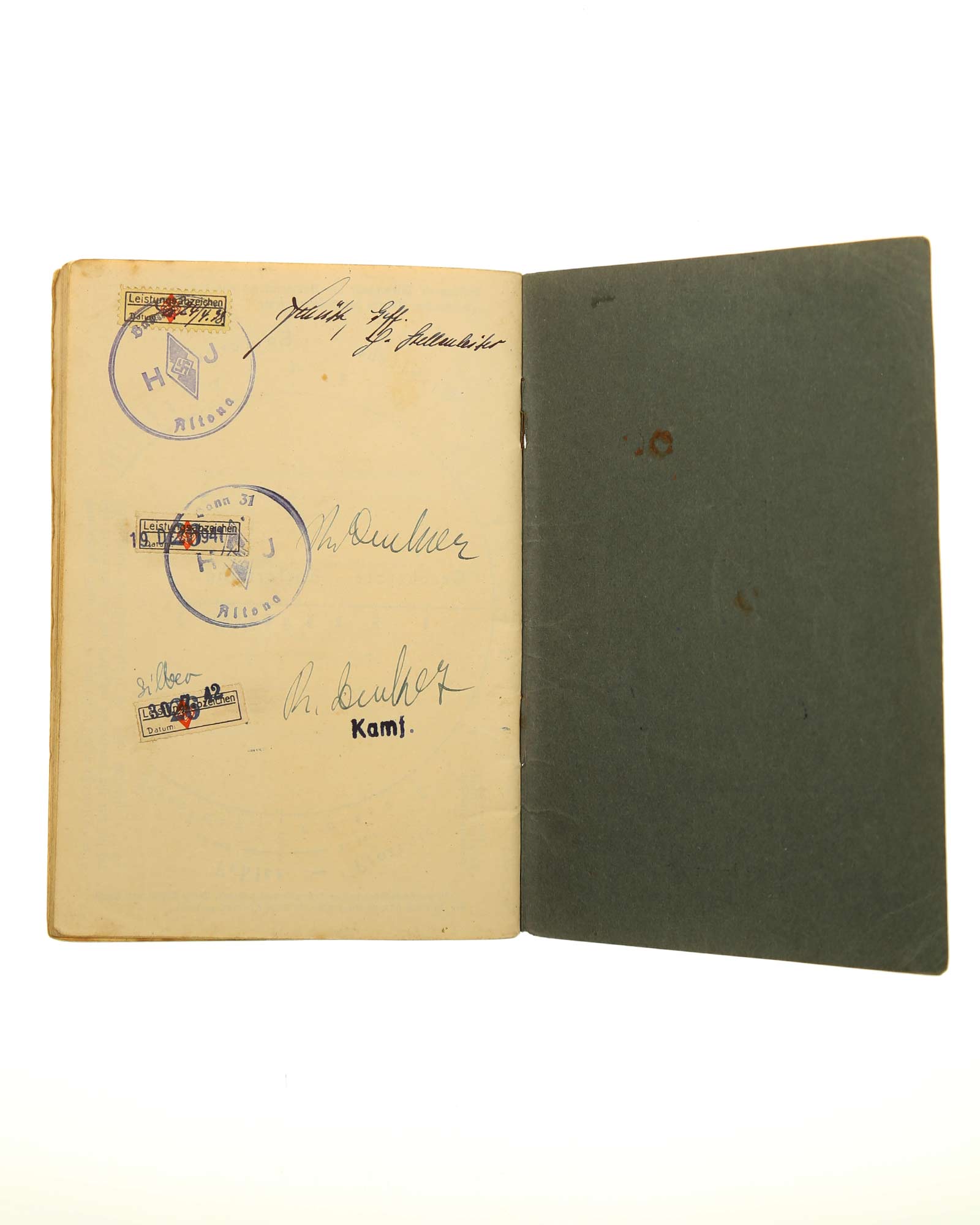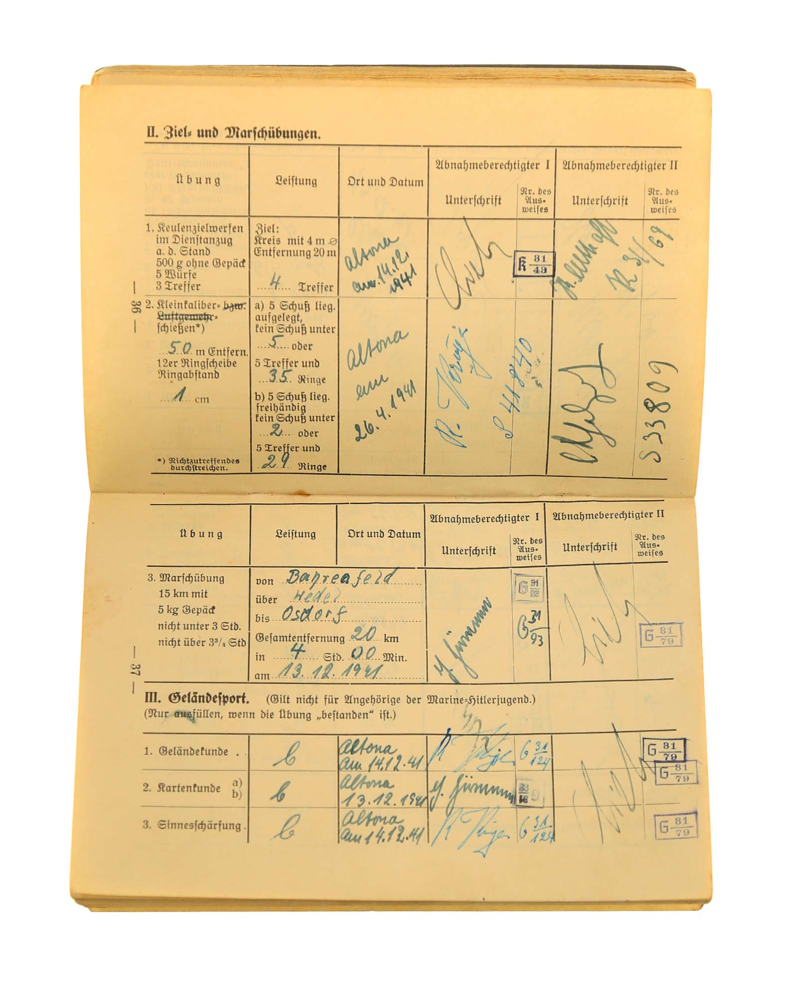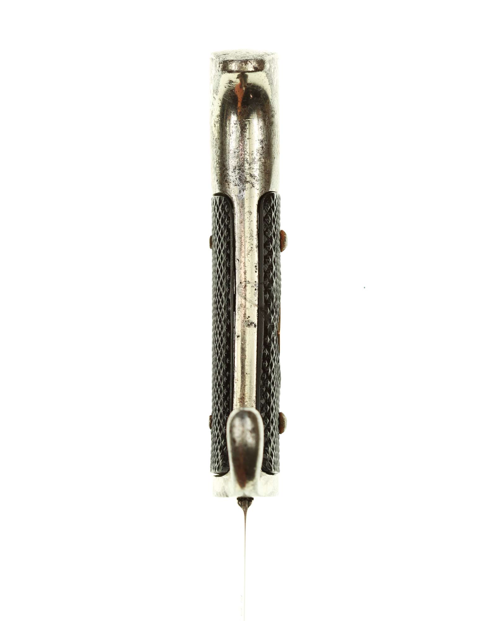 Grip: The grip plates are the early, finely checkered Bakelite type. They are in good condition, being retained by nickel rivets with dressed obverse heads. The enamel HJ insignia is in fine condition throughout.