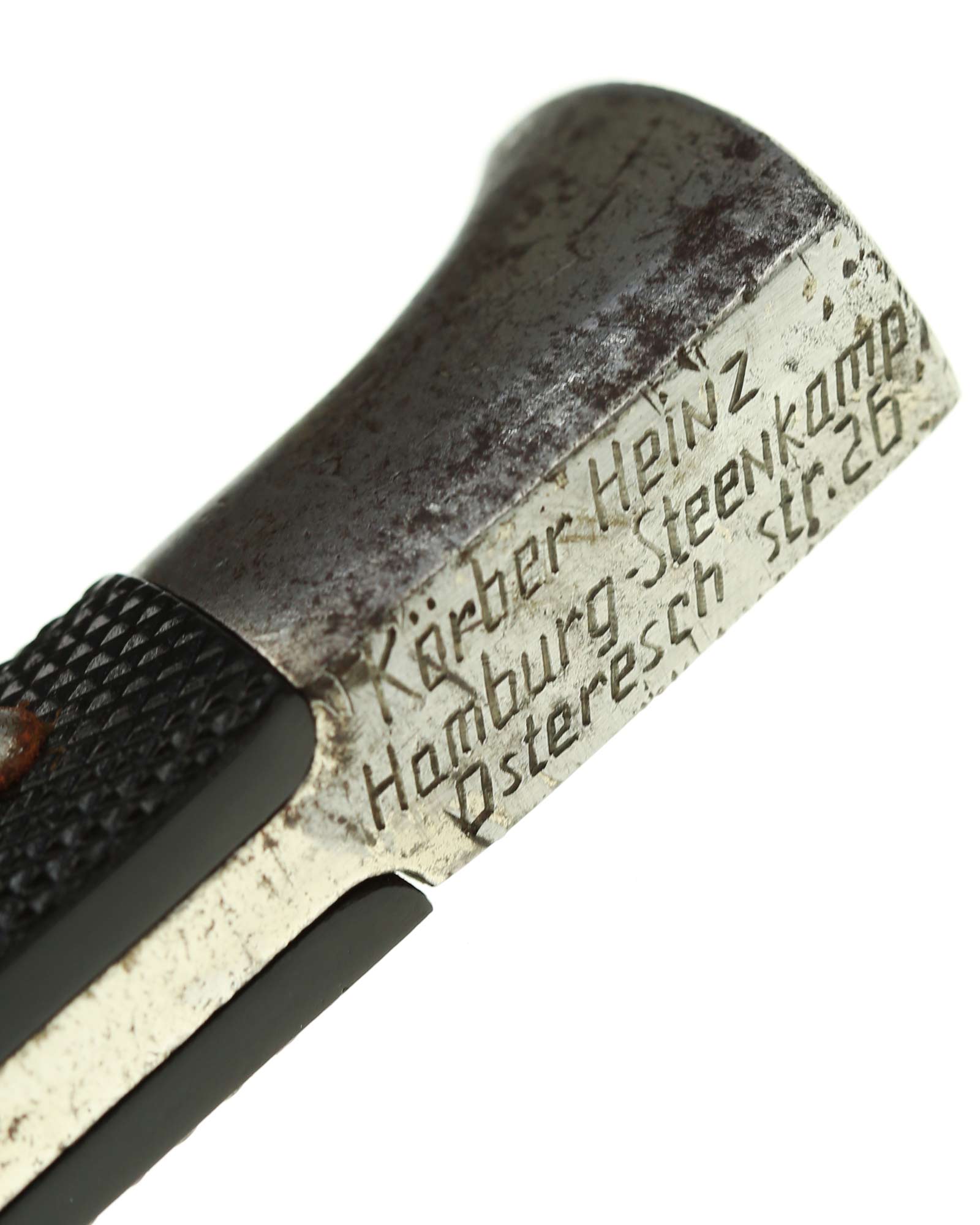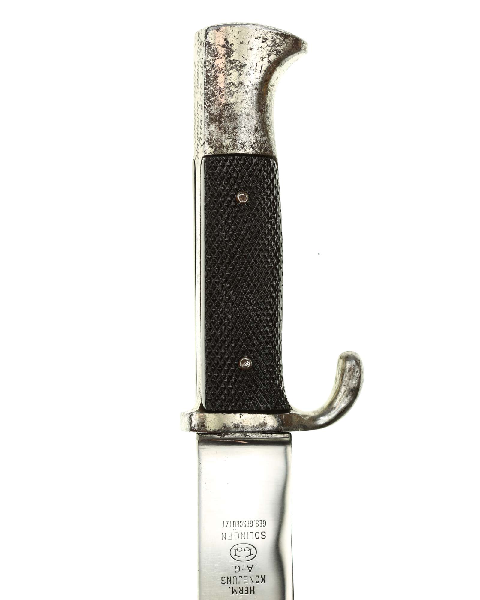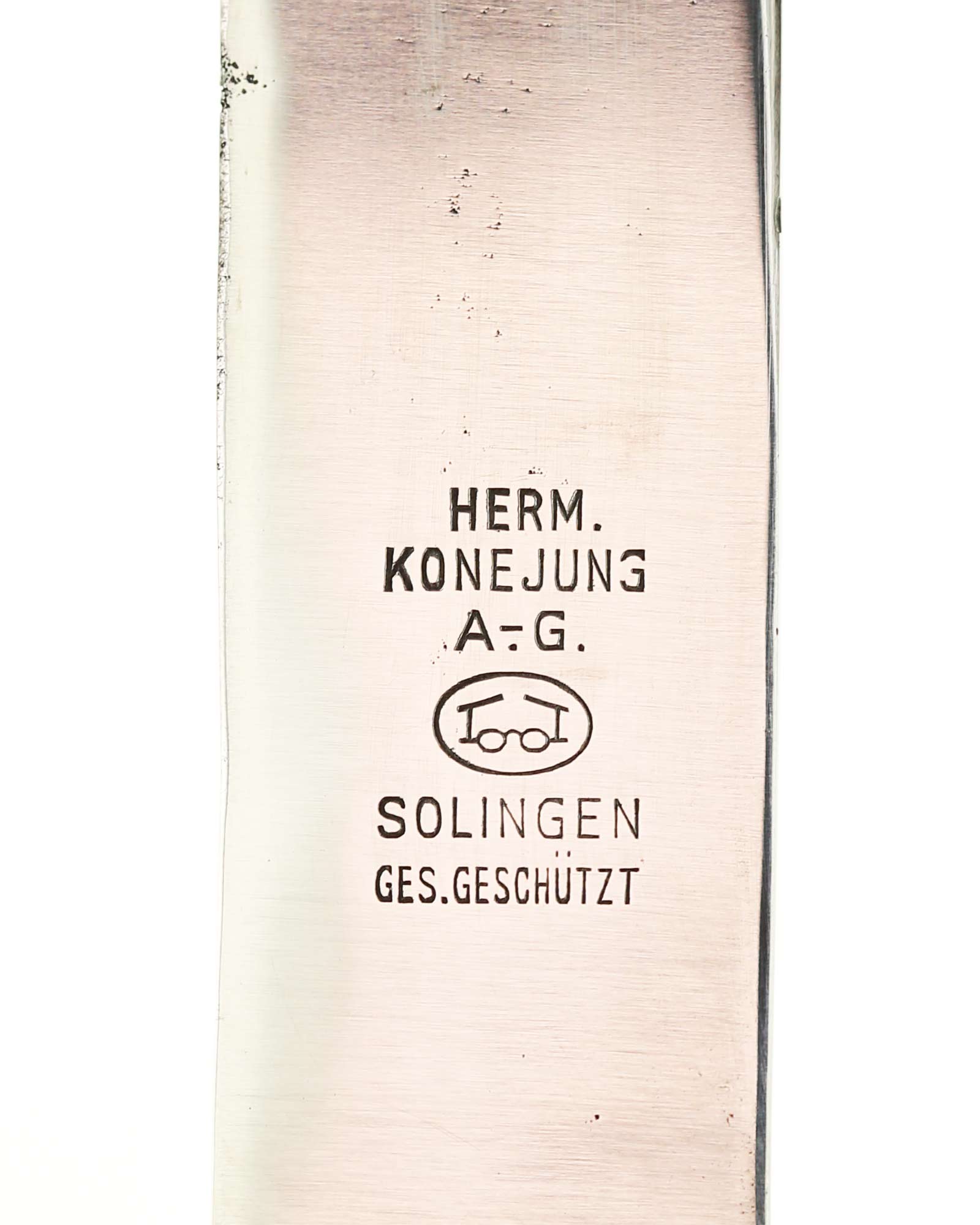 Blade: The blade of this knife is a nice example. This blade is the early-period type. The reverse of the blade is marked with Logo of the firm; with the firm's name and location, “Hermann Konejung Solingen”.