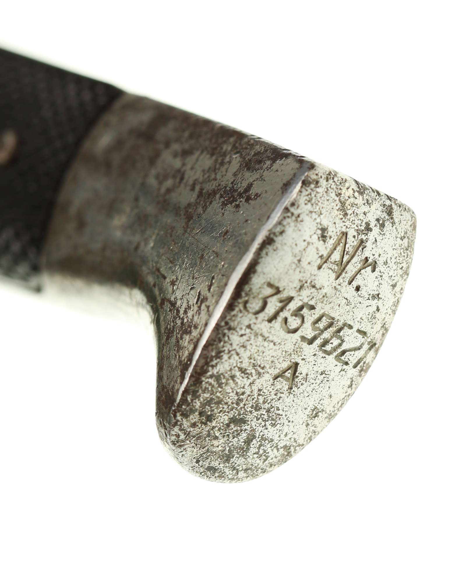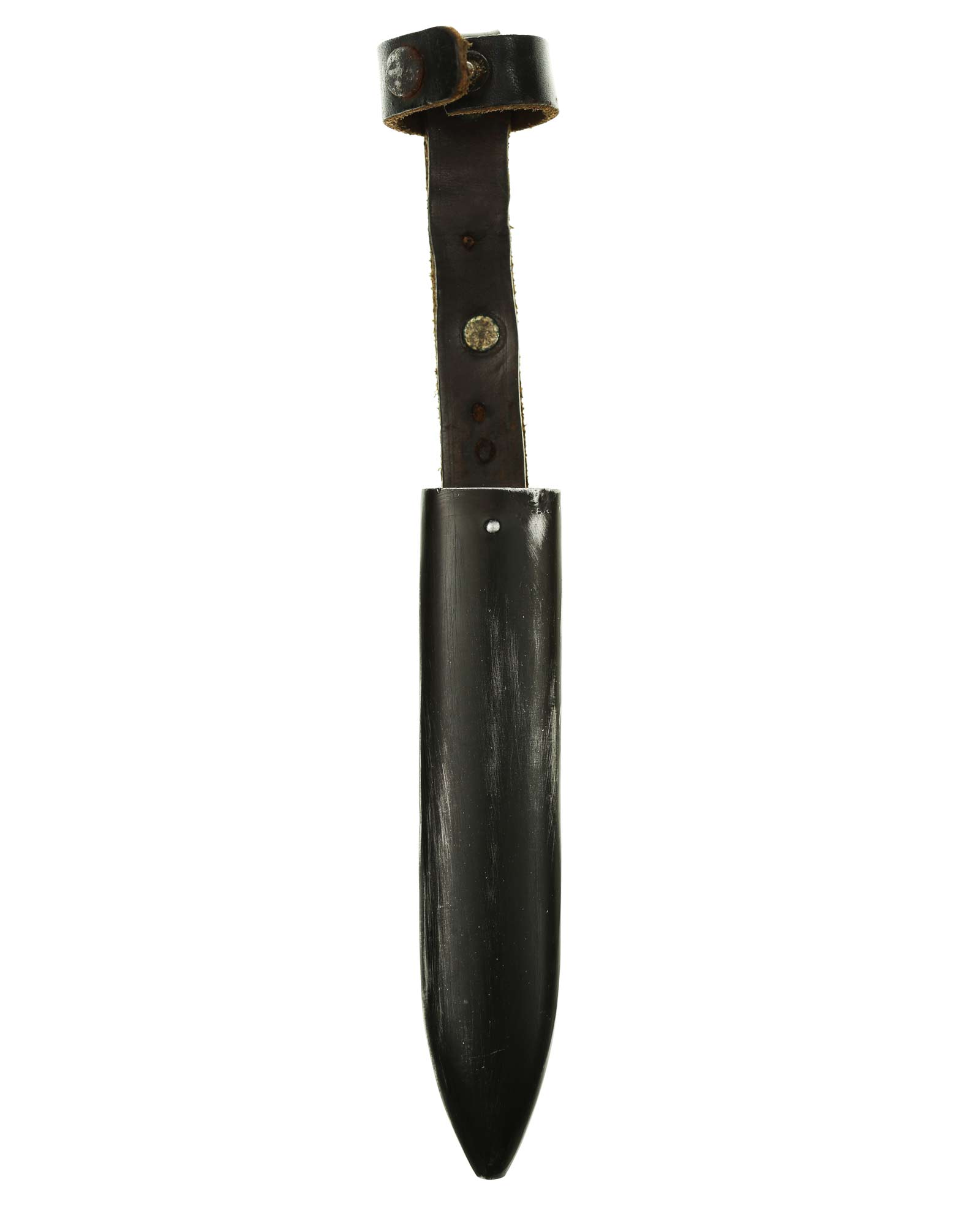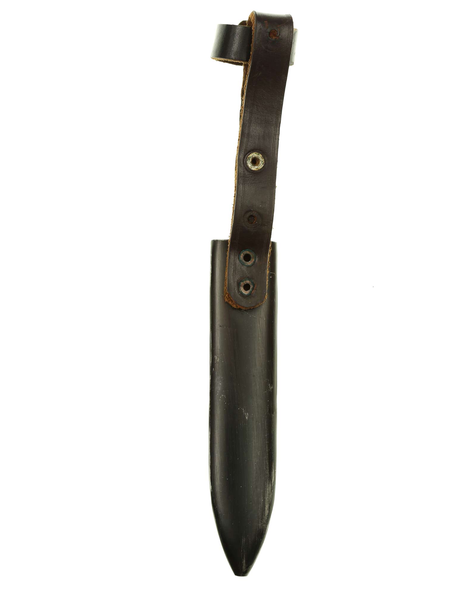 Scabbard: The scabbard shell has good, black paint. This paint has a few mild age spots spread evenly throughout the surface. Attached to the scabbard is an excellent leather hanger.