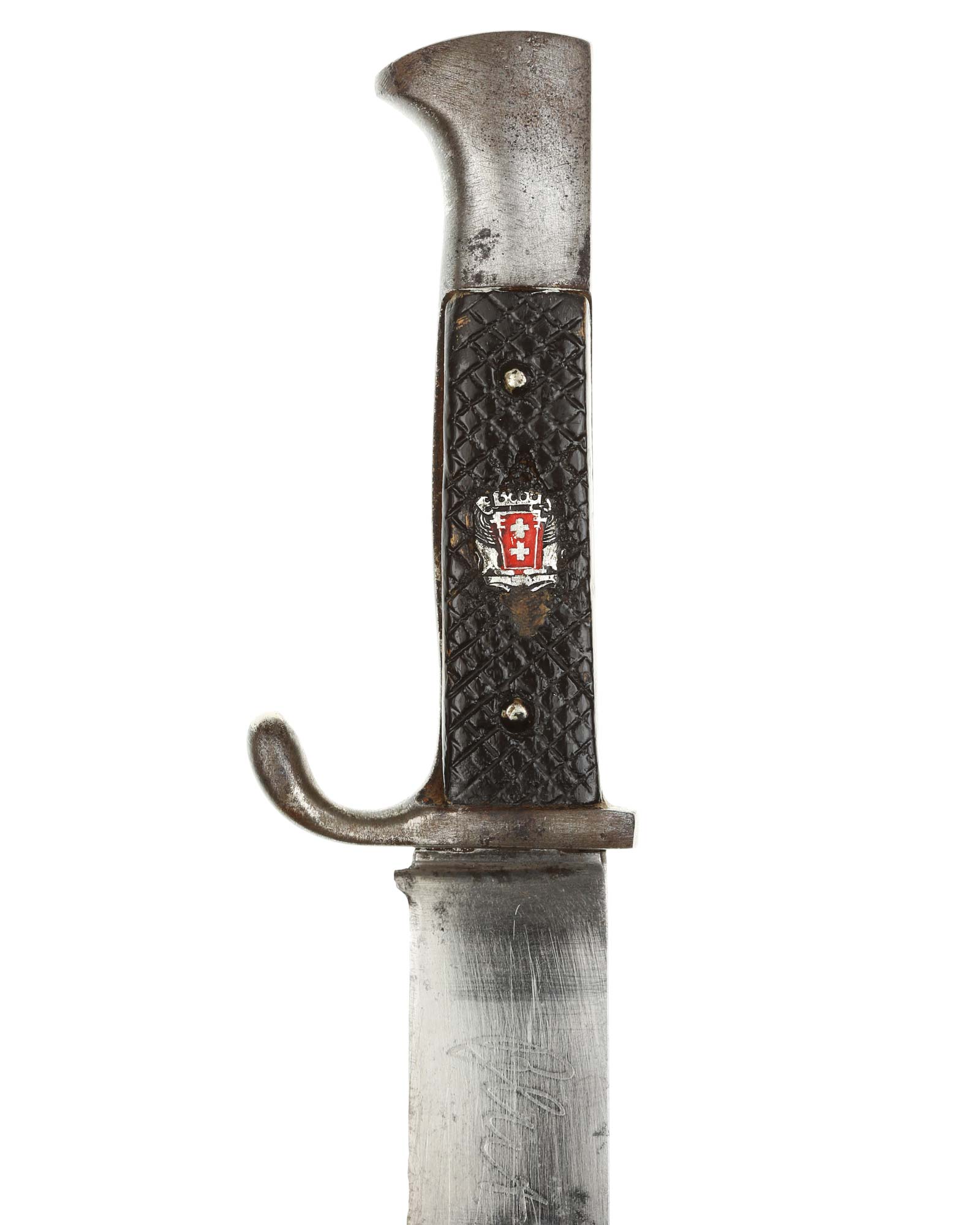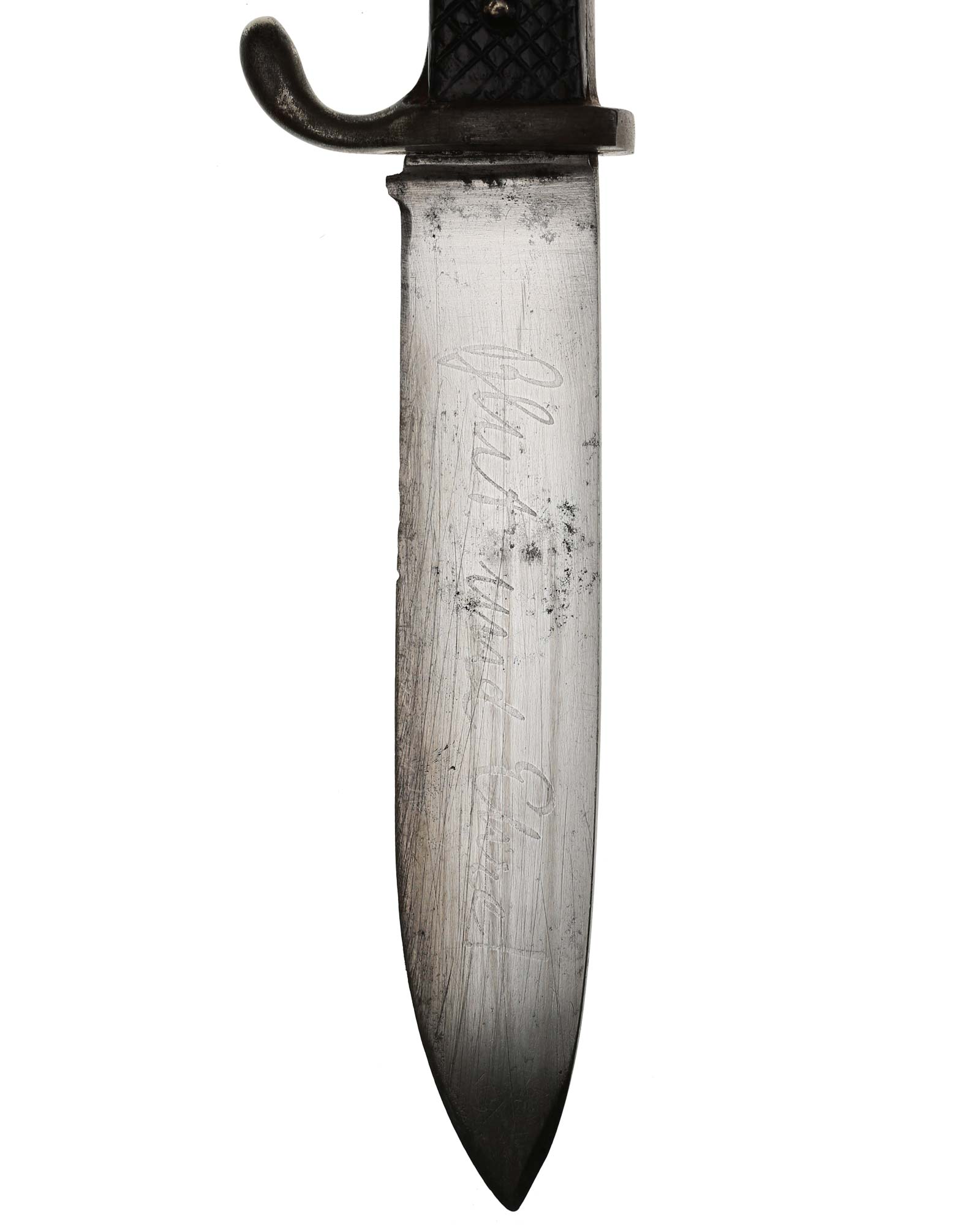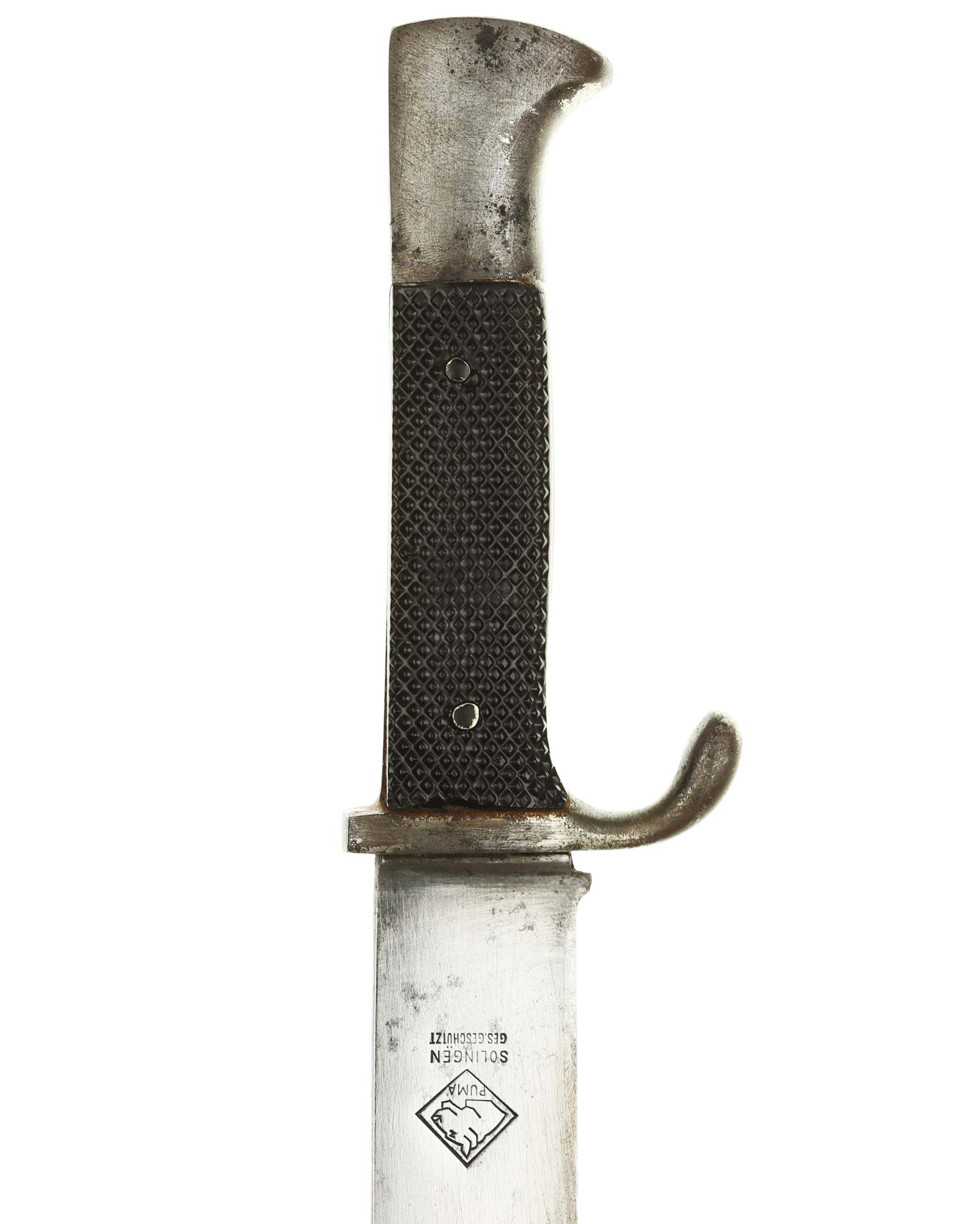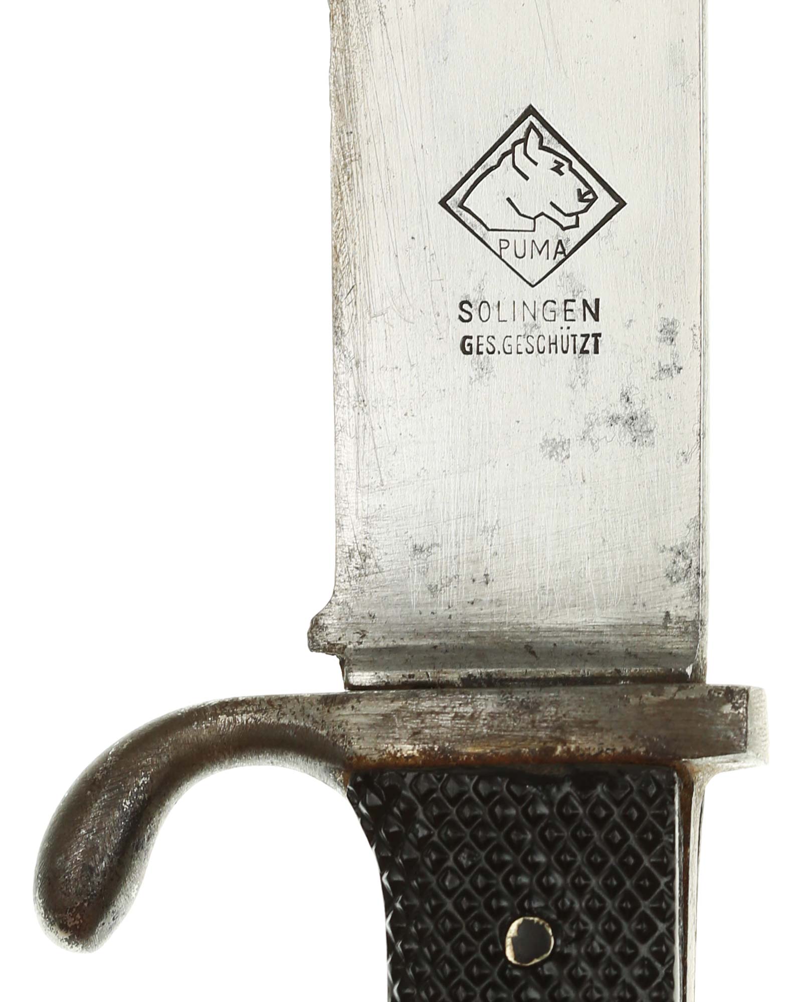 This Hitler Youth Knife is with Motto, shows some age. Model 1933-1935 [Early-period]. The total length is 25.7 cm. The Knife has the maker mark on the blade: Puma Solingen.