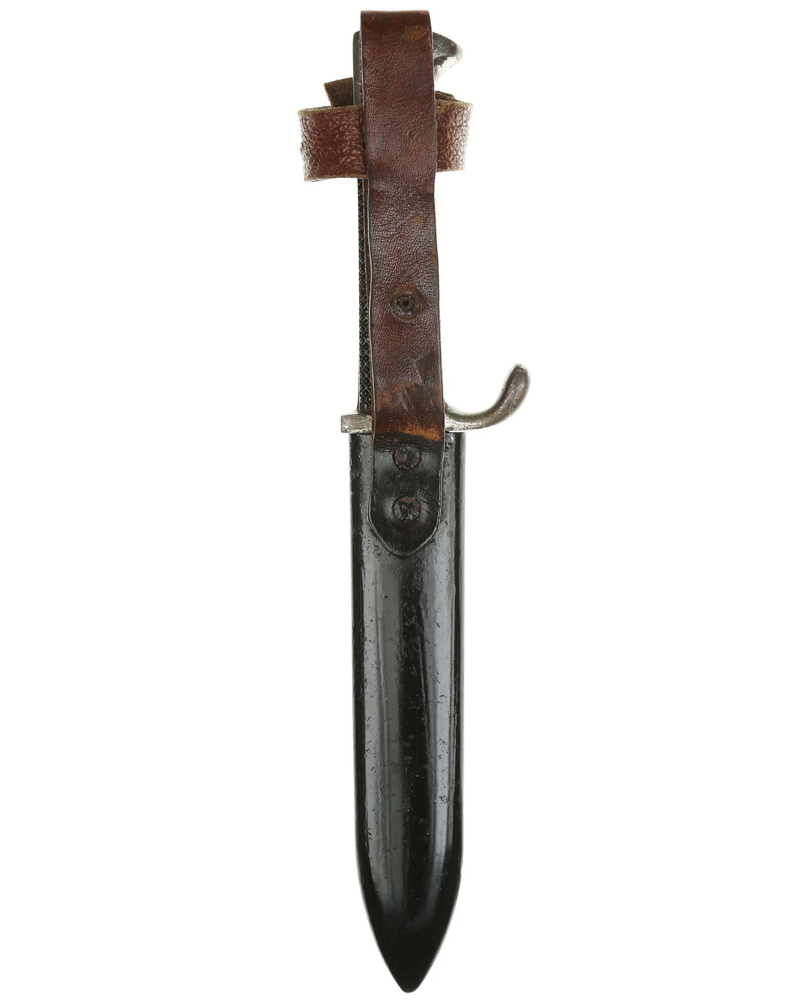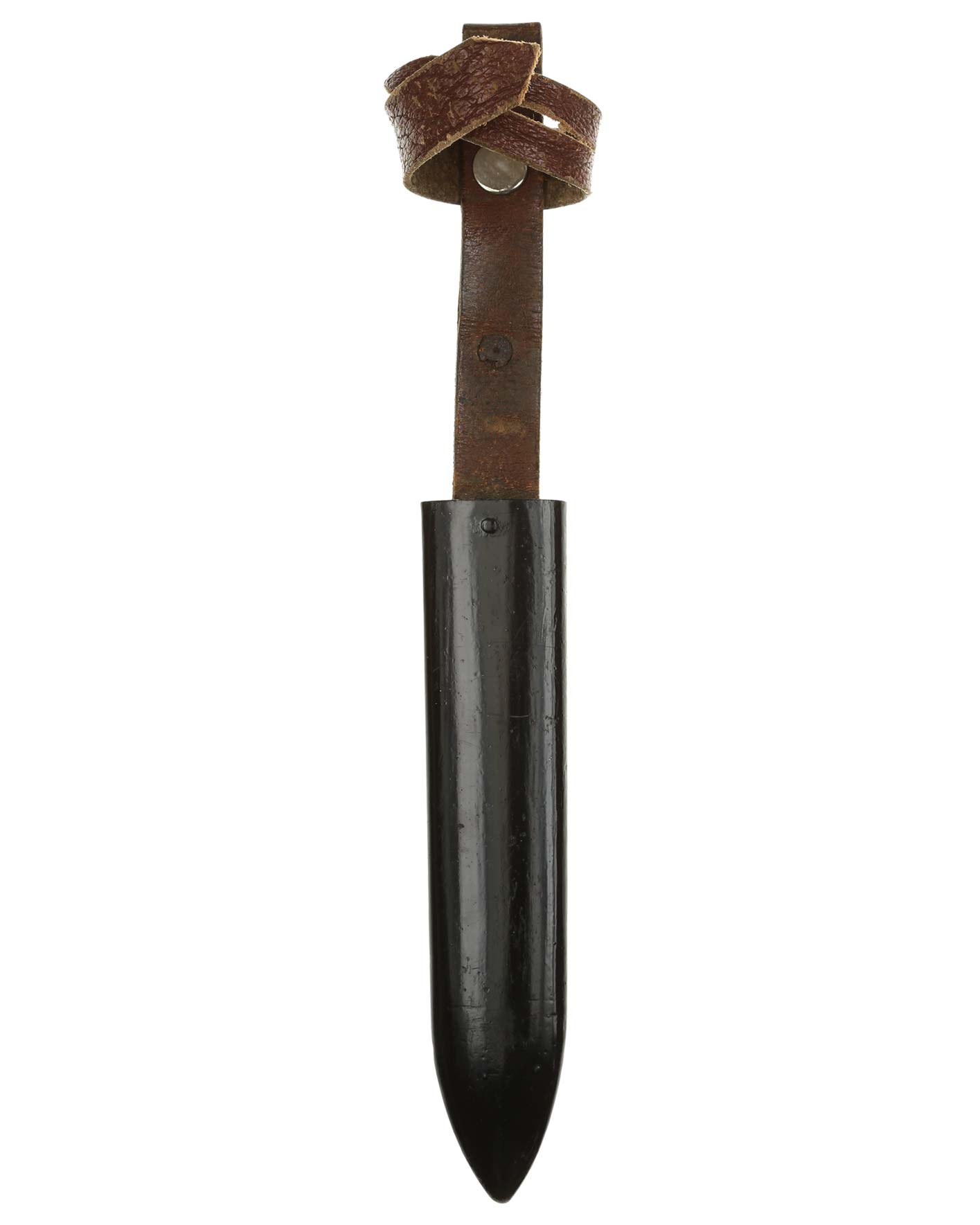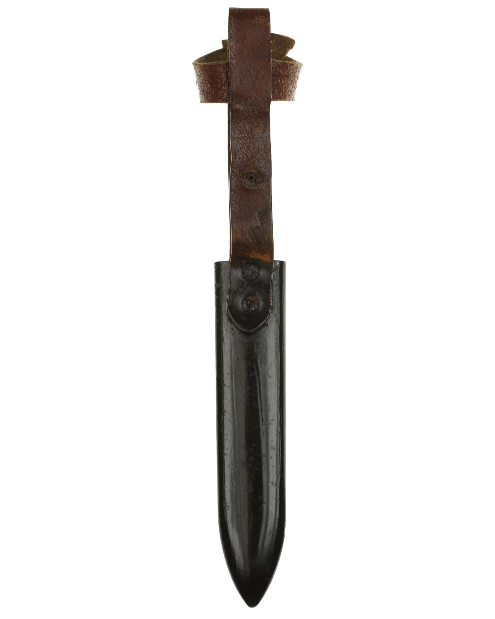 Scabbard: The scabbard shell has black paint. Attached to the scabbard is a leather hanger.