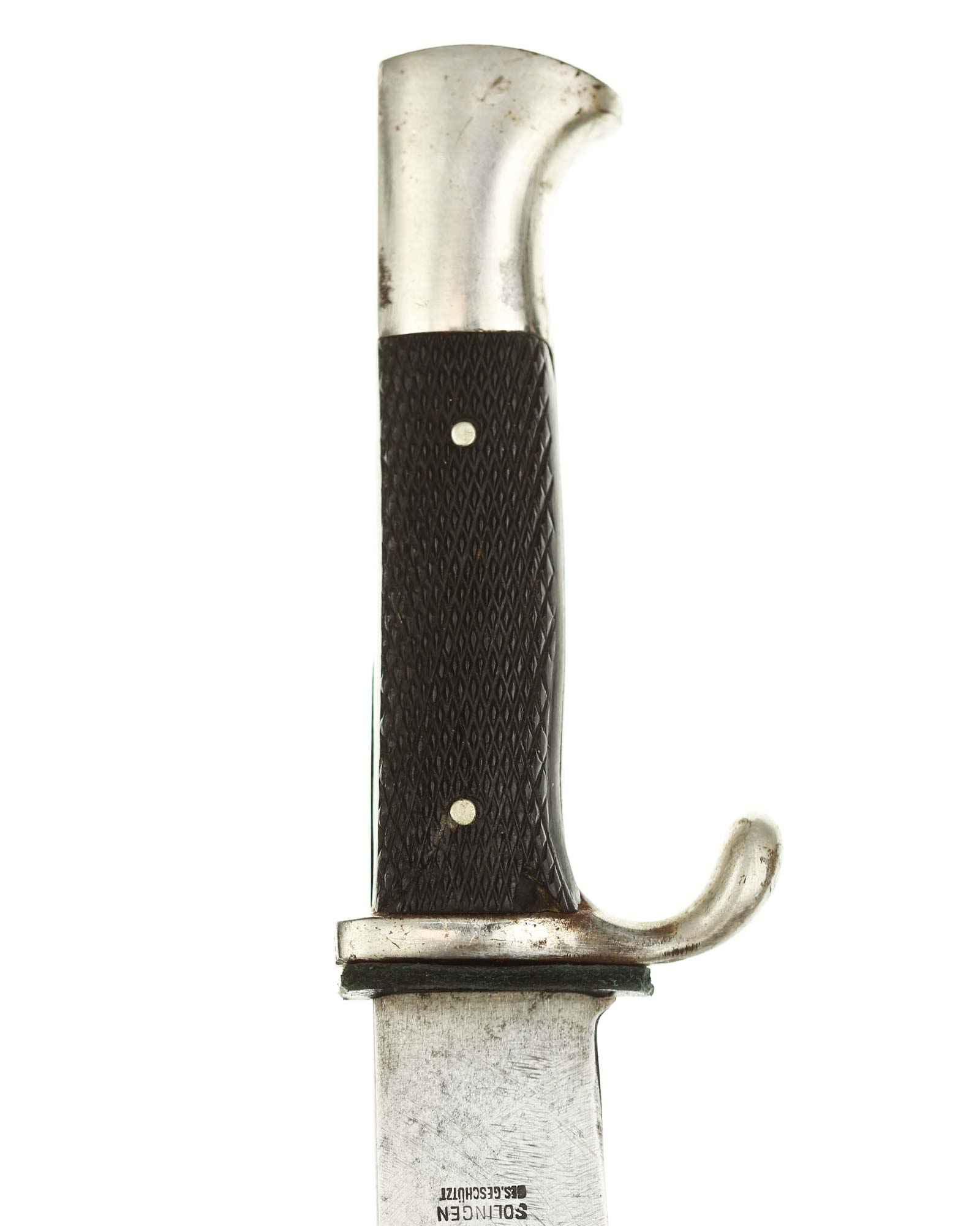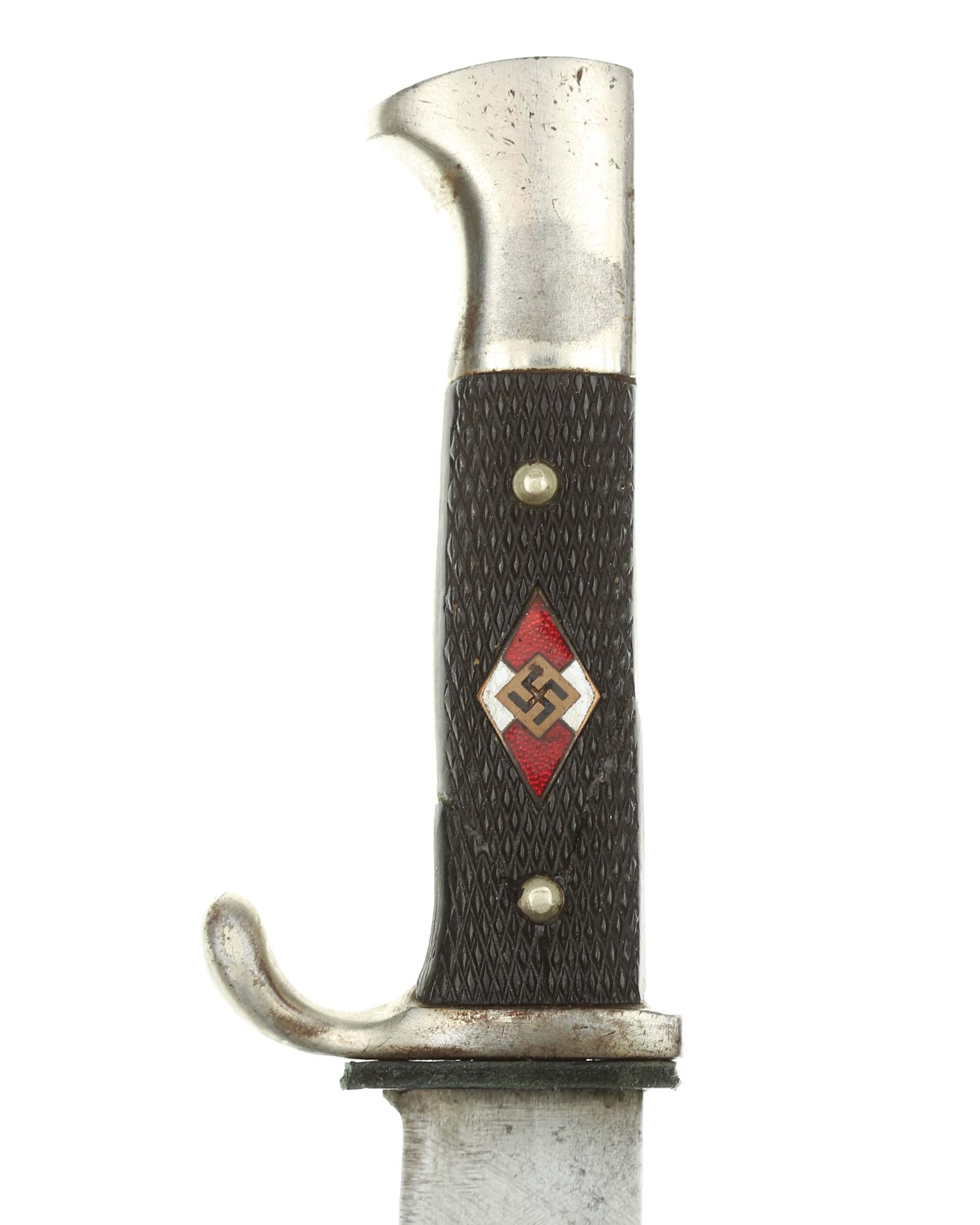 Grip: The grip plates are the early, finely checkered Bakelite type. They are in good condition, being retained by nickel rivets with dressed obverse heads. The enamel HJ insignia is in fine condition throughout.