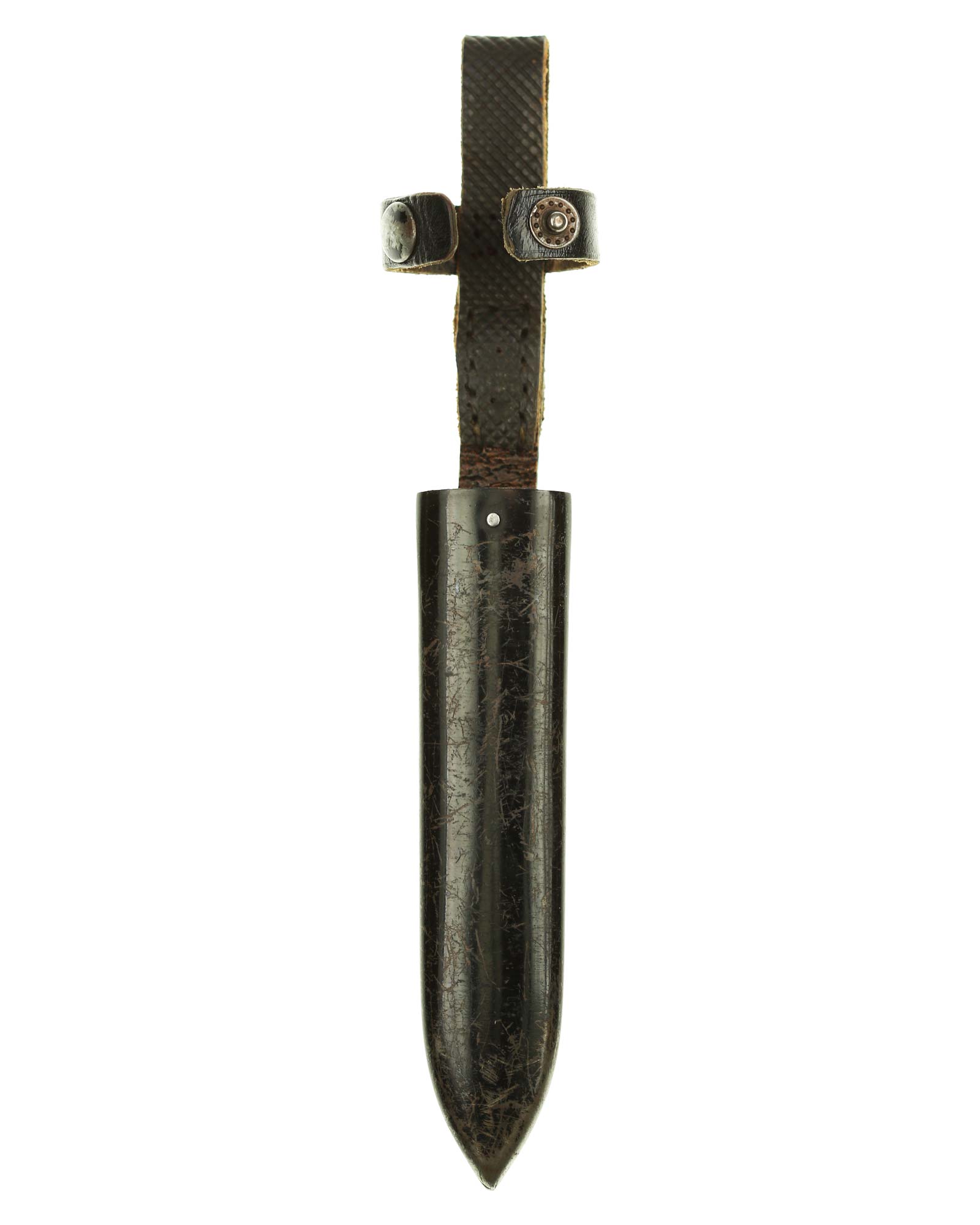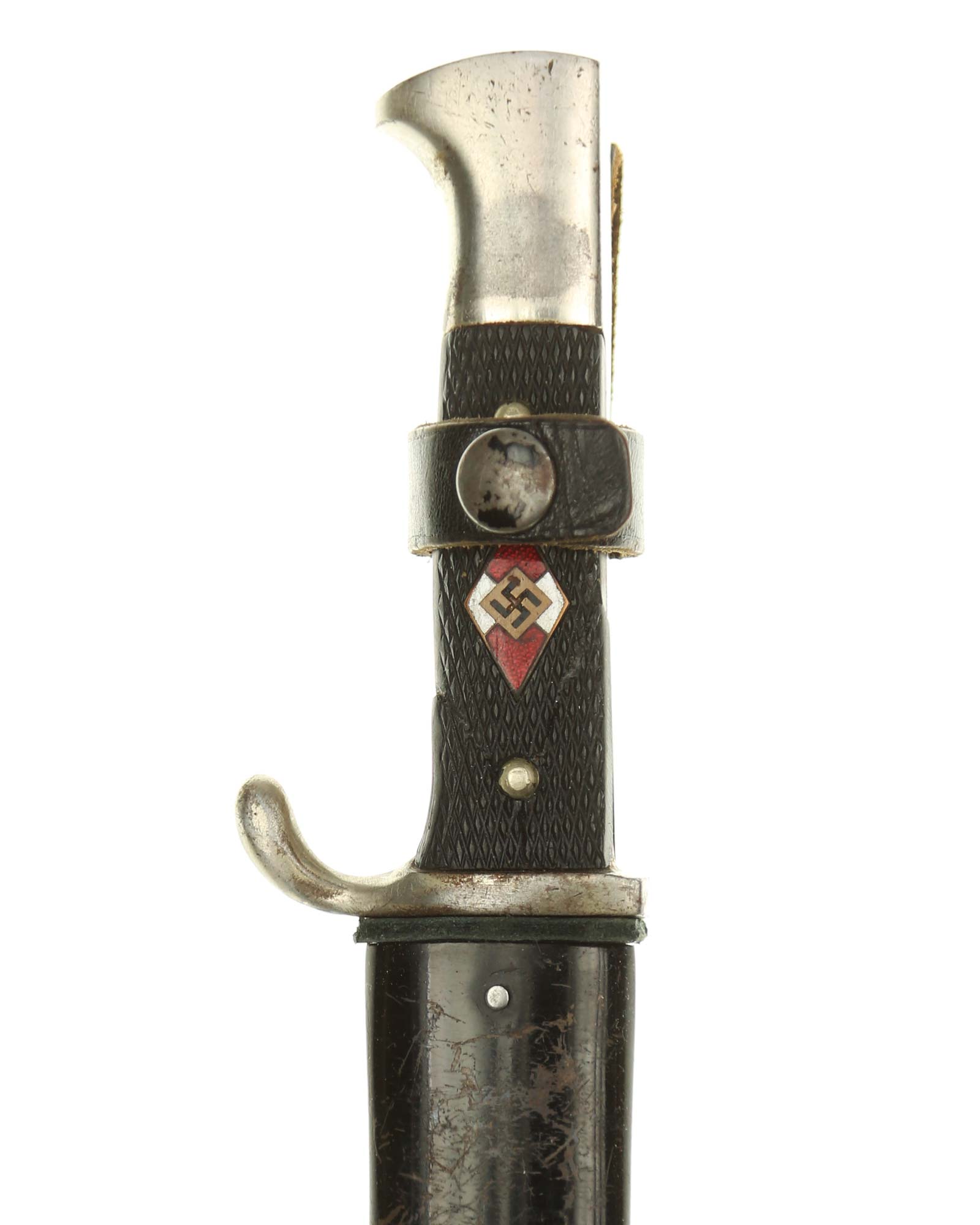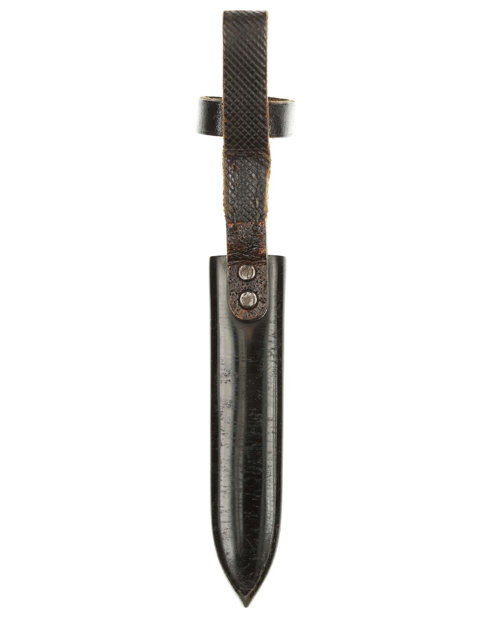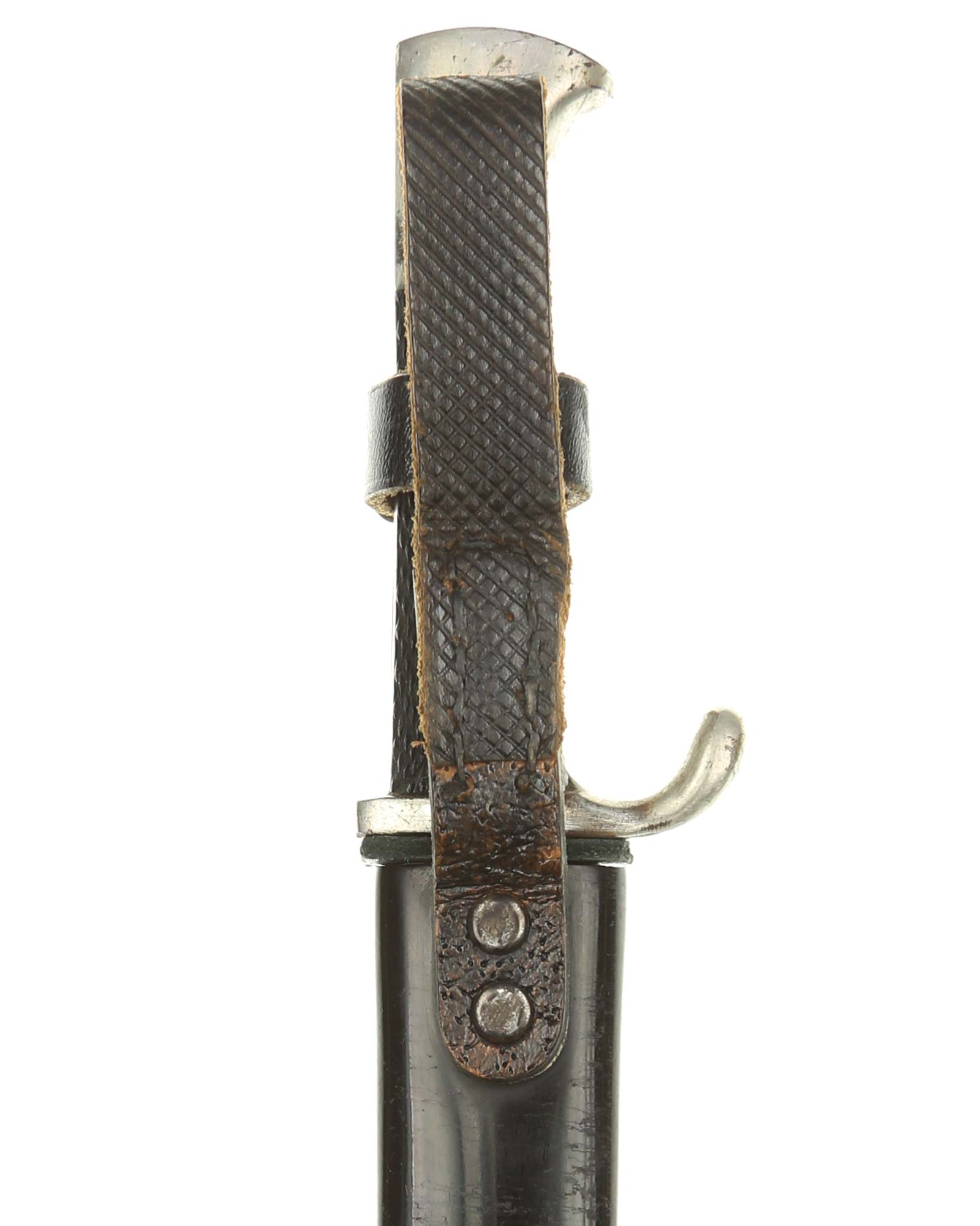Scabbard: The scabbard shell has good, black paint. This paint has a few mild age spots spread evenly throughout the surface. Attached to the scabbard is an excellent leather hanger.