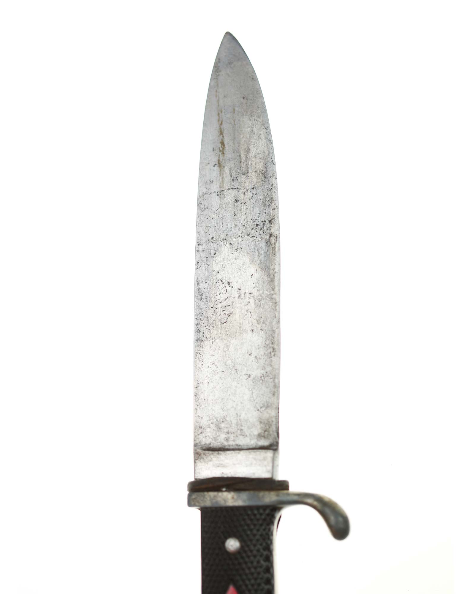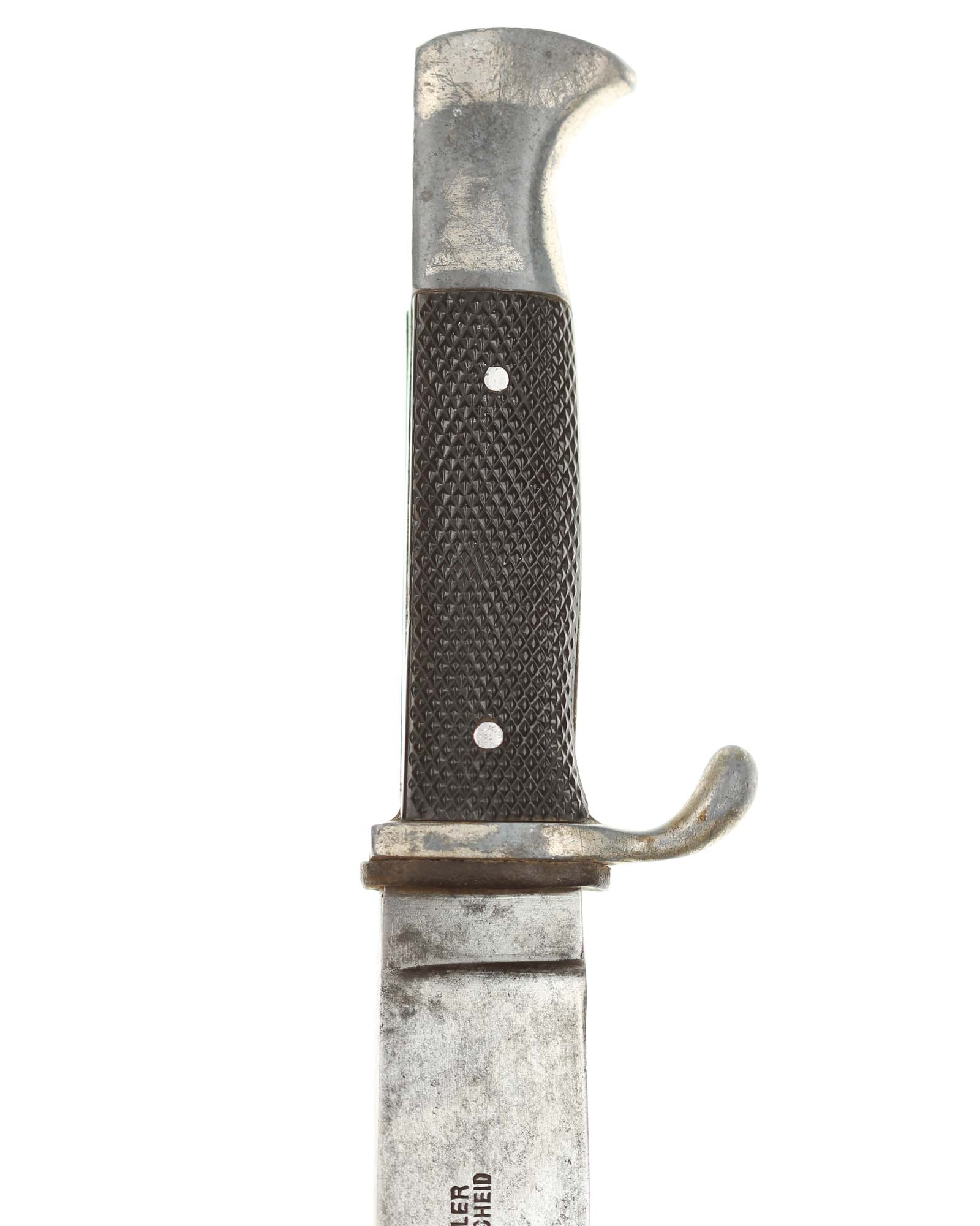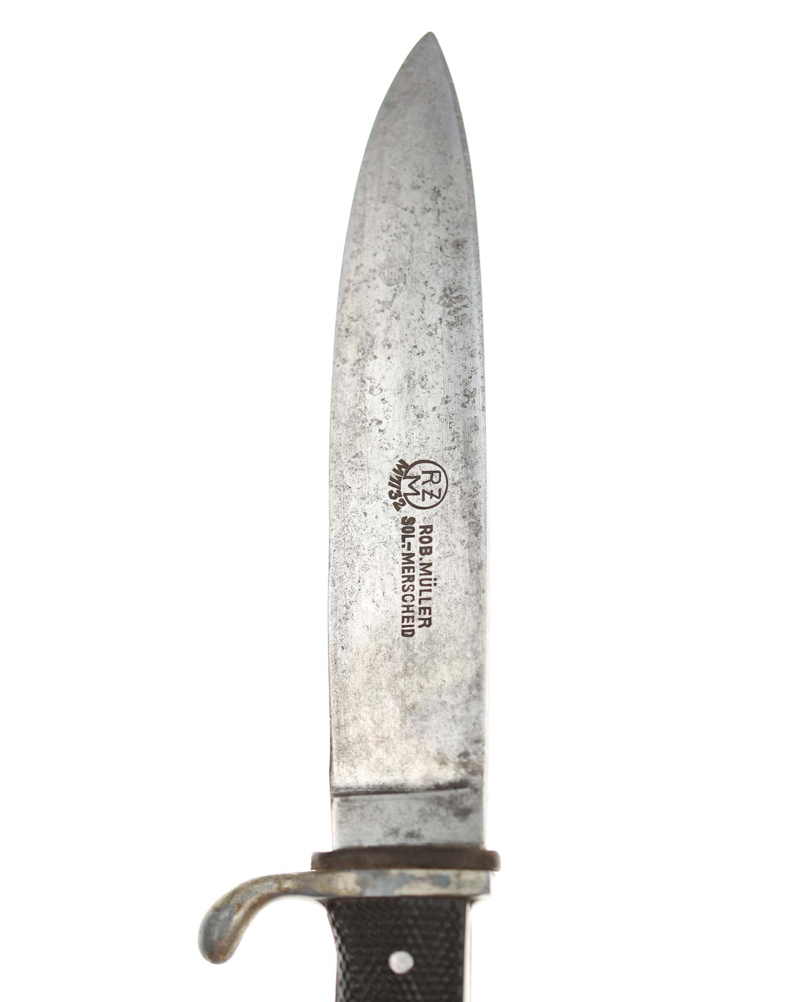 This Hitler Youth Knife, Model 1936-1938 [Mid-period]. The total length is 25,4 cm. The Knife has the RZM maker mark on the blade: RZM M7/32 (Rob. Müller Sol.-Merscheid).