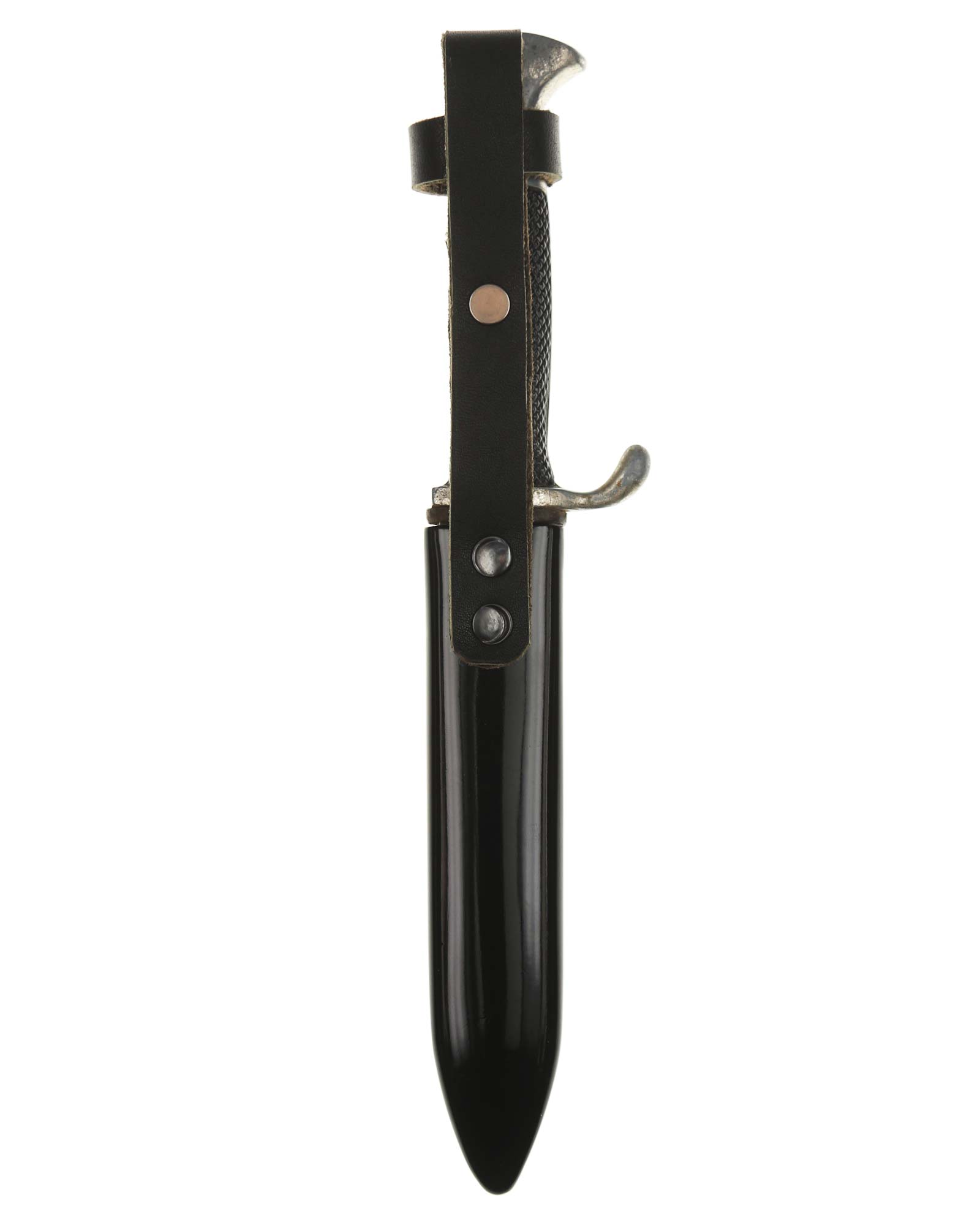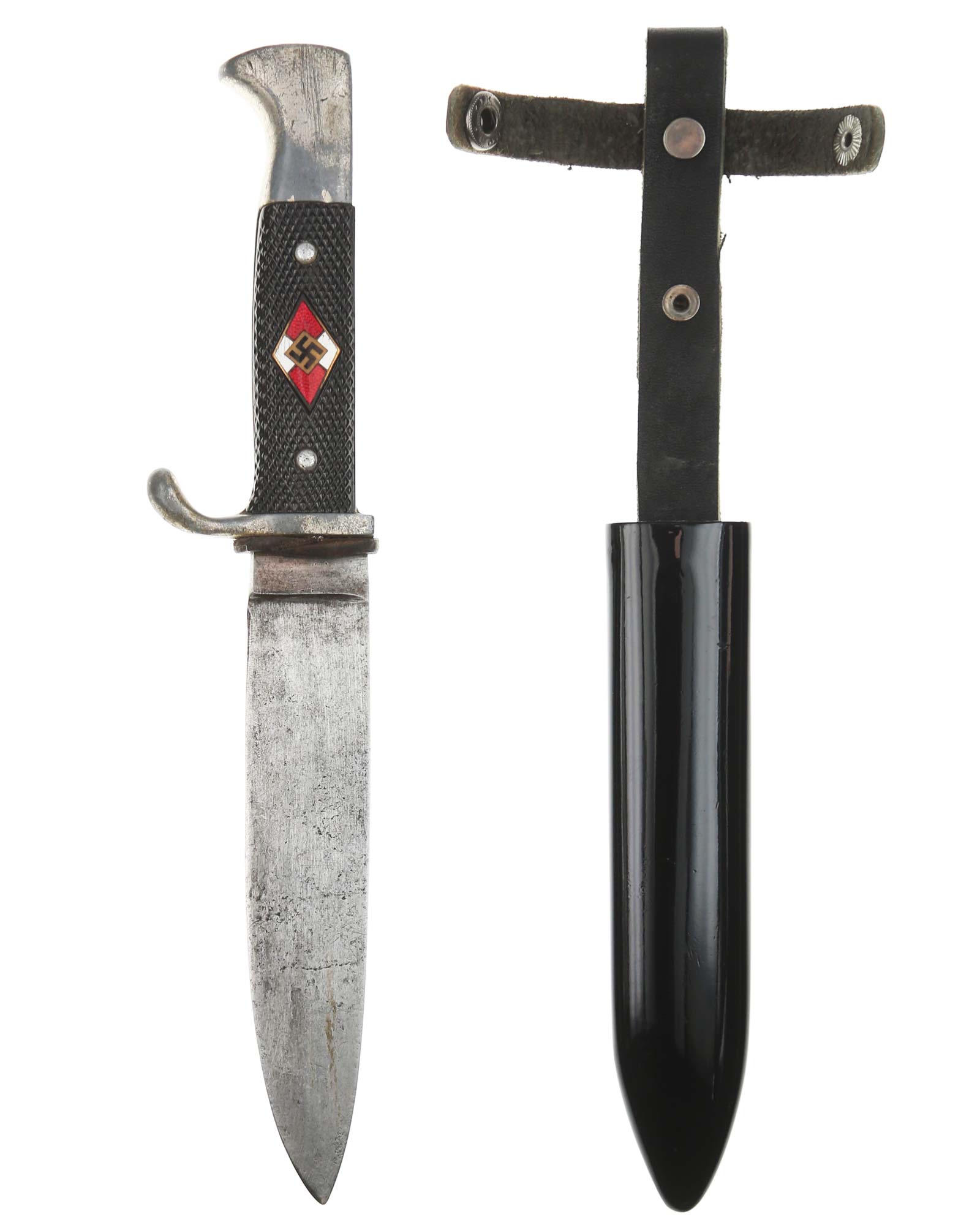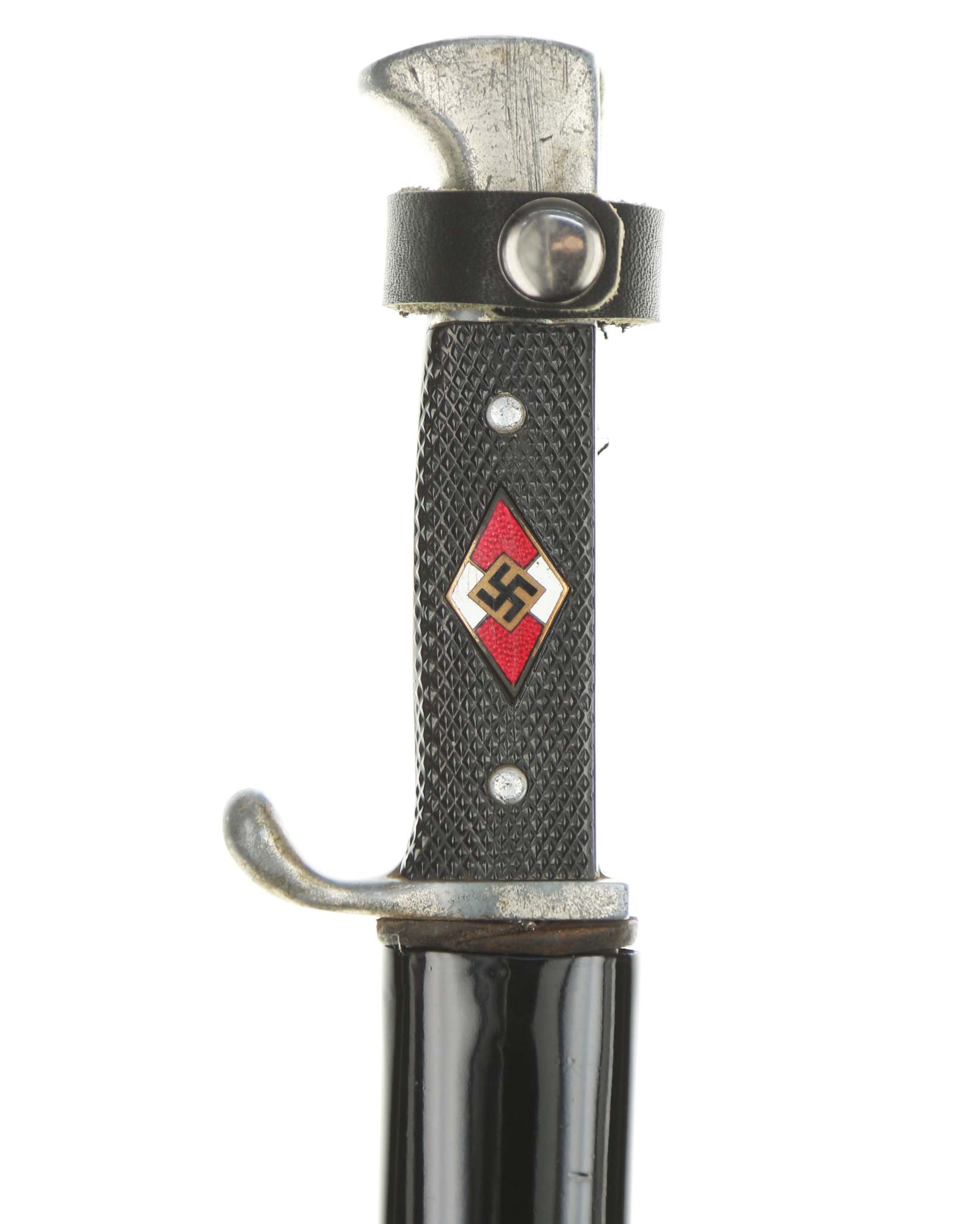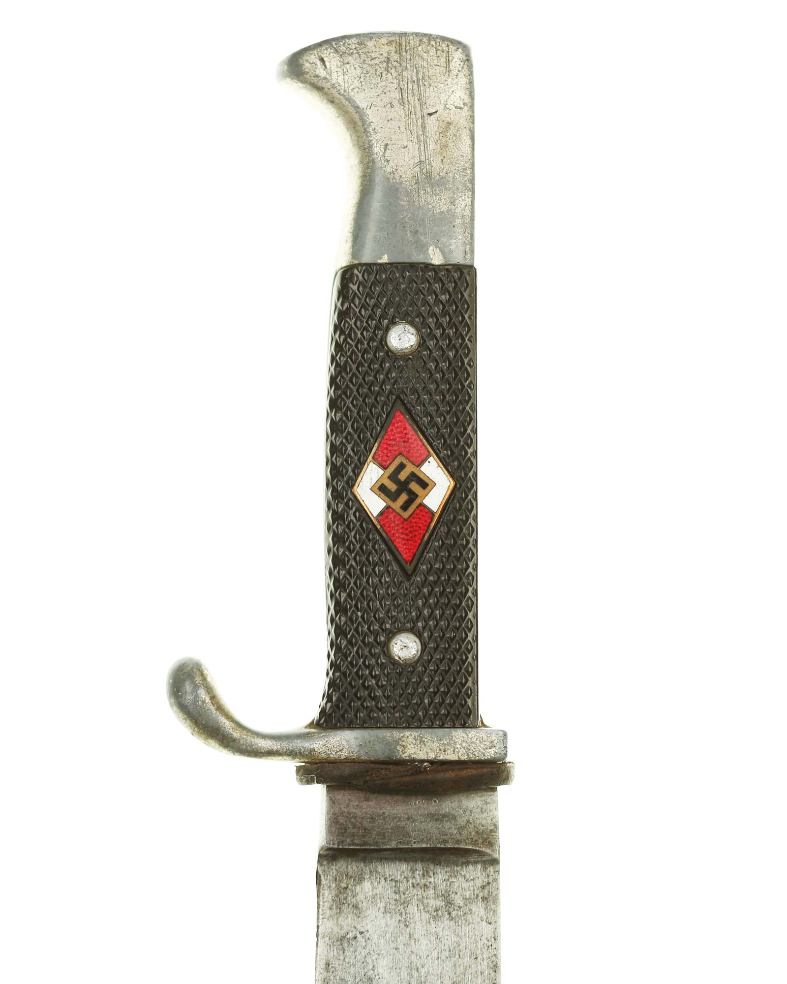 This Hitler Youth Knife, Model 1936-1938 [Mid-period]. The total length is 25,4 cm. The Knife has the RZM maker mark on the blade: RZM M7/32 (Rob. Müller Sol.-Merscheid).