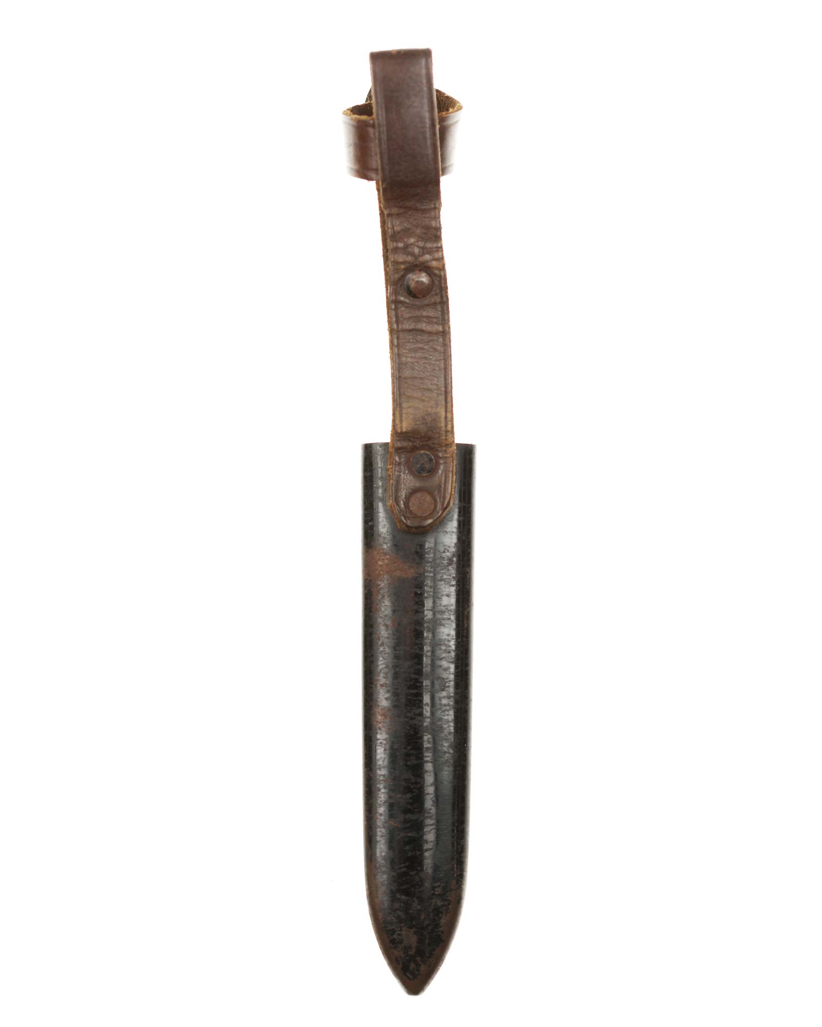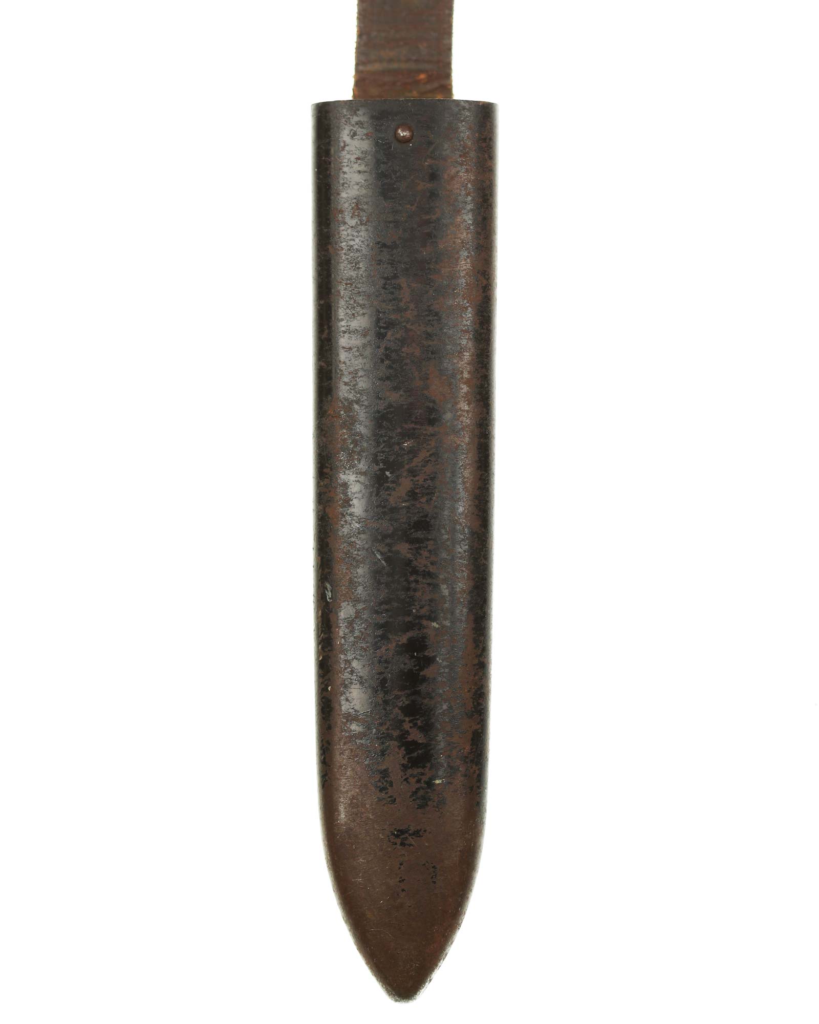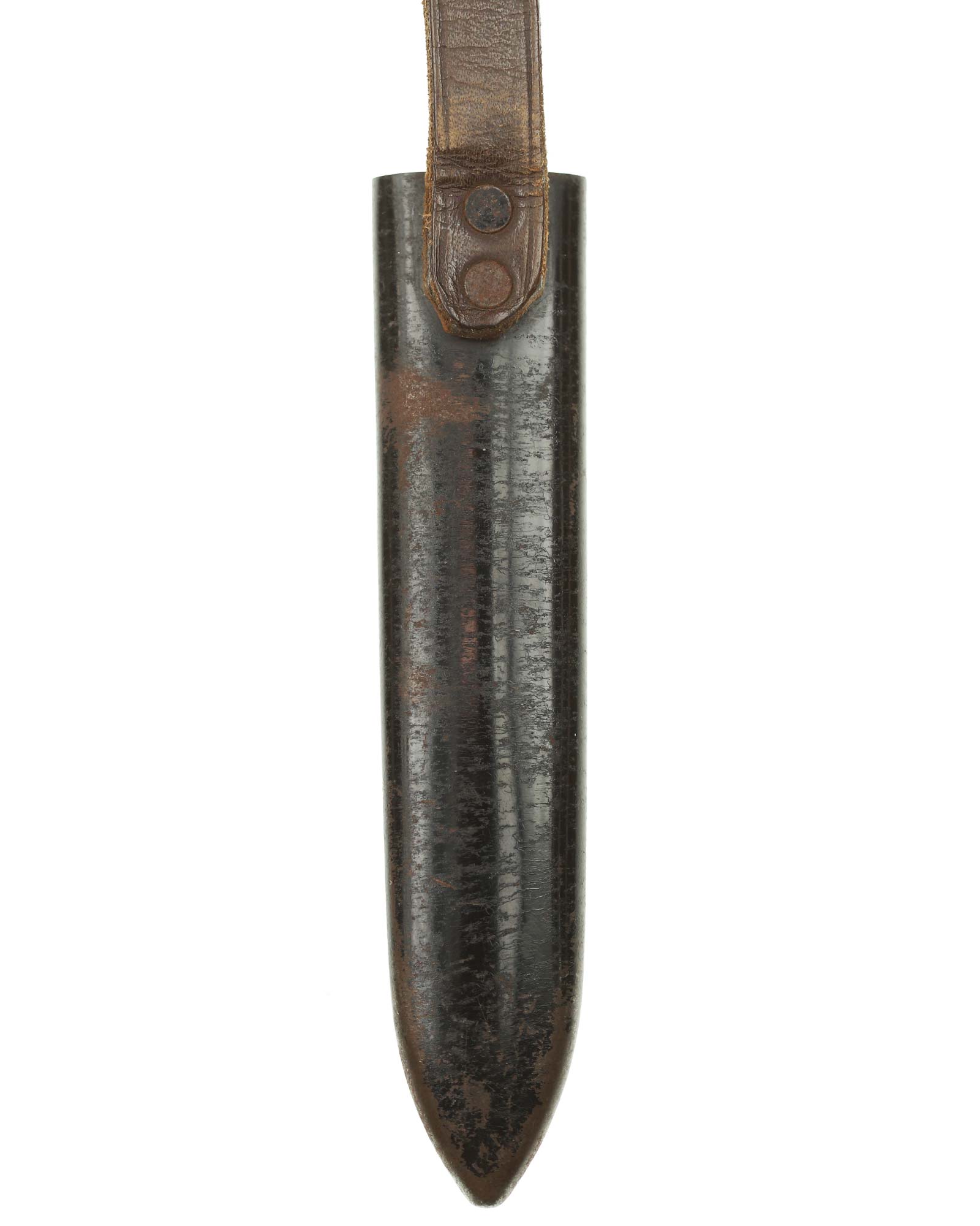 Scabbard: The scabbard shell has good, black paint. This paint has a few mild age spots spread evenly throughout the surface. Attached to the scabbard is an excellent leather hanger.