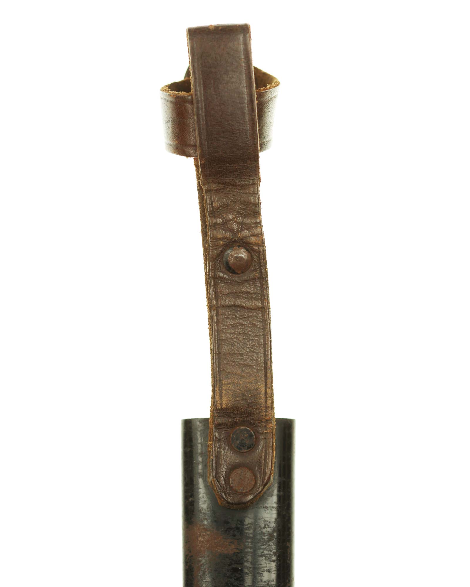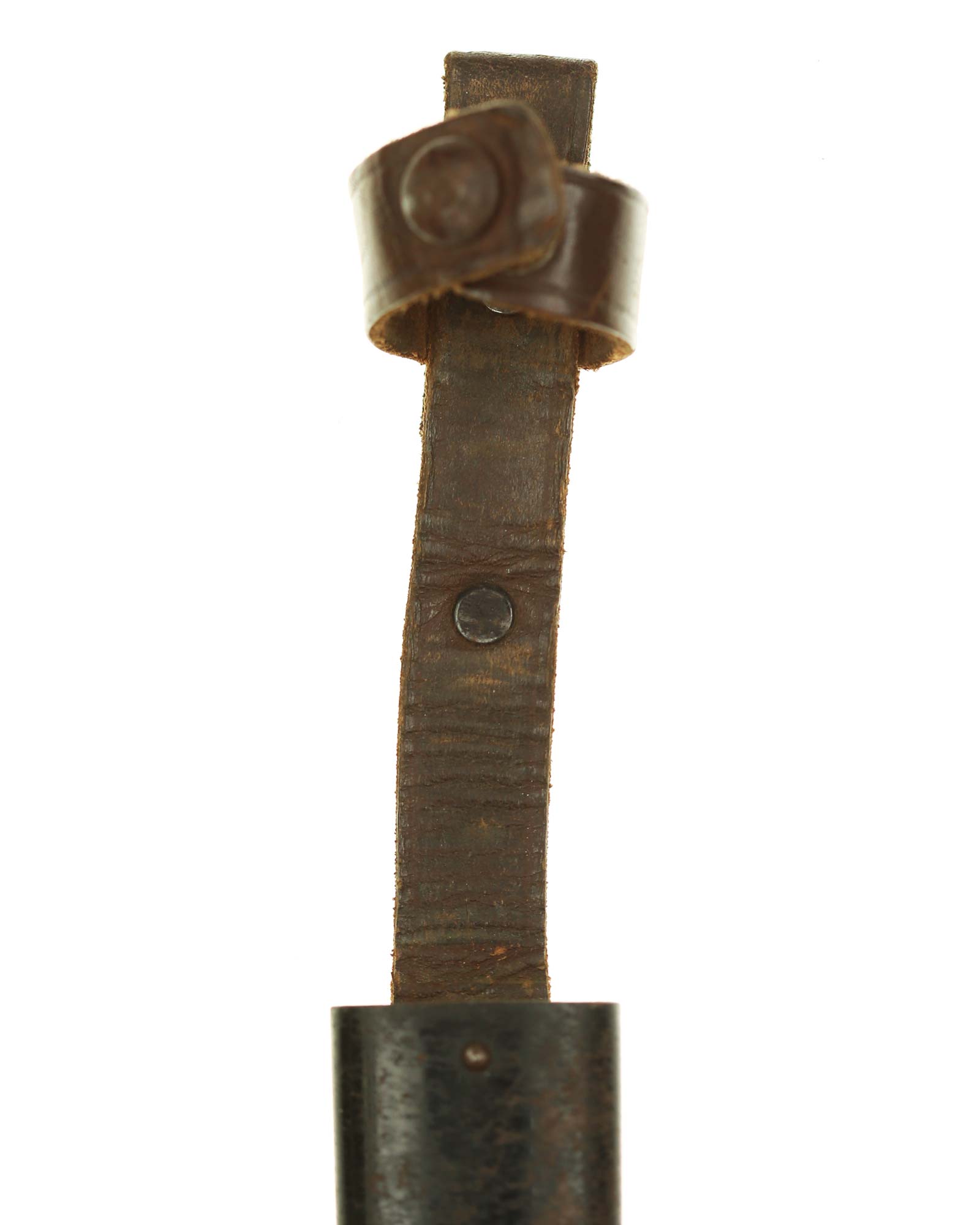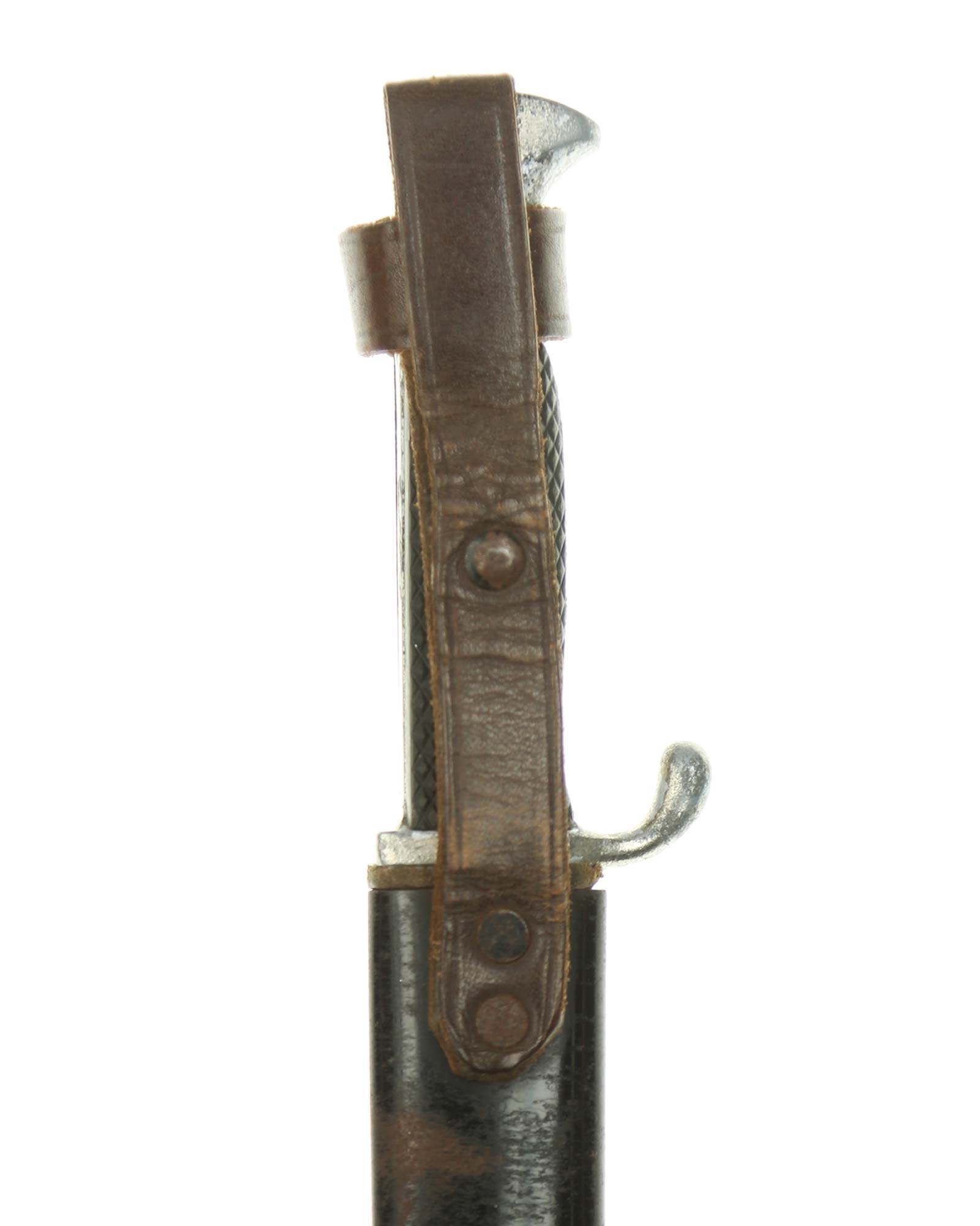 Scabbard: The scabbard shell has good, black paint. This paint has a few mild age spots spread evenly throughout the surface. Attached to the scabbard is an excellent leather hanger.