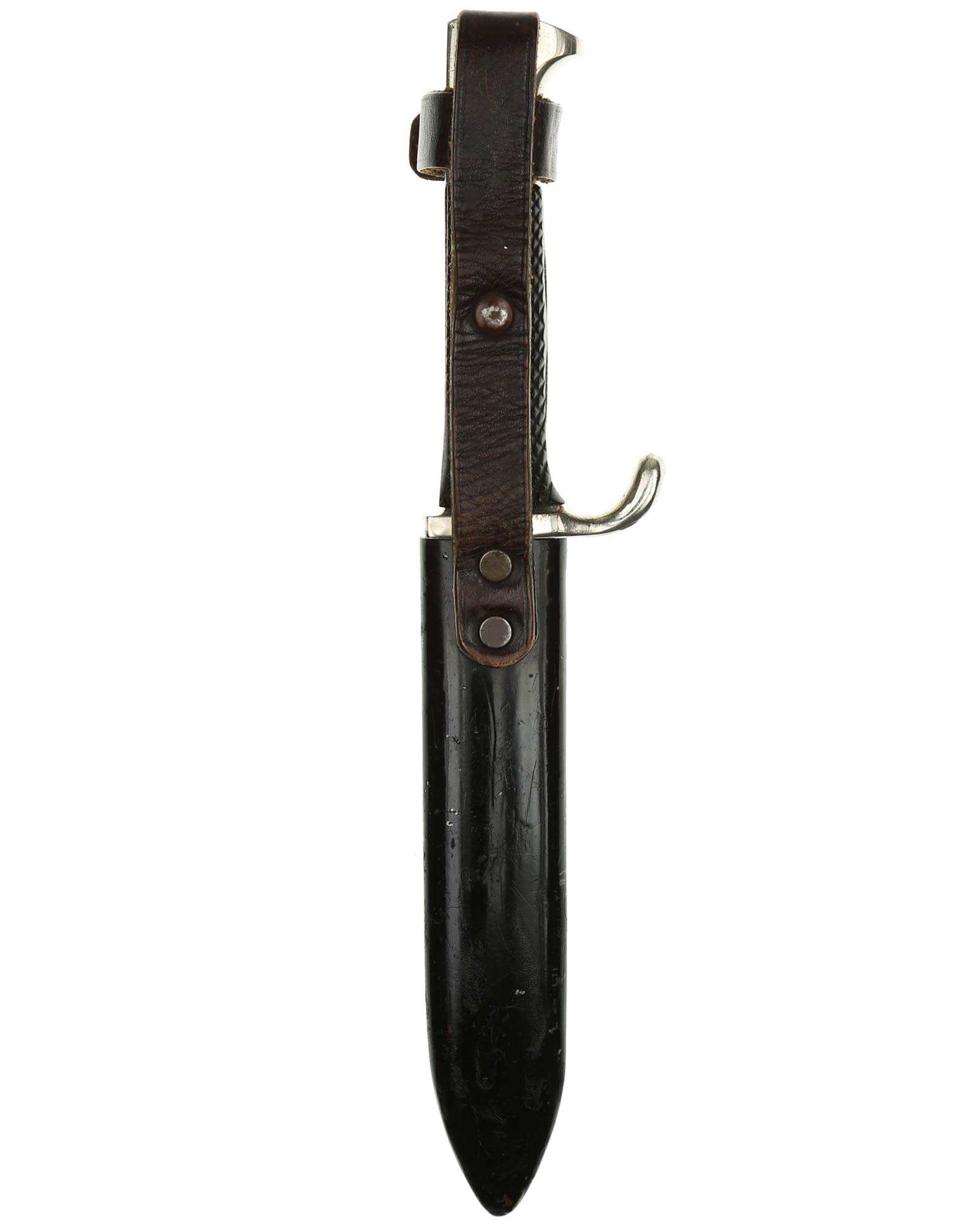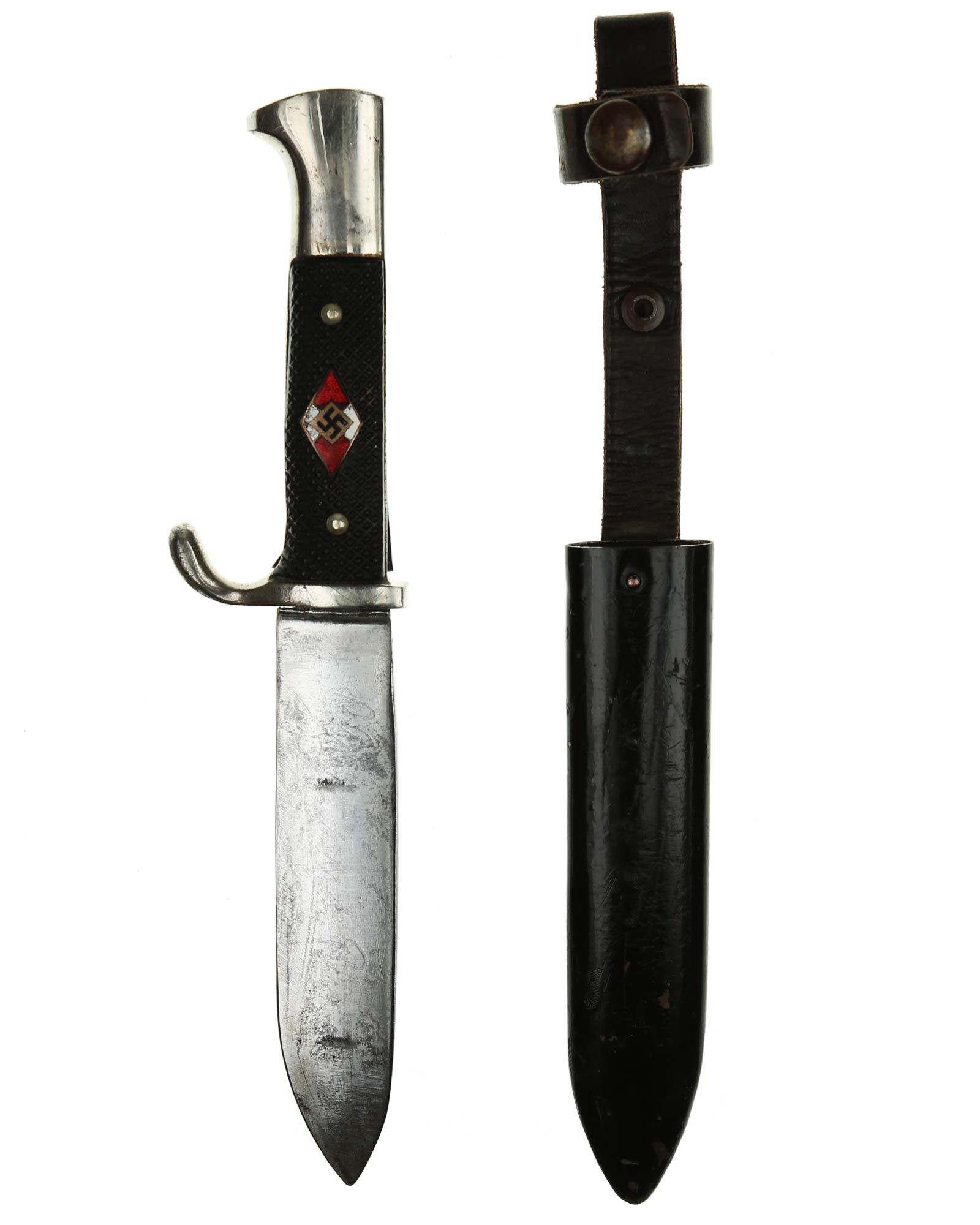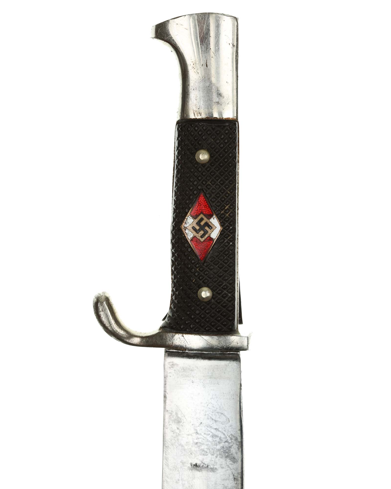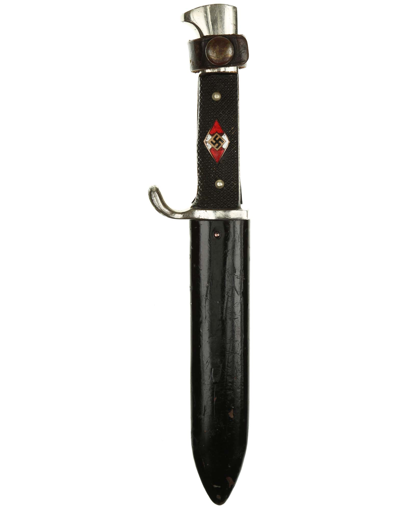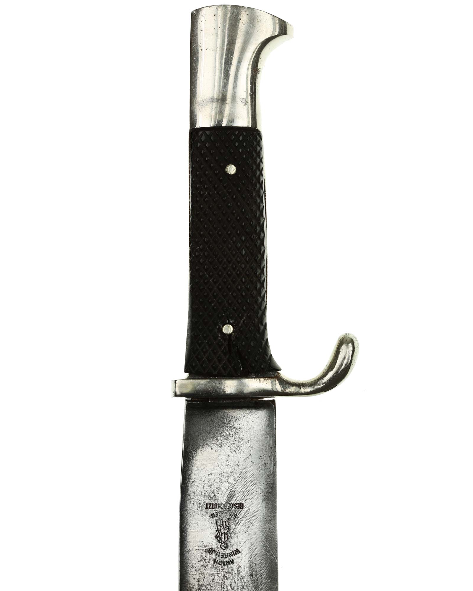 This Hitler Youth Knife is with Motto, shows some age. Model 1933-1935 [Early-period]. The total length is 25,5 cm. The Knife has the maker mark on the blade: Anton Wingen Jr. Solingen.