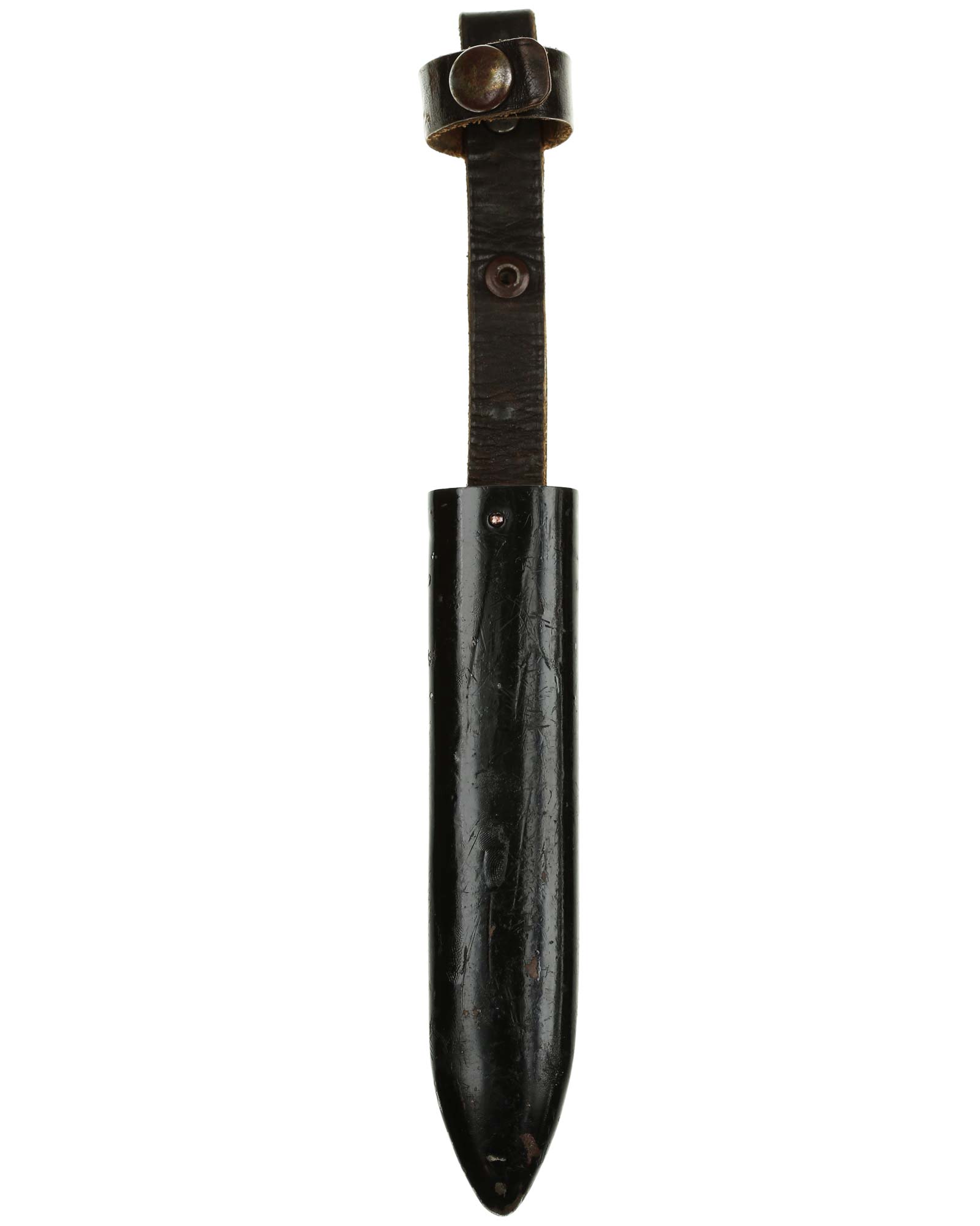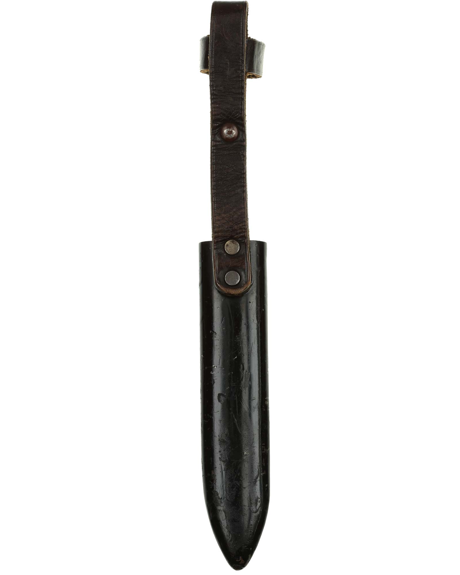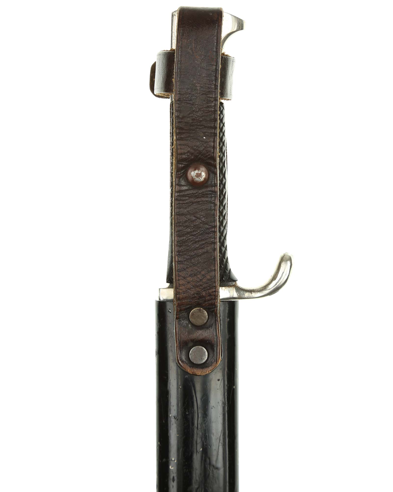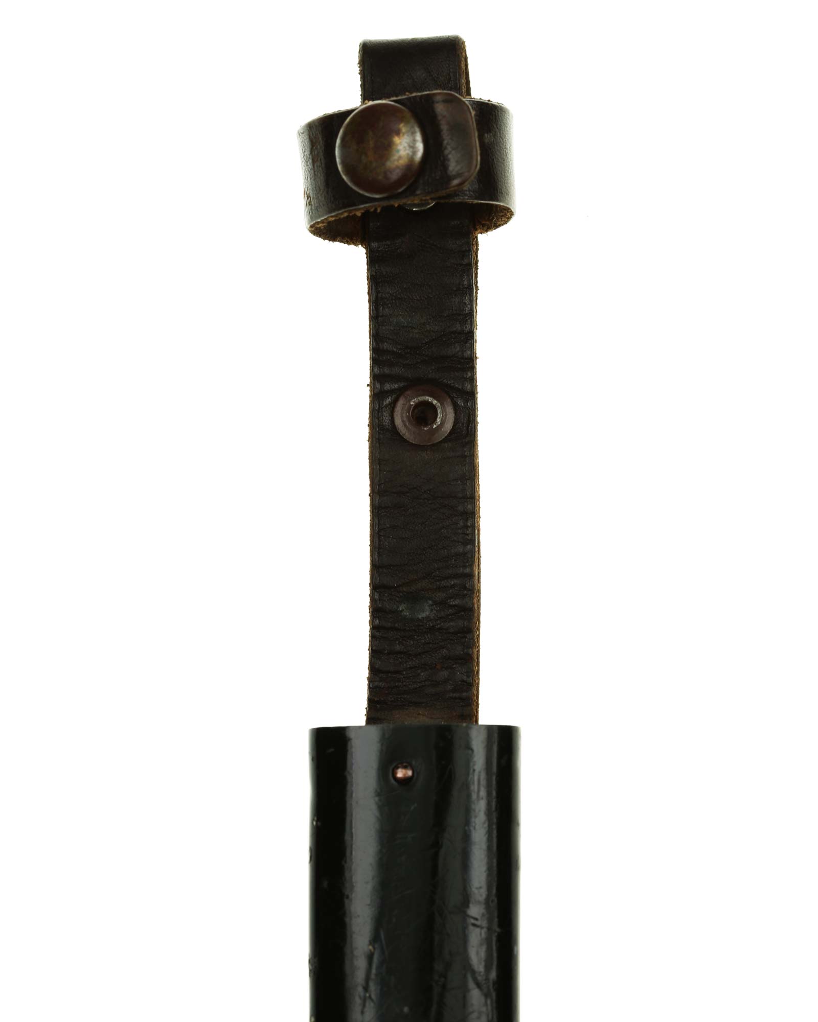Scabbard: The scabbard shell has good, black paint. This paint has a few mild age spots spread evenly throughout the surface. Attached to the scabbard is an excellent leather hanger.