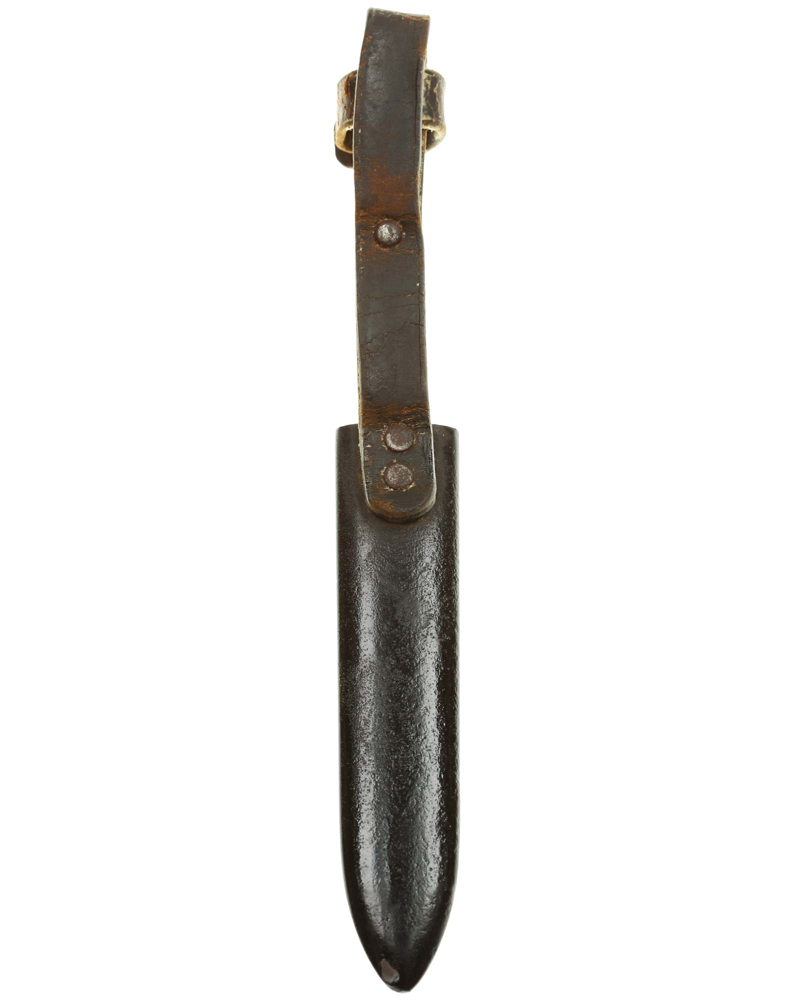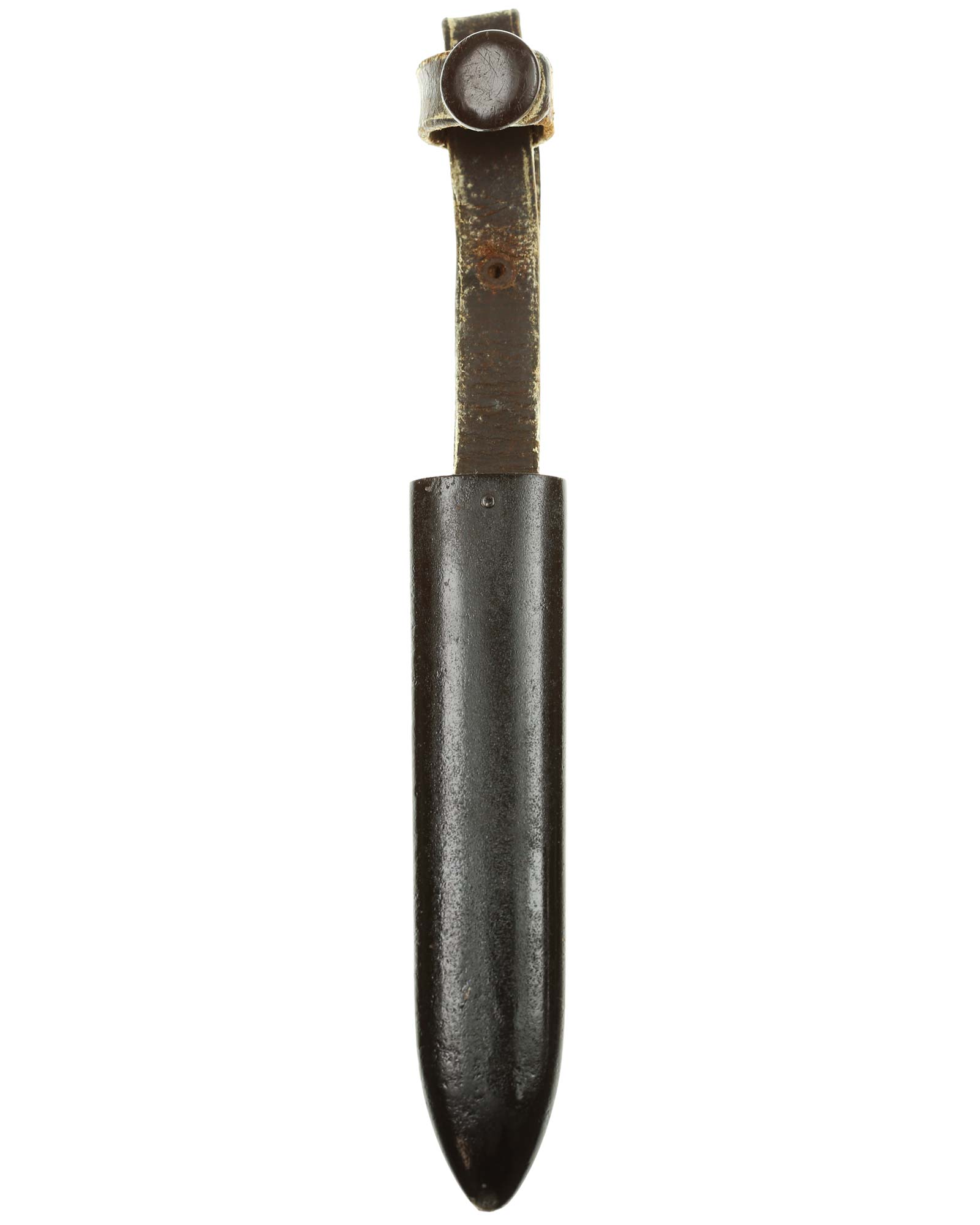 Scabbard: The scabbard shell has good, black paint. This paint has a few mild age spots spread evenly throughout the surface. Attached to the scabbard is an excellent leather hanger.