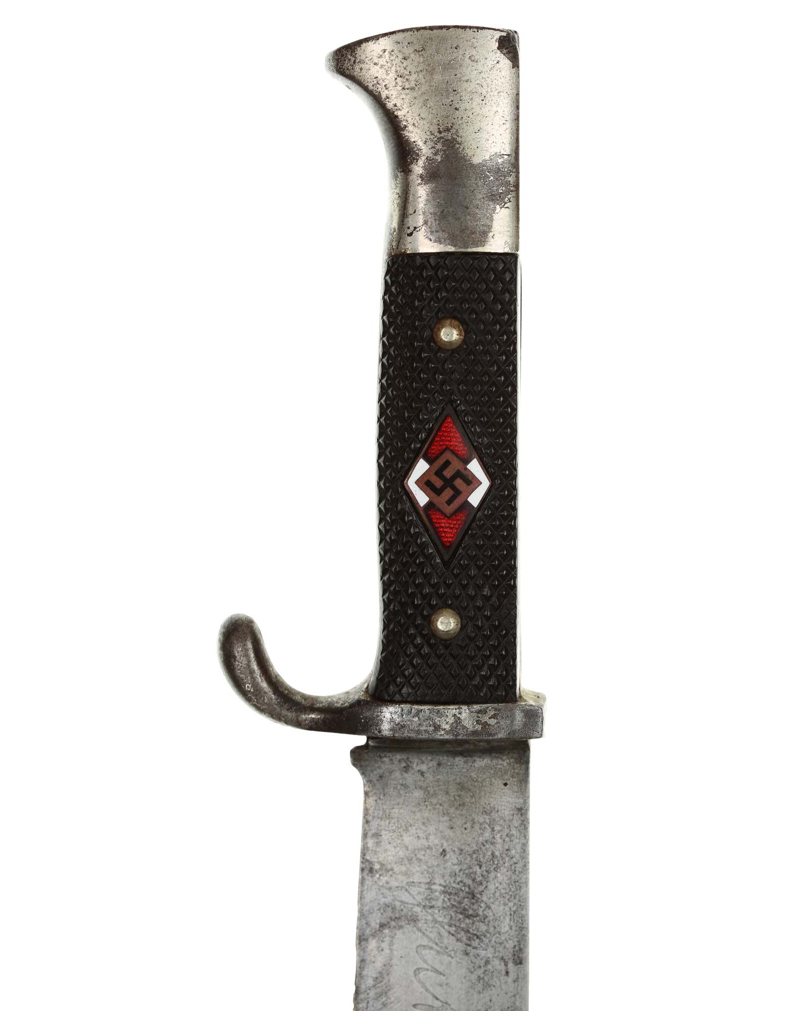 Grip: The grip plates are the early, finely checkered Bakelite type. They are in good condition, being retained by nickel rivets with dressed obverse heads. The enamel HJ insignia is in perfect condition throughout.