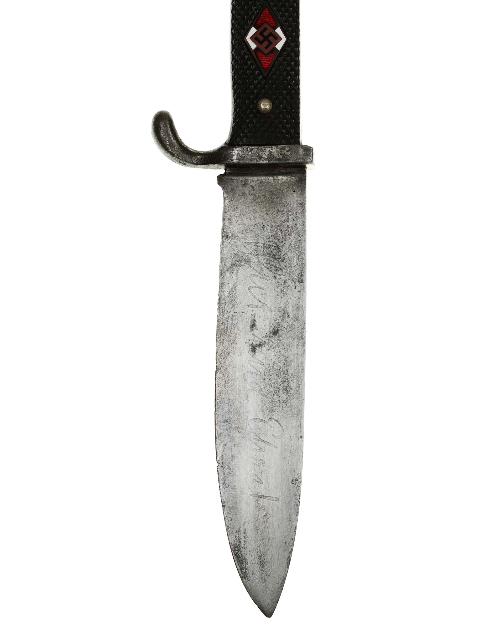 This Hitler Youth Knife is with Motto, shows some age. Model 1933-1935 [Early-period]. The total length is 25,5 cm. The Knife has the maker mark on the blade: Carl Schmidt Solingen.